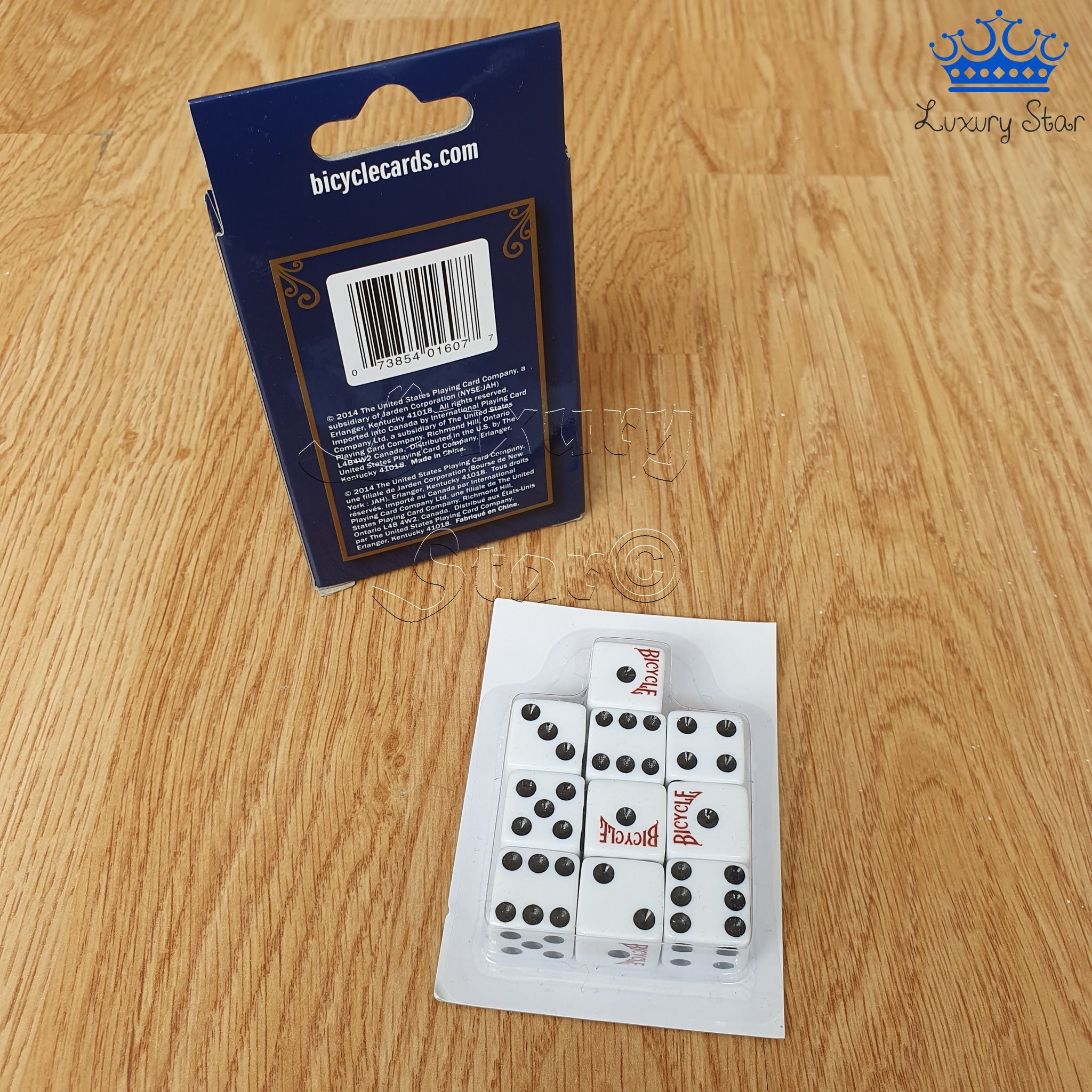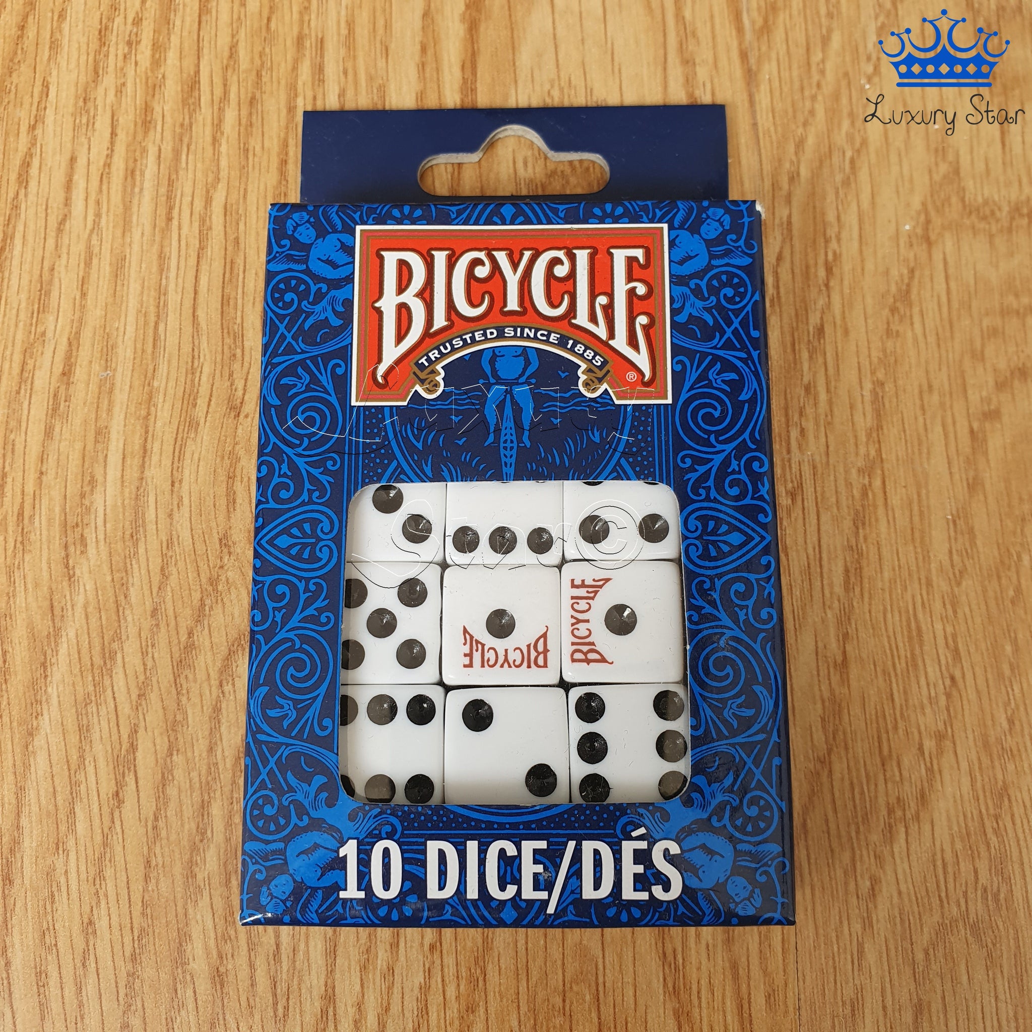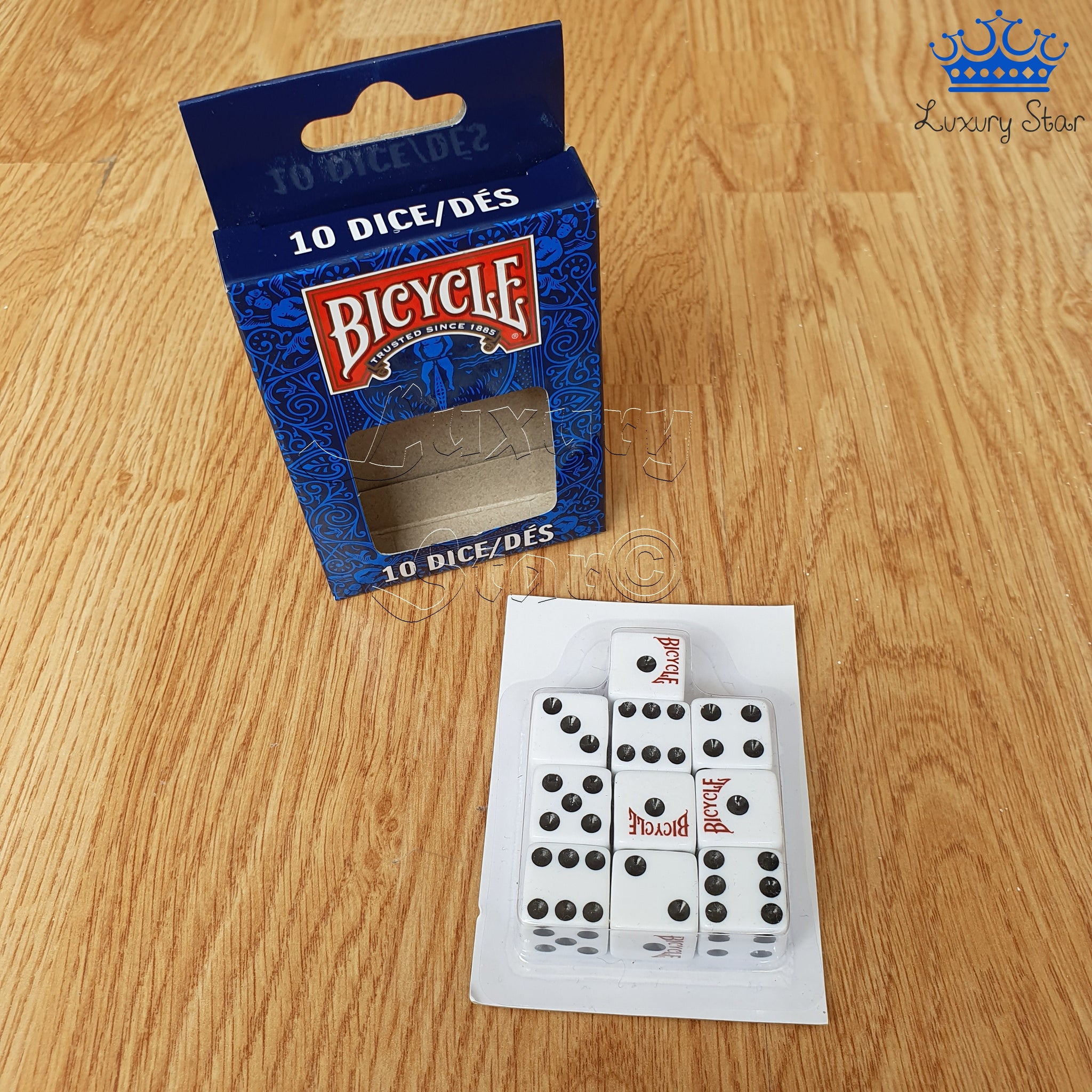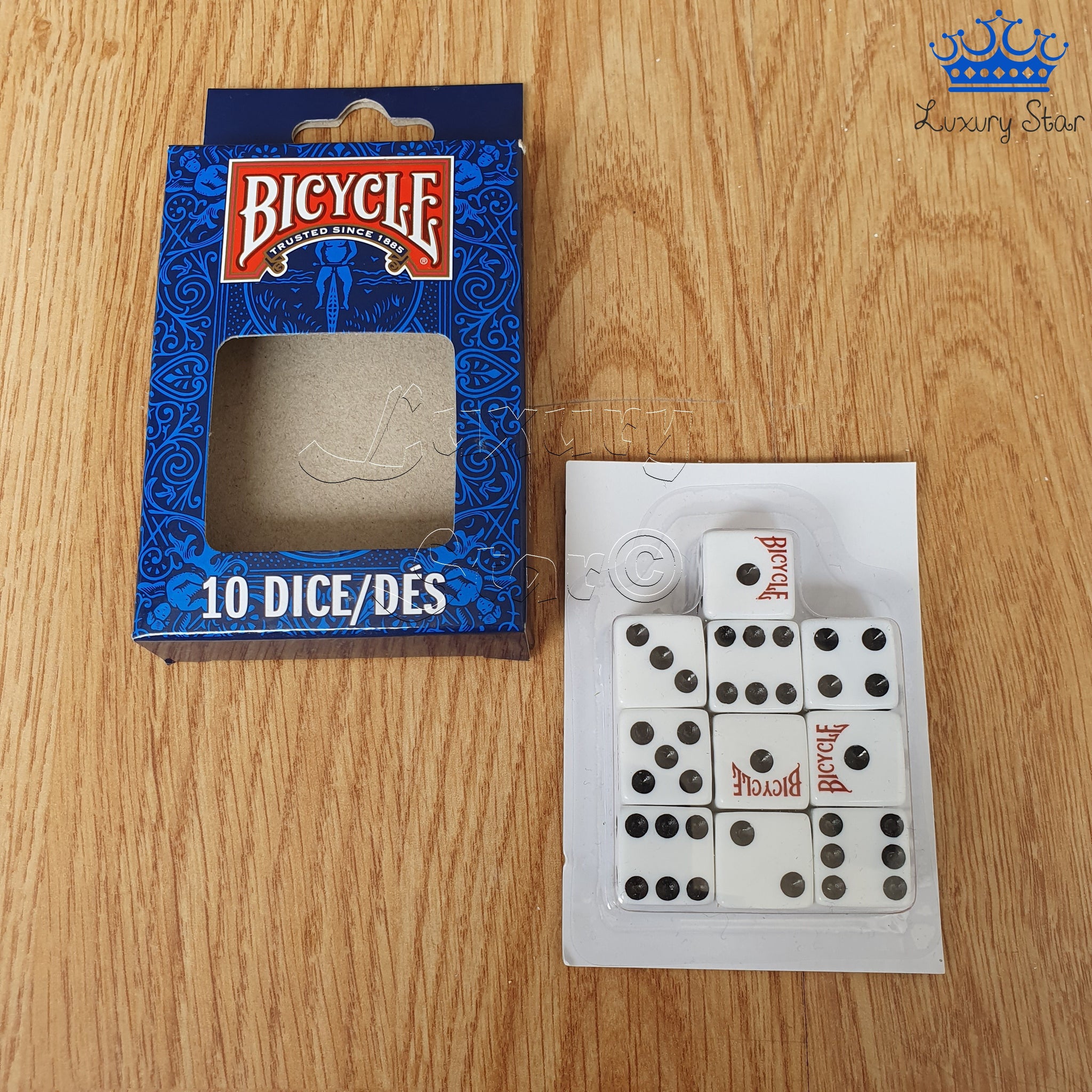 La marca Bicycle se caracteriza por su alta calidad y diseño en juegos de naipes y barajas, en esta ocasión nos traen un set x10 dados tradicionales blancos fabricados en plástico de muy buena calidad, con el diseño de puntos negros, cada dado tiene la marca Bicycle en color Rojo ladrillo, lo que hace que estos dados sean únicos; perfectos para cualquier juego de naipes o póker con tus amigos y armes la colección Bicycle de tus juegos de mesa favoritos.