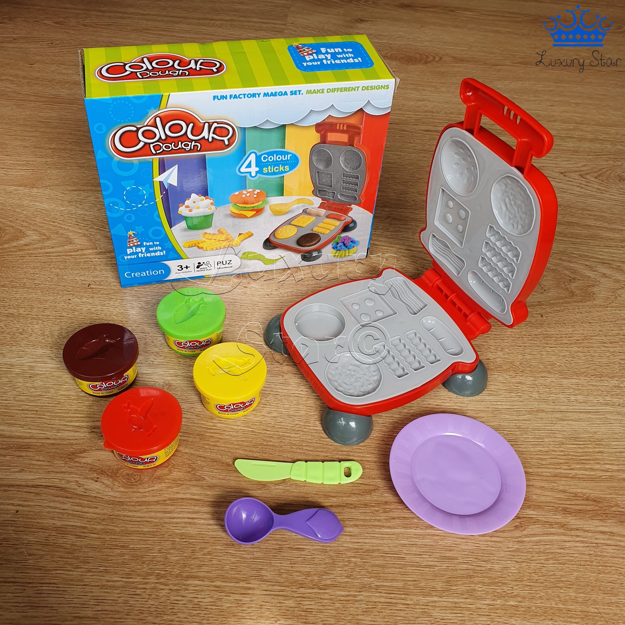 El set Colour Dough de Comida Rapida incluye 4 recipientes de colores junto con diferentes accesorios para que puedas combinarlos y crear todo tipo de comidas rápidas, desde hamburguesas, huevos, verduras hasta Hot Dogs.