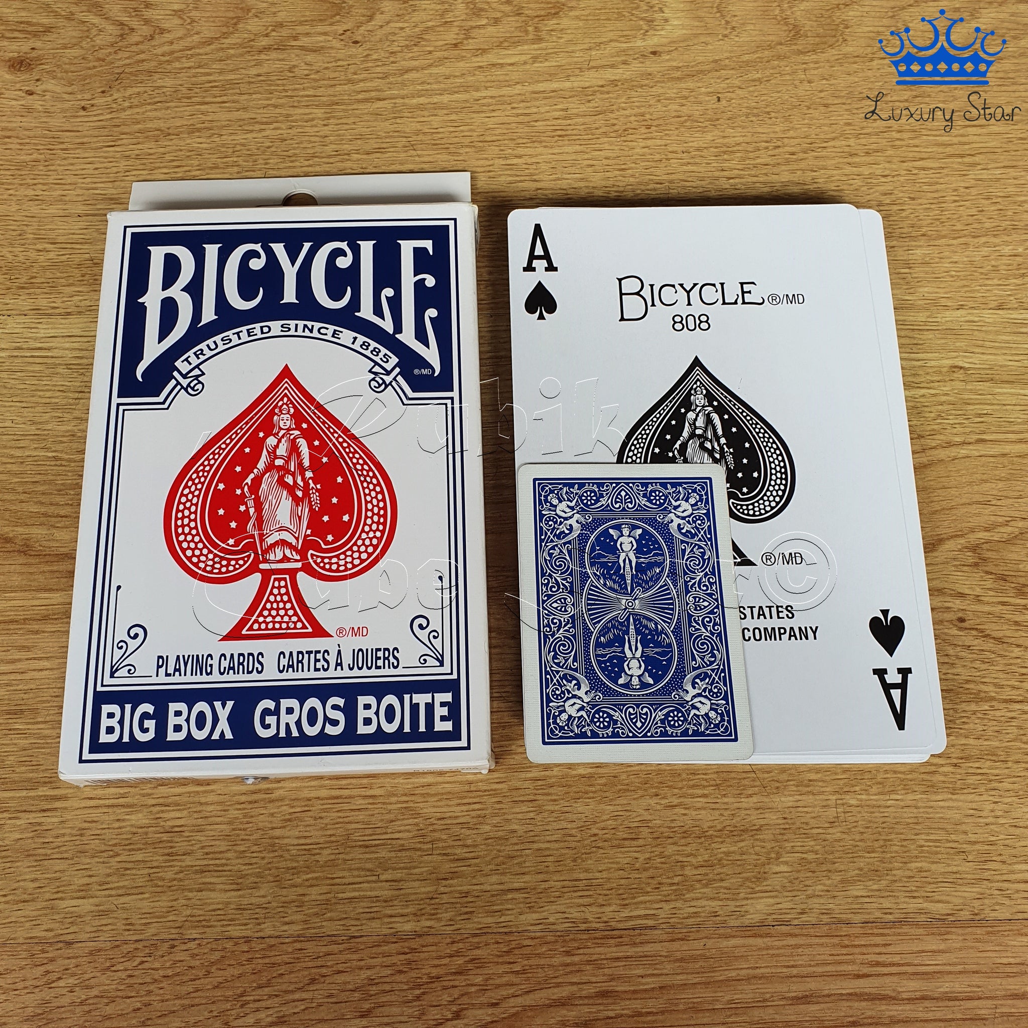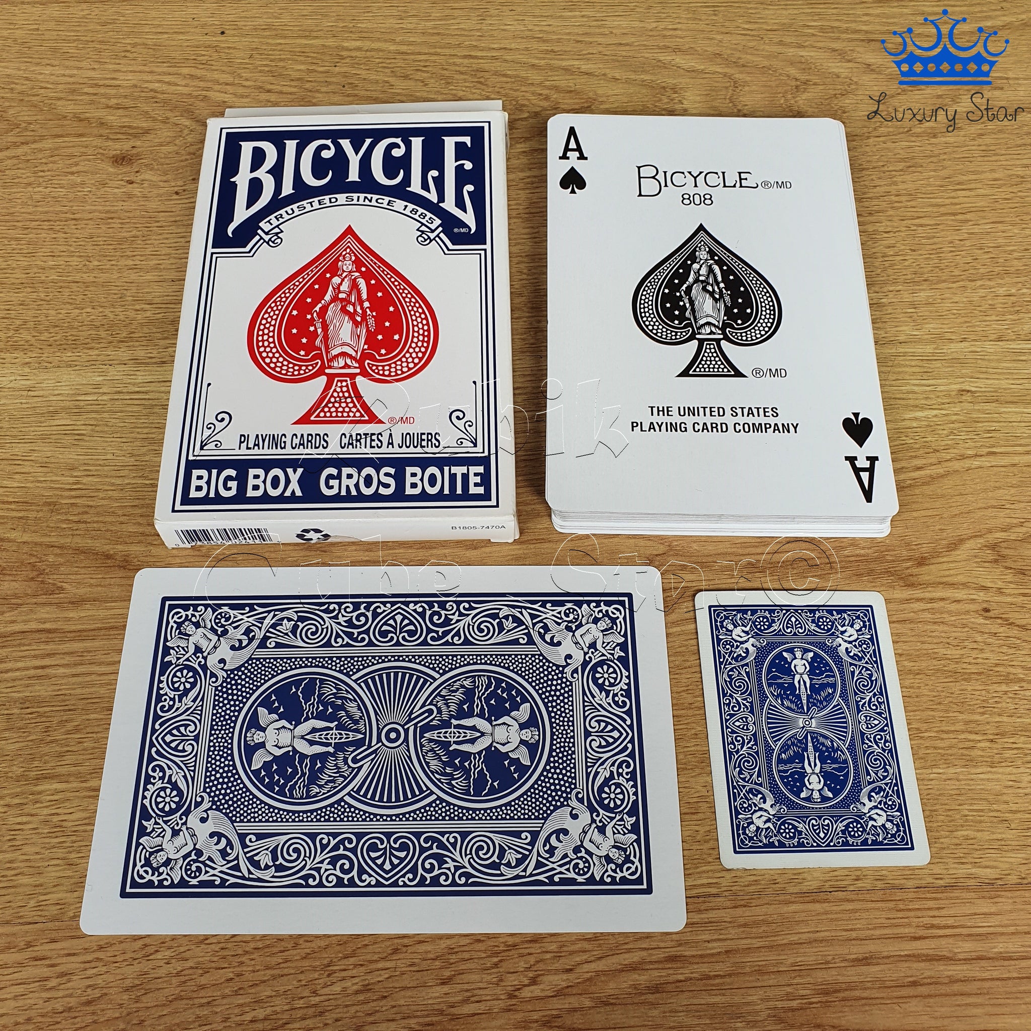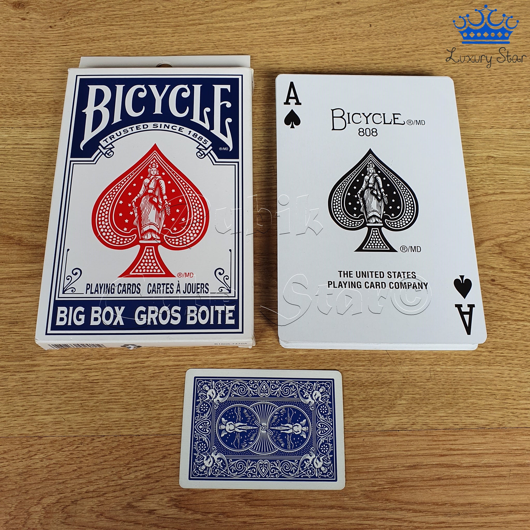 La marca Bicycle se caracteriza por manejar Cartas de excelente calidad, con diferentes diseños y funcionalidades. Son utilizadas por su alta calidad, su precio accesible y su textura Smooth finish (acabado liso), ideal para una menor adherencia y mayor duración.Las cartas Bicycle Big Box son utilizadas por profesionales para Cartomagia, Poker, juegos de destreza y todo tipo de juegos de mesa. La Baraja Big Box cuenta con un diseño de Ciclas en forma Simétrica en su dorso. Se destaca por su gran tamaño que equivale a 4 cartas tamaño standard, midiendo 17.7 cm de largo por 11.4 cm de ancho, por lo que se puede utilizar para Shows y abarcar un gran público situado a distancias lejanas.