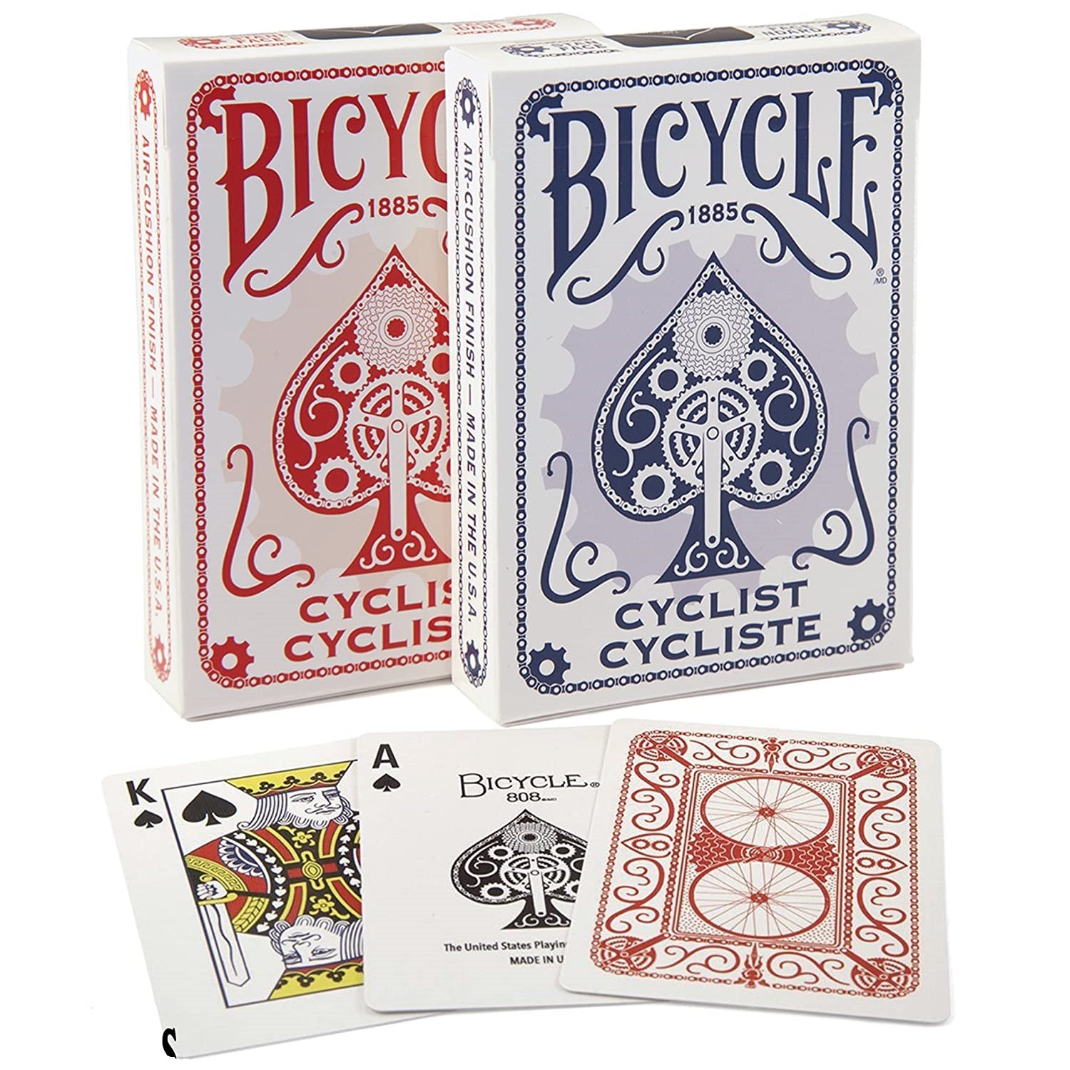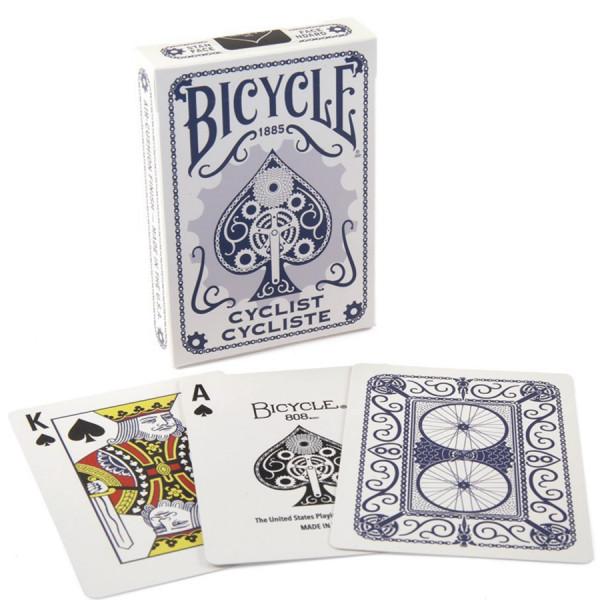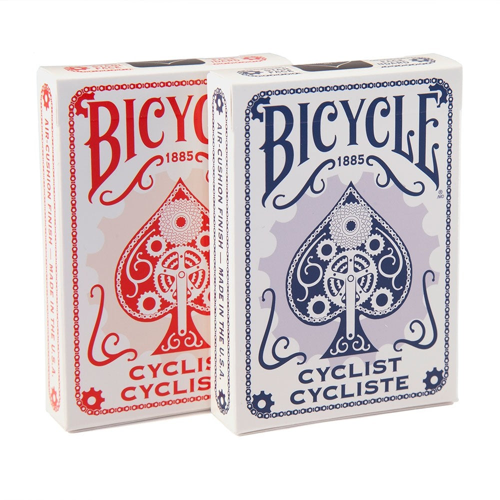La marca Bicycle se caracteriza por manejar Cartas de excelente calidad, con diferentes diseños y funcionalidades. Su nombre proviene del año 1885 por ser las Bicicletas el transporte más atractivo de la época . Las cartas Bicycle son utilizadas por profesionales para Cartomagia, Poker, juego de destreza, juegos de mesa y por su alta calidad, su precio accesible y su textura Air Cushion (Tramado con aspecto de tela o nylon), ideal para un mejor agarre y mayor duración.La Baraja Cyclits de Bicycle tienen un diseño blanco Standard, el dorso de la baraja viene en dos presentaciones: color azul y color rojo que cuenta con la ilustración de dos ruedas de bicicletas con sus engranajes y cadenas.