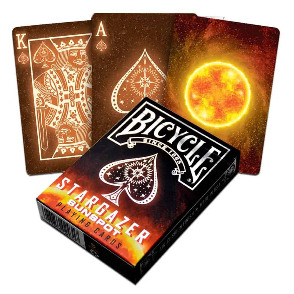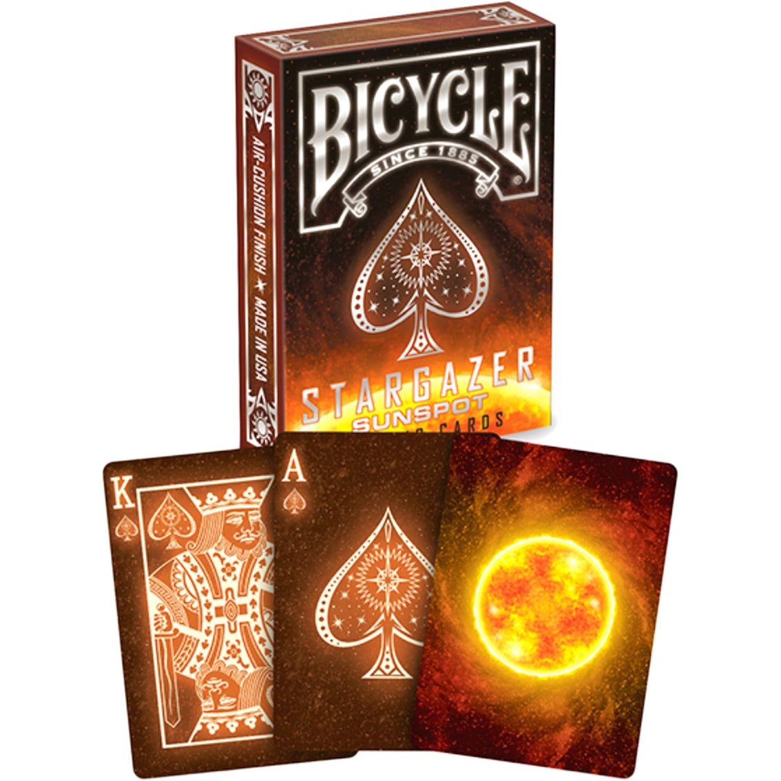 La marca Bicycle se caracteriza por manejar cartas de excelente calidad, con diferentes diseños y funcionalidades. Es utilizada por su alta calidad, su precio accesible y su textura Air Cushion (Tramado con aspecto de tela o nylon), ideal para un mejor agarre y mayor duración. Las cartas Bicycle Stargazer Sunspot son utilizadas por profesionales para Poker, Cardistry, juego de destreza y todo tipo de juegos de mesa. La Baraja Stargazer Sunspot de Bicycle tiene el diseño muy exclusivo del Sistema Solar, cuenta con elegantes y llamativos diseños, lo que las hace coleccionables.