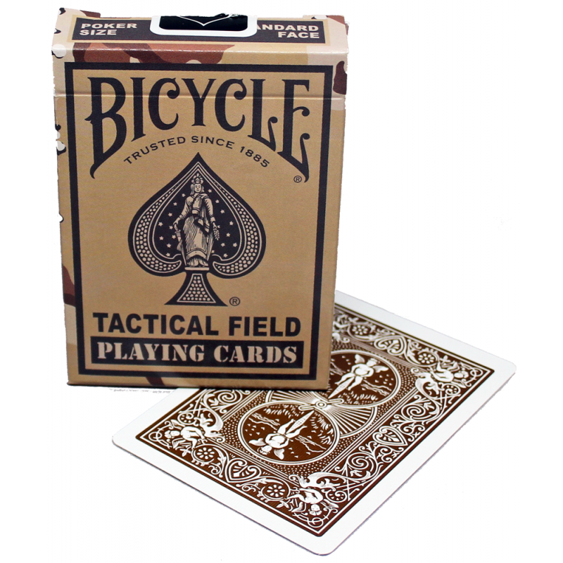La marca Bicycle se caracteriza por manejar cartas de excelente calidad, con diferentes diseños y funcionalidades. Es utilizada por su alta calidad, su precio accesible y su textura Air Cushion (Tramado con aspecto de tela o nylon), ideal para un mejor agarre y mayor duración. Las cartas Bicycle son utilizadas por profesionales para Poker, juego de destreza y todo tipo de juegos de mesa.La Baraja Tactical Field de Bicycle tiene un modelo exclusivo ya que viene impresa con los colores de camuflaje de uso militar, cuenta con elegantes y llamativos diseños, lo que las hace coleccionables. El color del dorso de la baraja es verde o marrón con el diseño tradicional de la marca Bicycle, la cara principal es color Blanco y sus indices de color negro y rojo. La Baraja contiene 1 carta de colección y una carta gaff para trucos y magias.