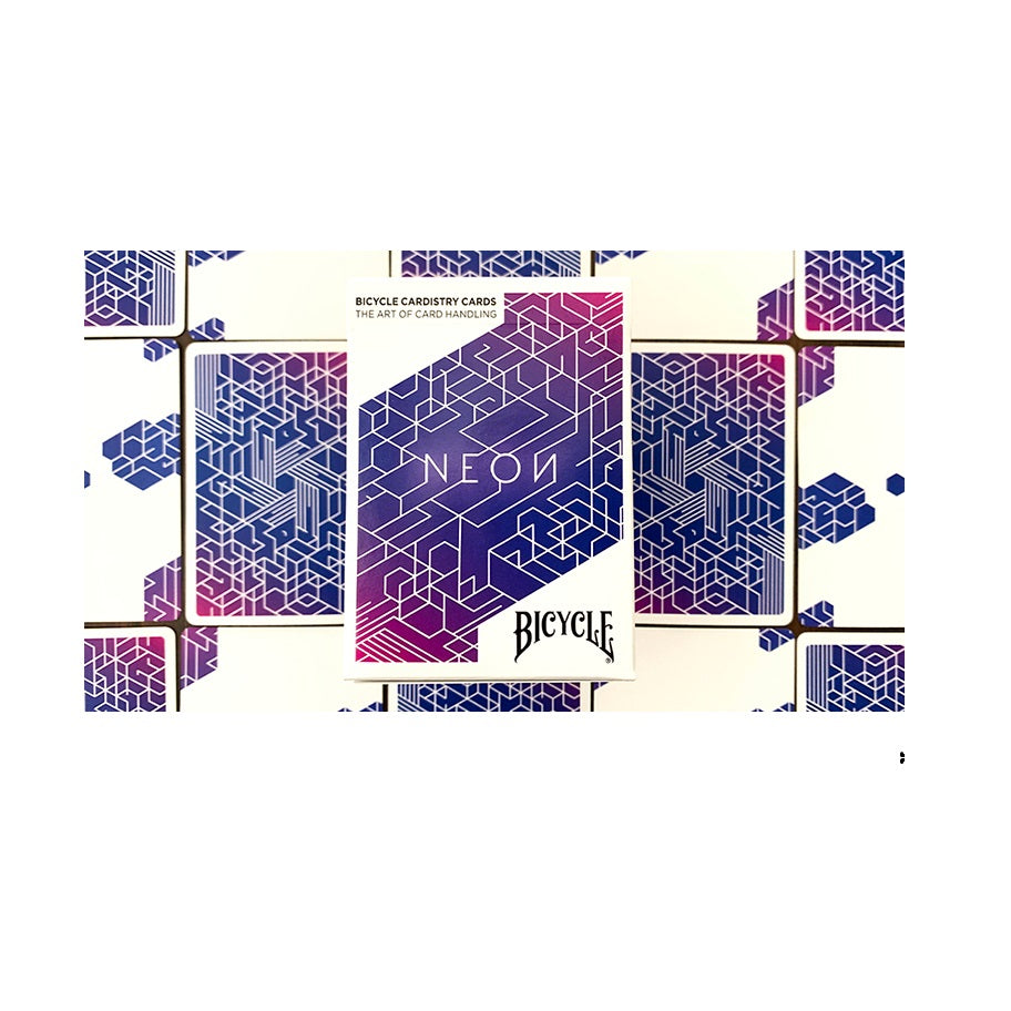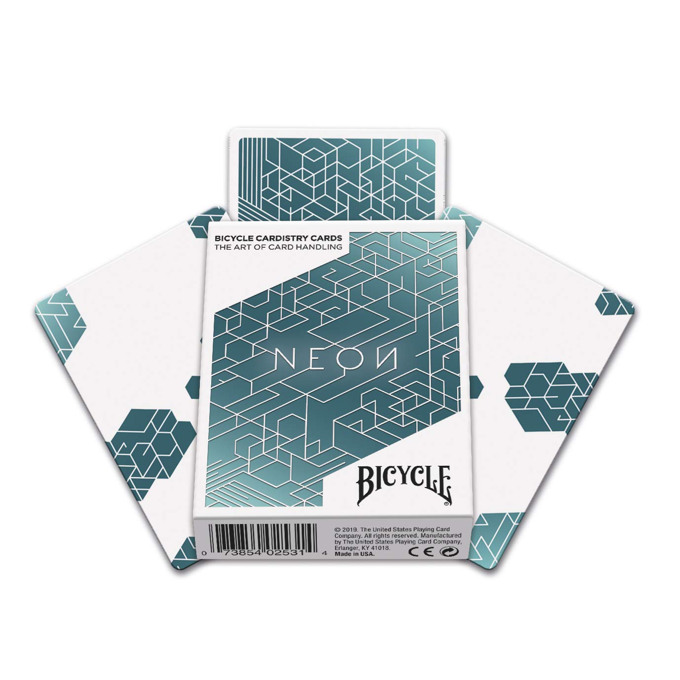 Las cartas Bicycle Neon son utilizadas por profesionales para Cardistry (Habilidades artísticas) , Florituras (Movimiento de Cartas), juego de destreza y todo tipo de juegos de mesa. Cuenta con elegantes y llamativos diseños, lo que las hace coleccionables. La Baraja Bicycle Neon cuenta con un diseño de figuras y un degradado blanco con azul verdoso metalizado simétrico en su dorso.