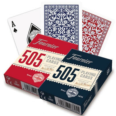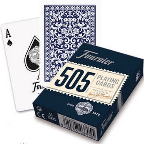 La marca Fournier se caracteriza por manejar Cartas de excelente calidad, con diferentes diseños y funcionalidades. Fueron llamadas por un hecho histórico muy importante, es utilizada por su alta calidad, su precio accesible y su textura, ideal para un mejor agarre y mayor duración. La Calidad Fournier se fundamenta en una exclusiva selección de materias primas y un proceso de fabricación dotado de estrictos controles de calidad que dan como resultado un producto único.La baraja 505 es una impresión impecable libre de defectos o marcas con una recubrimiento de barniz; fórmula exclusiva que garantiza el deslizamiento preciso. La cara principal es standard y cada carta tiene una marca de Fournier lo que las hace exclusivas, el As de Picas trae en su centro la marca de Fournier y cuenta con un dorso color azul o rojo con un diseño simétrico de tribales y flores.
