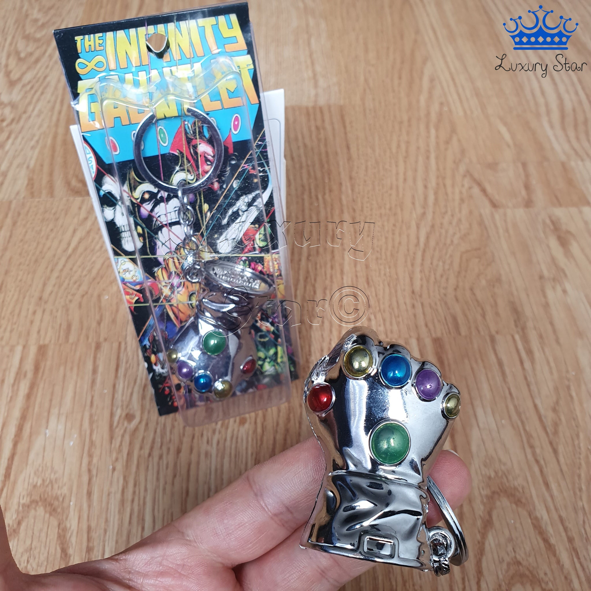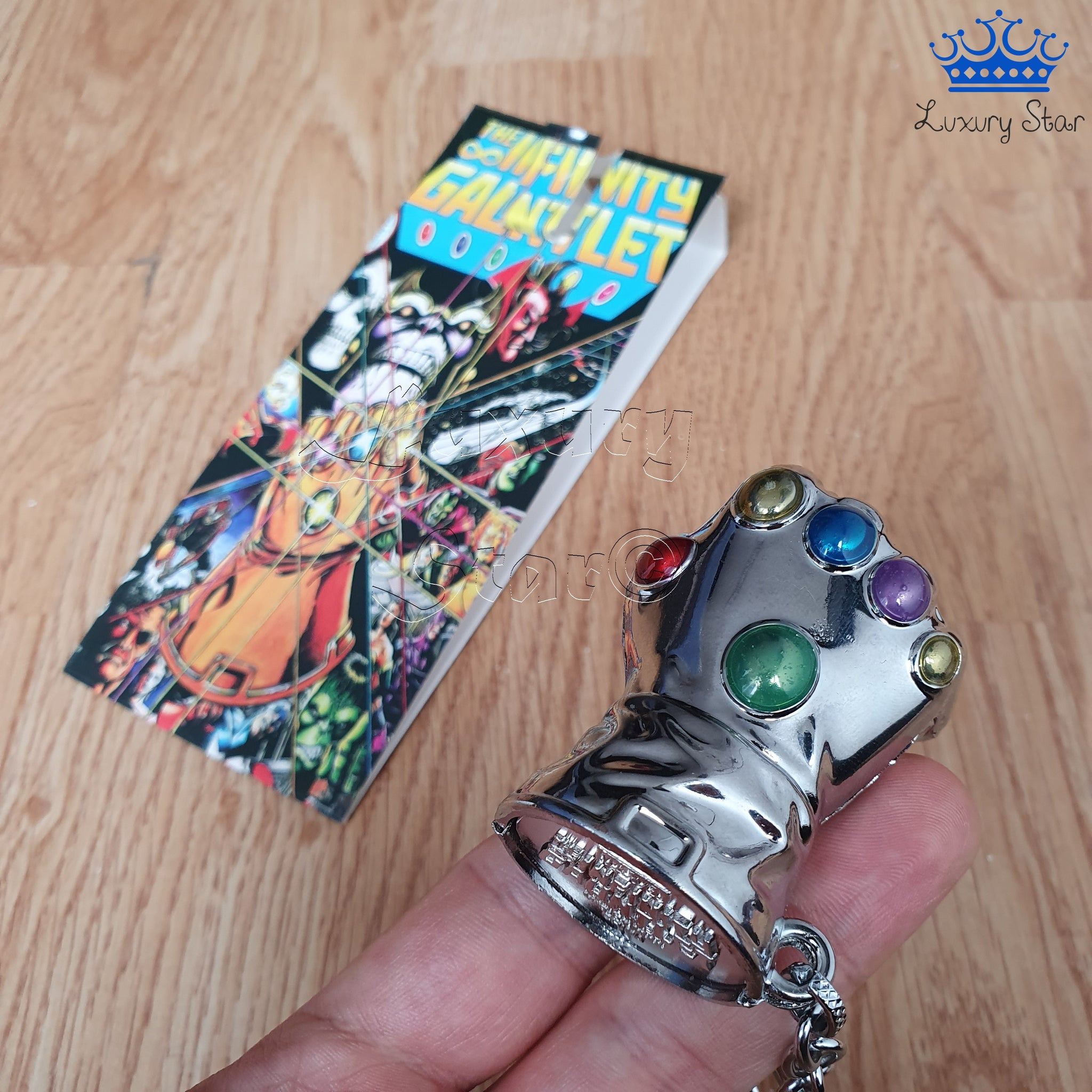 Hermoso llavero de Super Heroes de Acción, ten en tu poder el Guante con las Gemas del Infinito en un elegante llavero metalico con excelentes acabados.