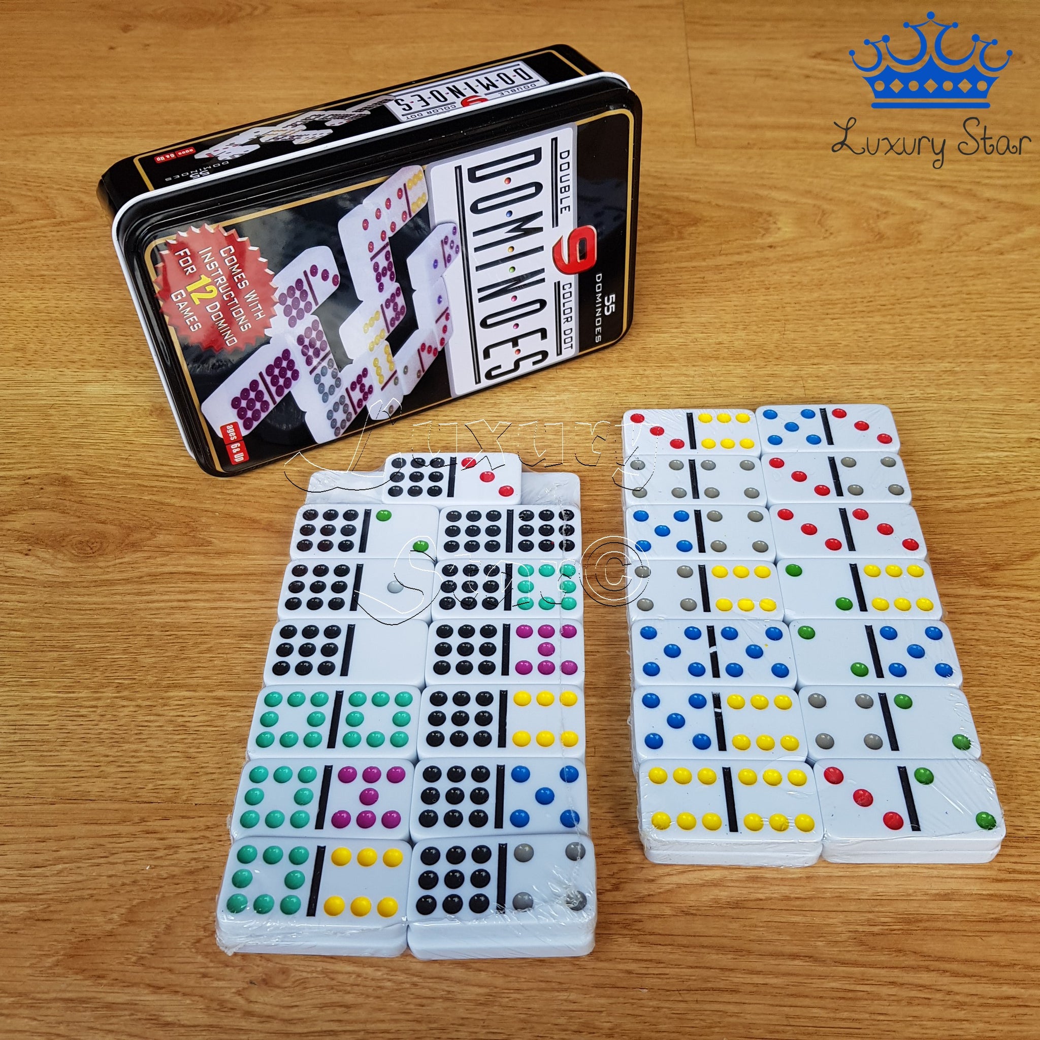 Hermoso Juego dominó de 55 Fichas con estuche metálico de fácil almacenamiento y piezas de excelente acabados. Cada ficha esta hecha de material resistente como lo es la Melamina su color es blanco y sus pintas son multicolores.