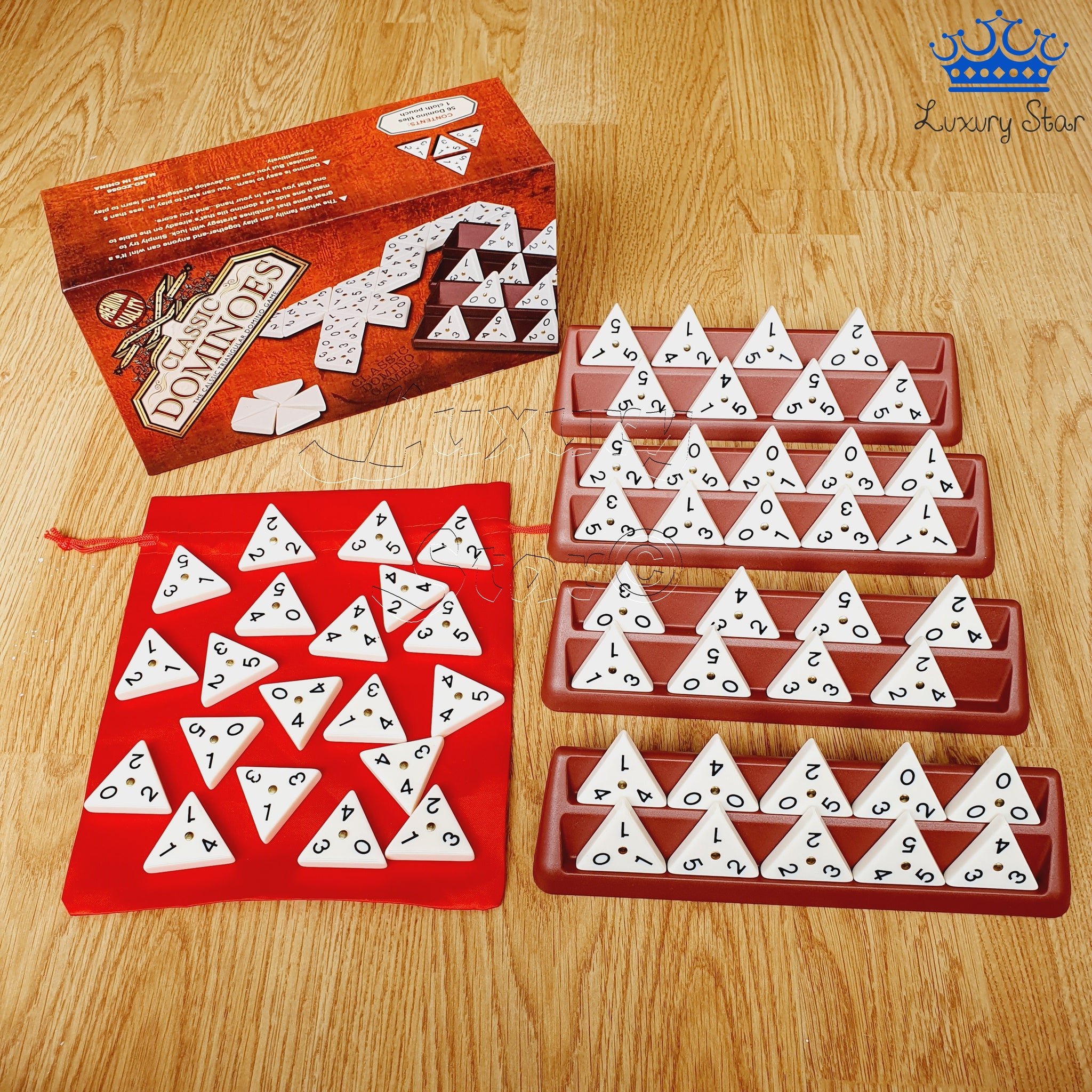 Incluye: 1 juego Tri Dominó con 56 fichas, 4 soportes plásticos, bolsa de tela y caja de lujo