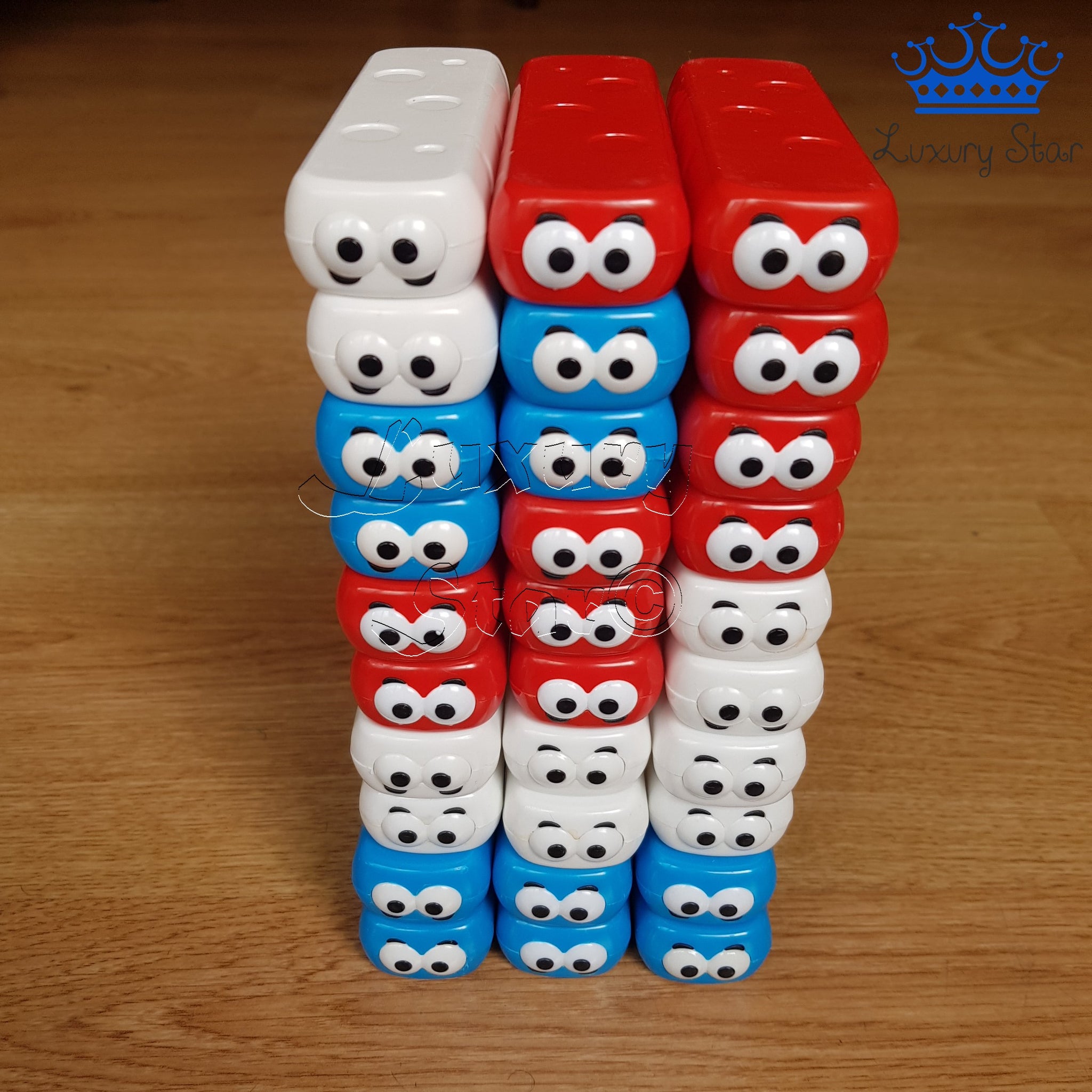 En esta ocasión los bloques de Apilar vienen en 3 increíbles colores: blanco, azul y rojo y tiene un diseño muy llamativo con un par de ojos en sus extremos, ideal para todos los niños o personas que quiera compartir un rato en familia o con sus amigos jugando este increíble juego de mesa.