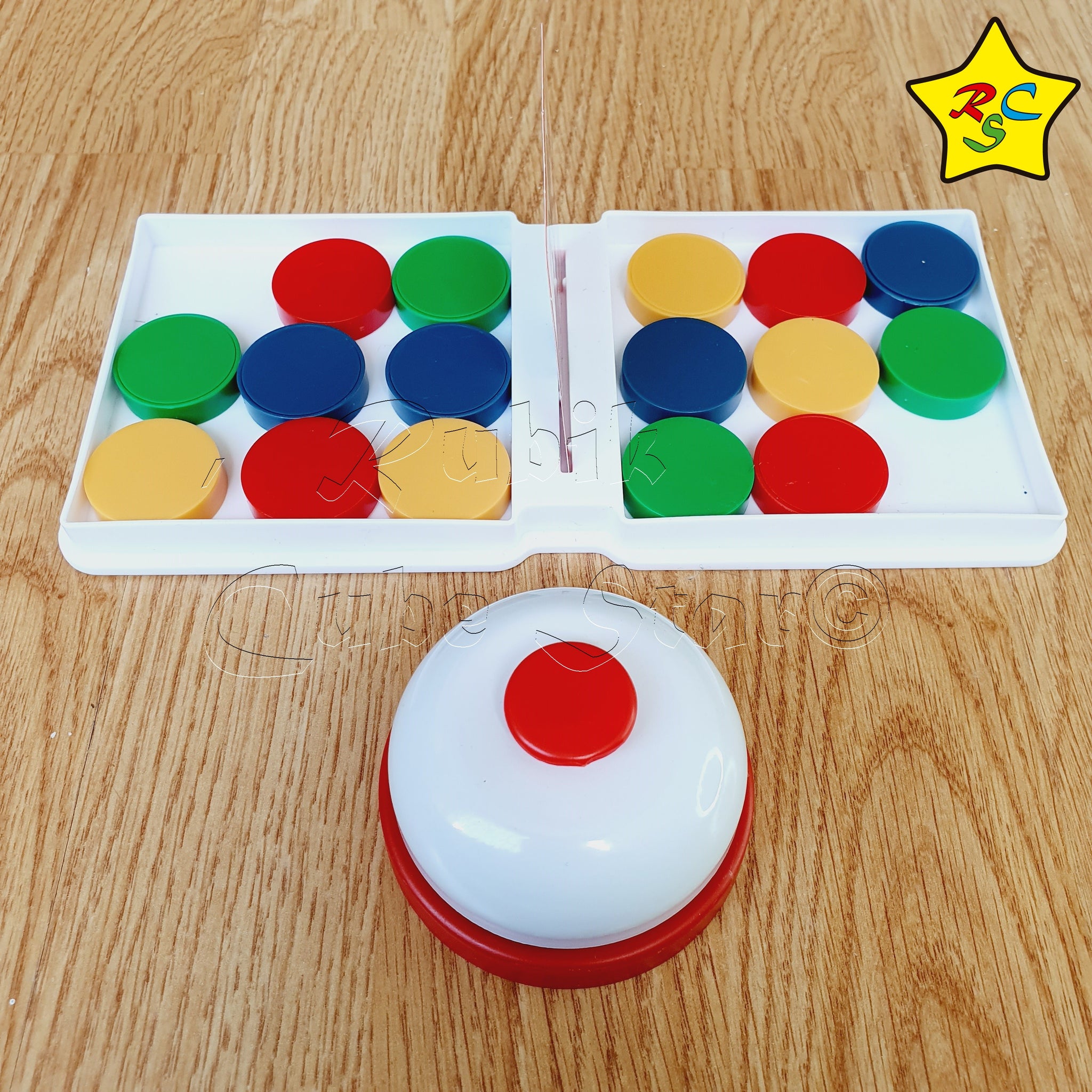 Cada jugador tendrá 8 piezas circulares de 4 colores diferentes que podrá deslizar en su lado del tablero, se coloca una carta elegida al azar en la ranura del centro, el objetivo es formar el mismo patrón de colores que indique la tarjeta, las cartas naranjas (nivel fácil) tienen un espacio mas aparte del tradicional, para ello hay que retirar una ficha roja, al estar por ambos lados cada jugador puede ver desde su lado el patrón, la primera persona en recrear el patrón de colores indicado toca la campana y recoge la carta, al final gana el primer jugador que tenga 5 cartas, las cartas contienen diferentes figuras de los mismos colores de las fichas, por lo que hay que identificar el color de cada figura para organizar las fichas en el mismo orden (las fichas NO vienen en las formas que se muestran en las tarjetas)