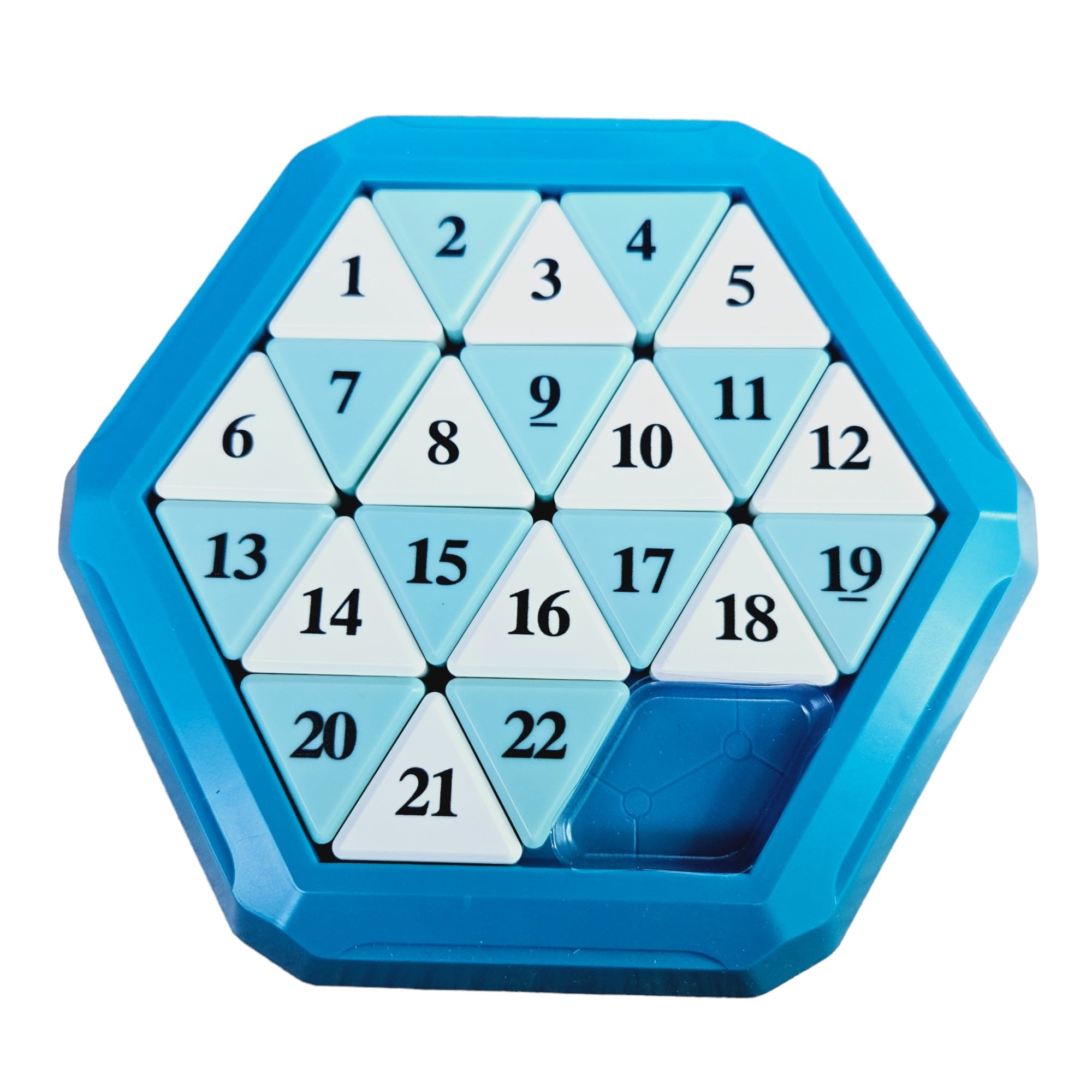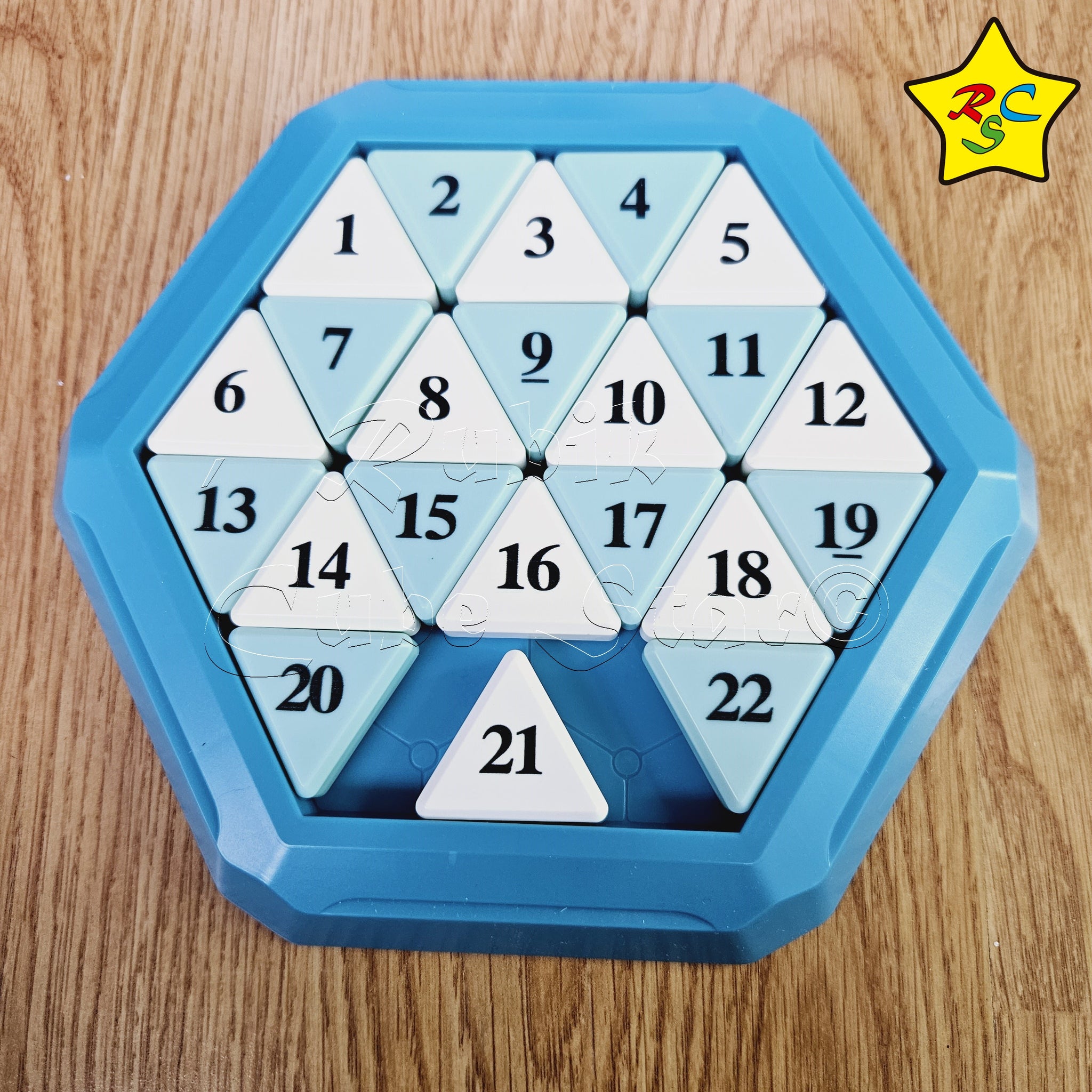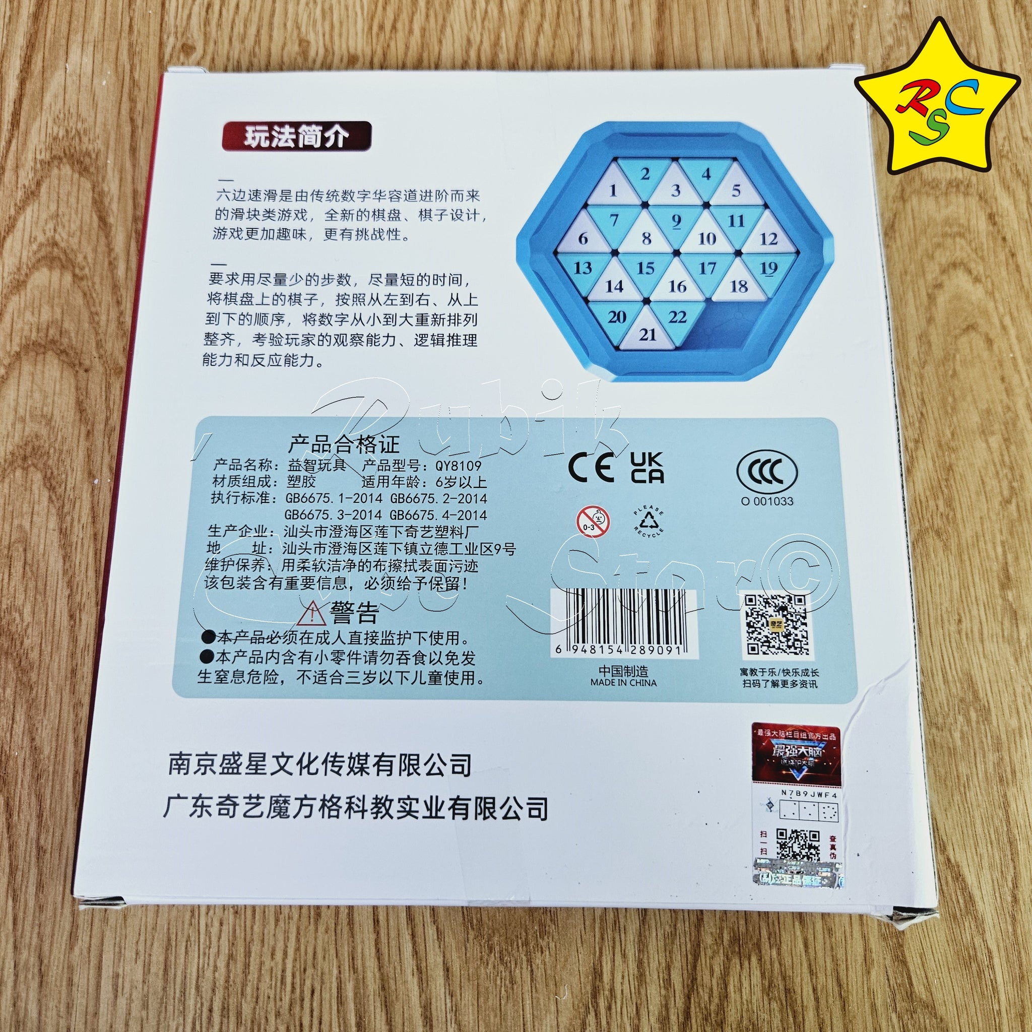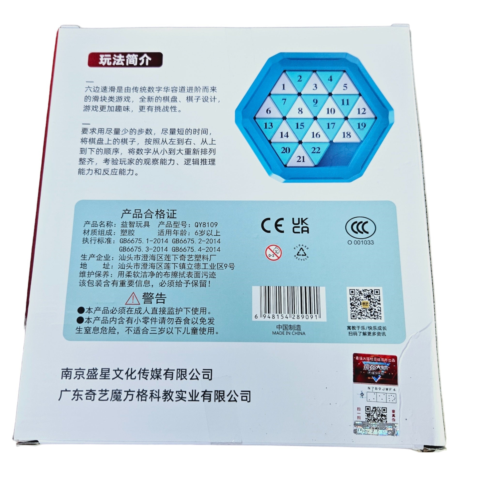 La marca Qiyi se ha caracterizado por sus productos de buena calidad a excelentes precios, en esta ocasion Qiyi, nos ofrece una entretenida variante de este tipo de rompecabezas pero con los numeros en orden del 1 al 22, este puzzle tiene una base en forma de hexagono y 22 fichas con numeros en foma de triángulo, la base es magnética y cada ficha tiene un imán para deslizar las fichas de una forma mas fácil en el tablero, por lo que sólo estan unidas al tablero gracias al imán, por esta razón se pueden retirar del tablero manualmente, sin embargo la idea es deslizarlas hasta completar el puzzle, para desarmarlo solo hay que deslizar las piezas de forma aleatorea y asi se desorganizan los números, debido a su mecanismo es mas difícil de solucionar que otro tipo de rompecabezas, ayudando a desarrollar el pensamiento lógico y habilidad mental.