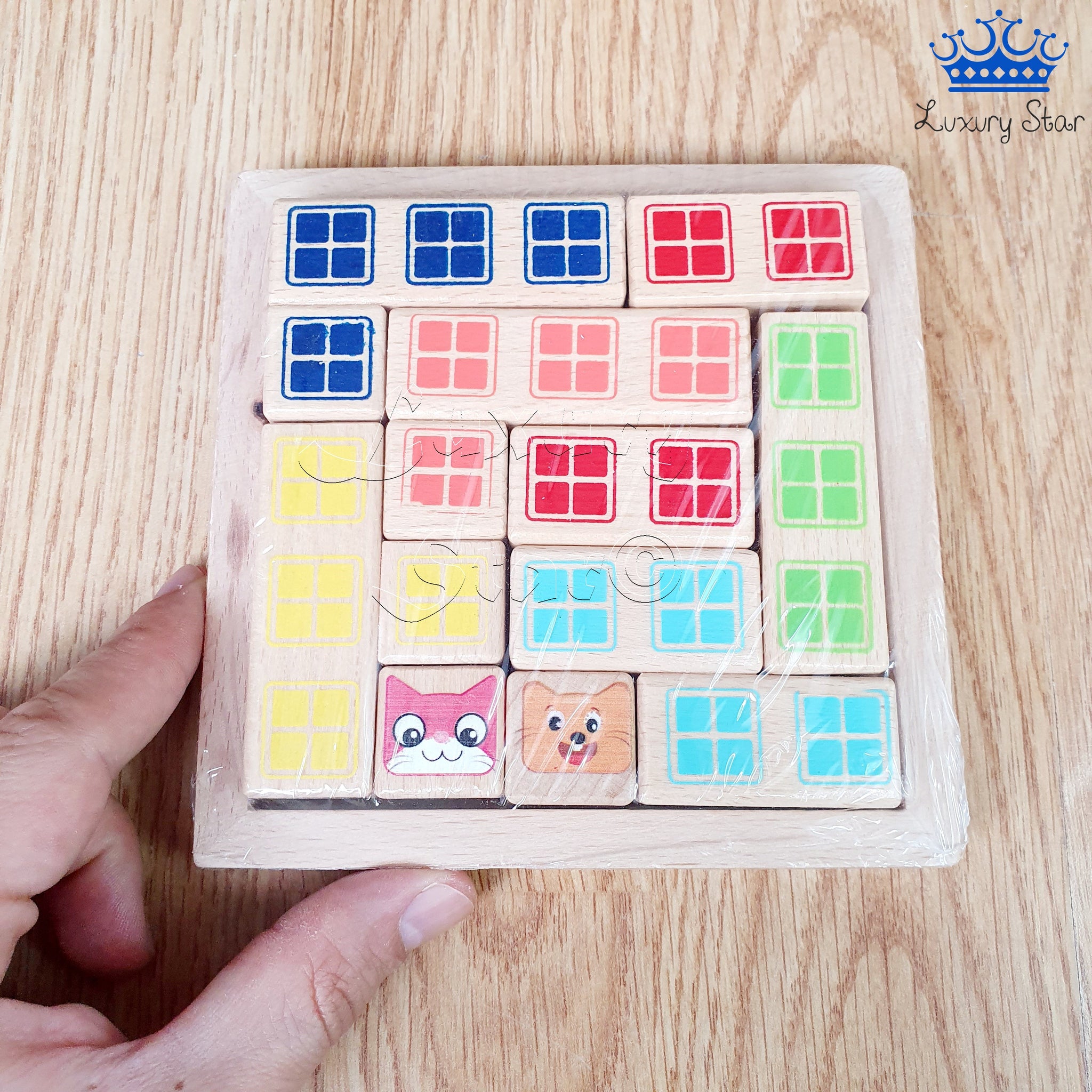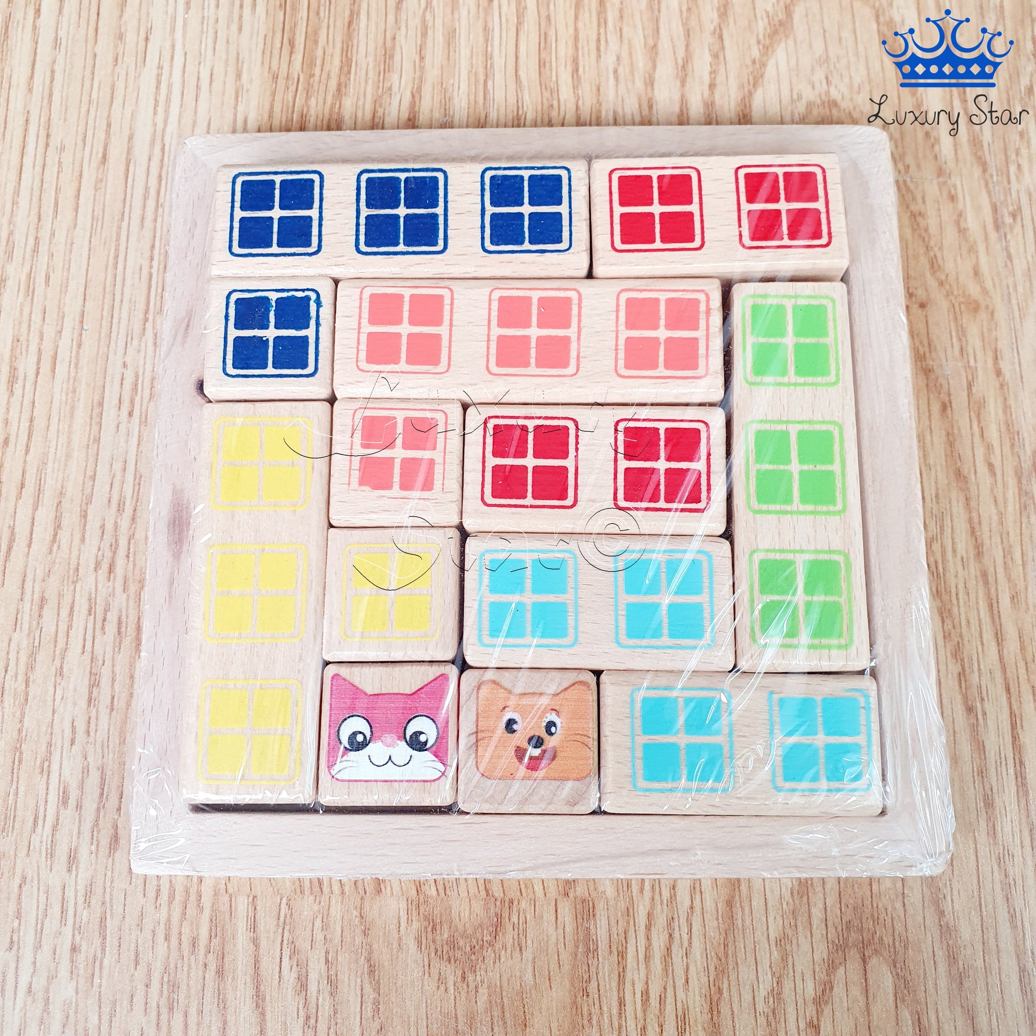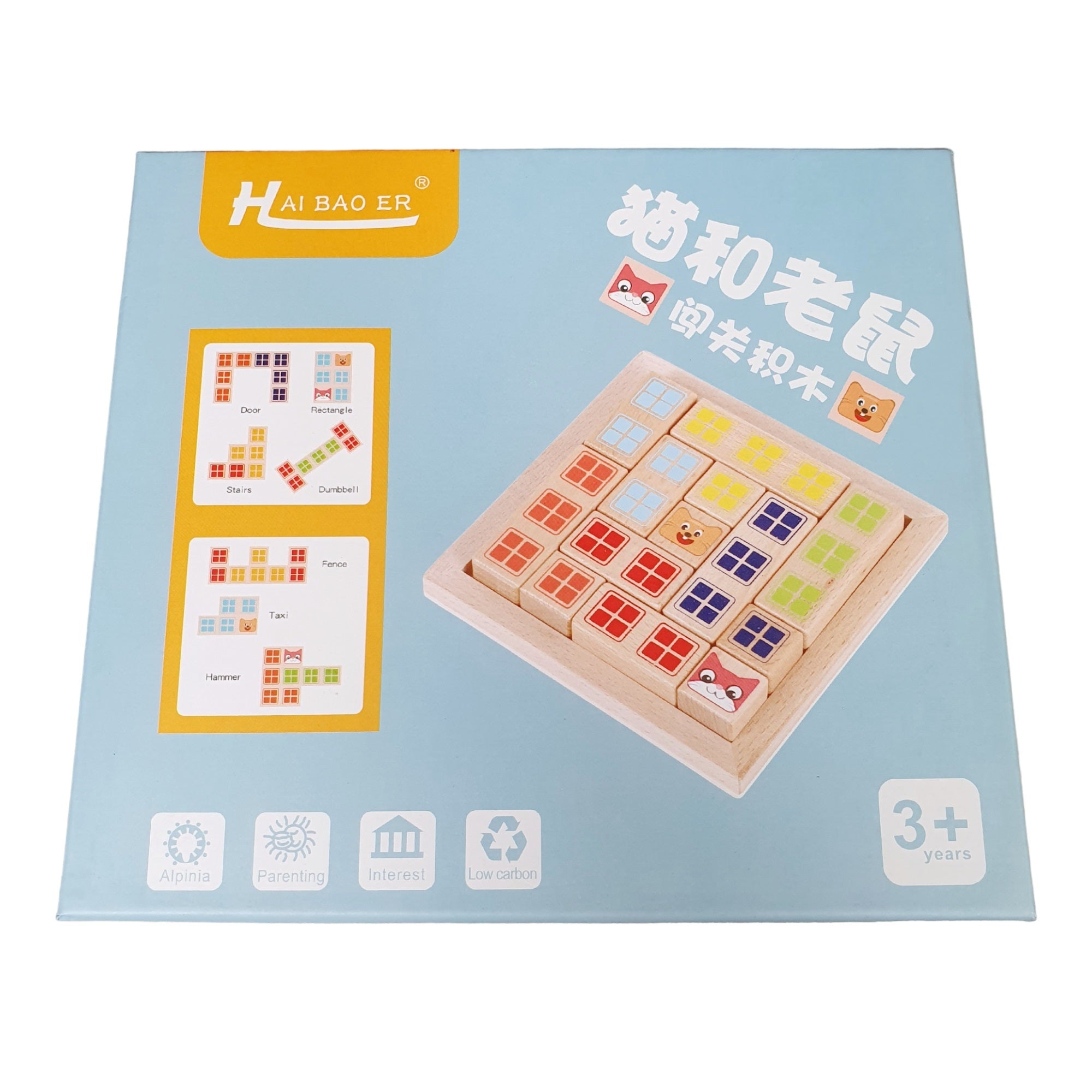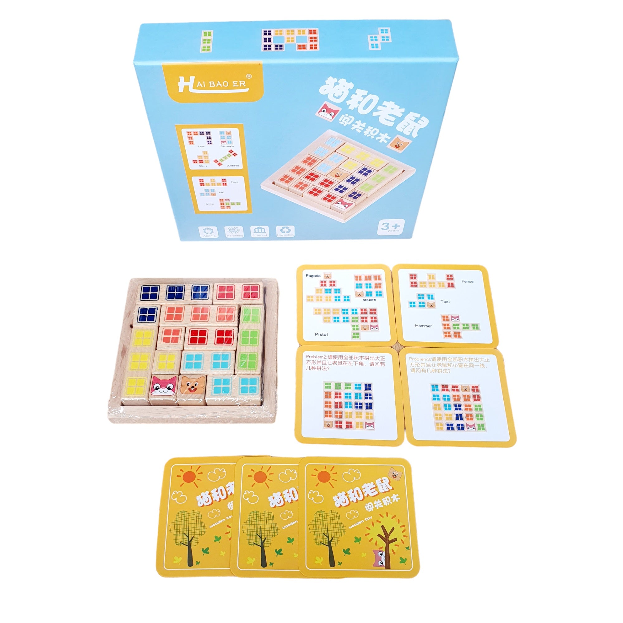 En esta ocasión se trata de un tablero cuadrado de madera donde encajan perfectamente 7 fichas de madera derivadas de cuadrados y dos fichas cuadradas con un perro y la otra con un gato, el objetivo es encajar todas las 9 fichas en el tablero cuadrado, incluye 8 tarjetas con retos y formas diferentes de organizar las fichas; este juego es ideal para que los niños mas pequeños desarrollen sus habilidades de destreza y lógica.