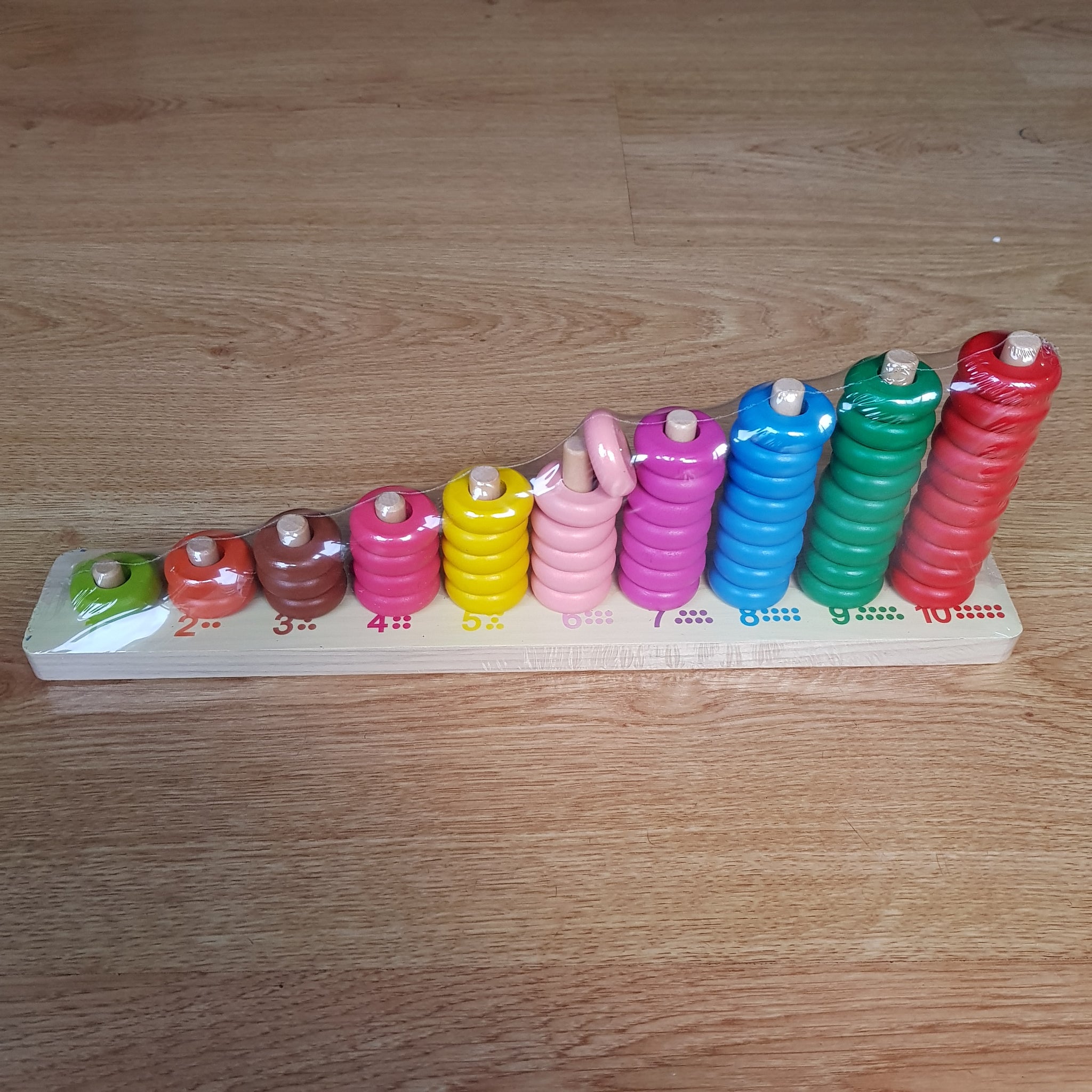 Juego para realizar operaciones matemáticas. Se trata de una tabla de madera que contiene barras paralelas verticalmente en las que están dibujados los números de 1 al 10. En cada barra hay anillos para anidar de colores verde, naranja, marrón, fucsia, amarillo, rosado, morado, azul, verde oscuro, y rojo; los cuales puedes quitar para realizar operaciones matemáticas básicas como sumas, restas, multiplicaciones y divisiones. Diviértete mientras estimulas tu cerebro y repasas matemáticas, enséñale a los niños una manera divertida y sencilla de aprender mientras compartes con ellos !!