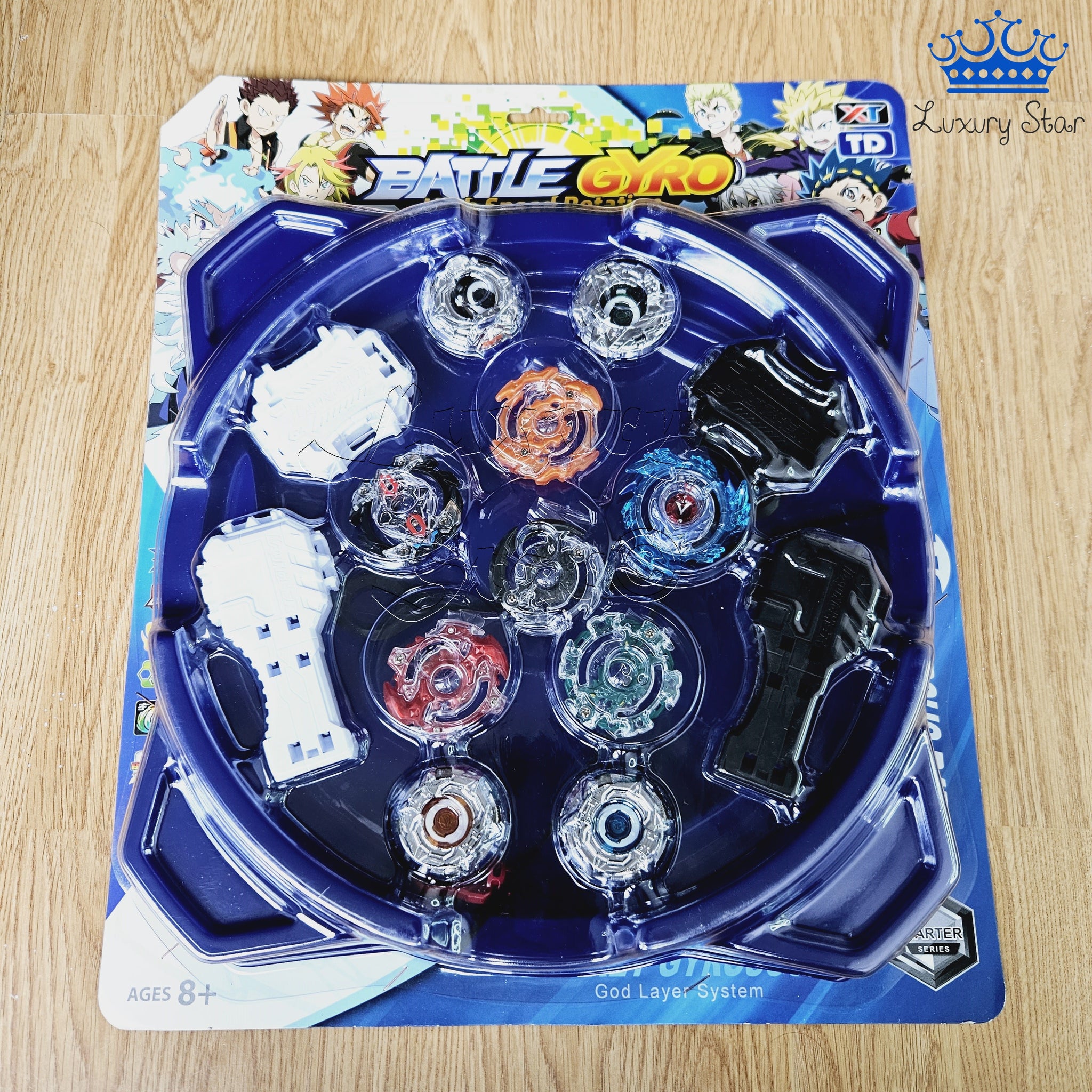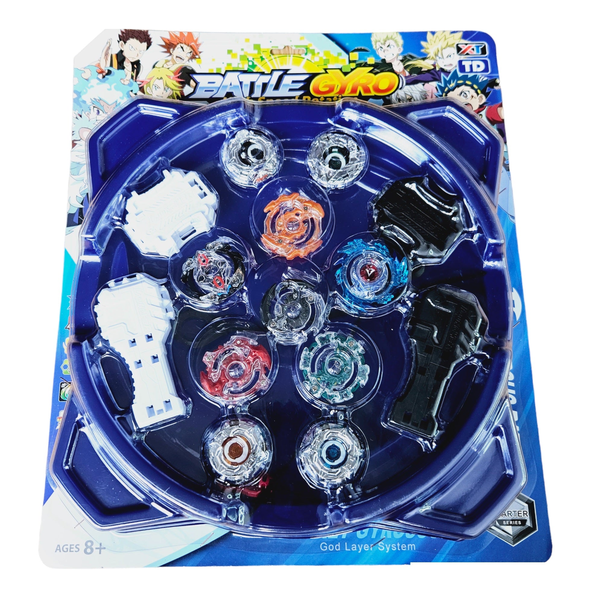 En esta ocasion se incluyen 6 Discos de energia, y 4 aros de fuerza y performance tip para poder combinarlos de diferentes formas, 2 lanzadores y dos soportes para sujetar los lanzadores con mayor facilidad, 1 estadio o tablero de juego con capacidad para hasta 4 jugadores; diviertete con tus amigos jugando batallas con este increible estadio beyblade!