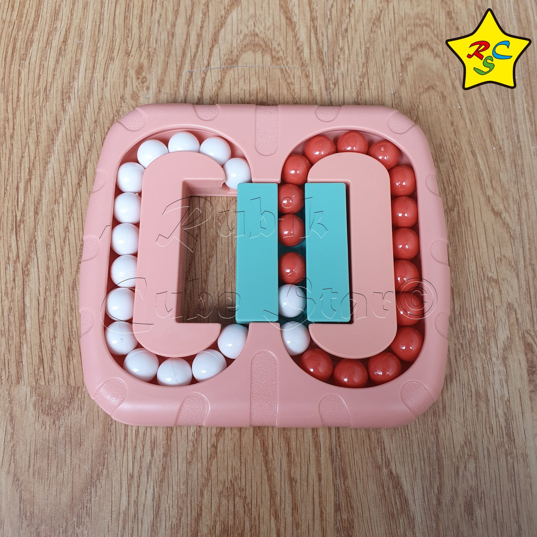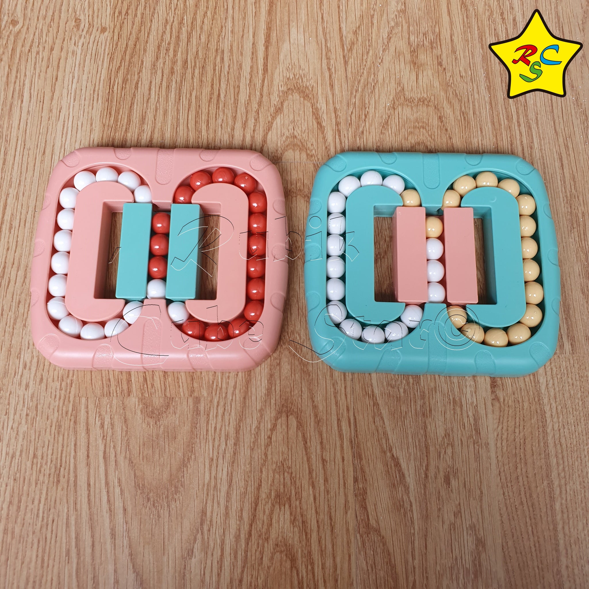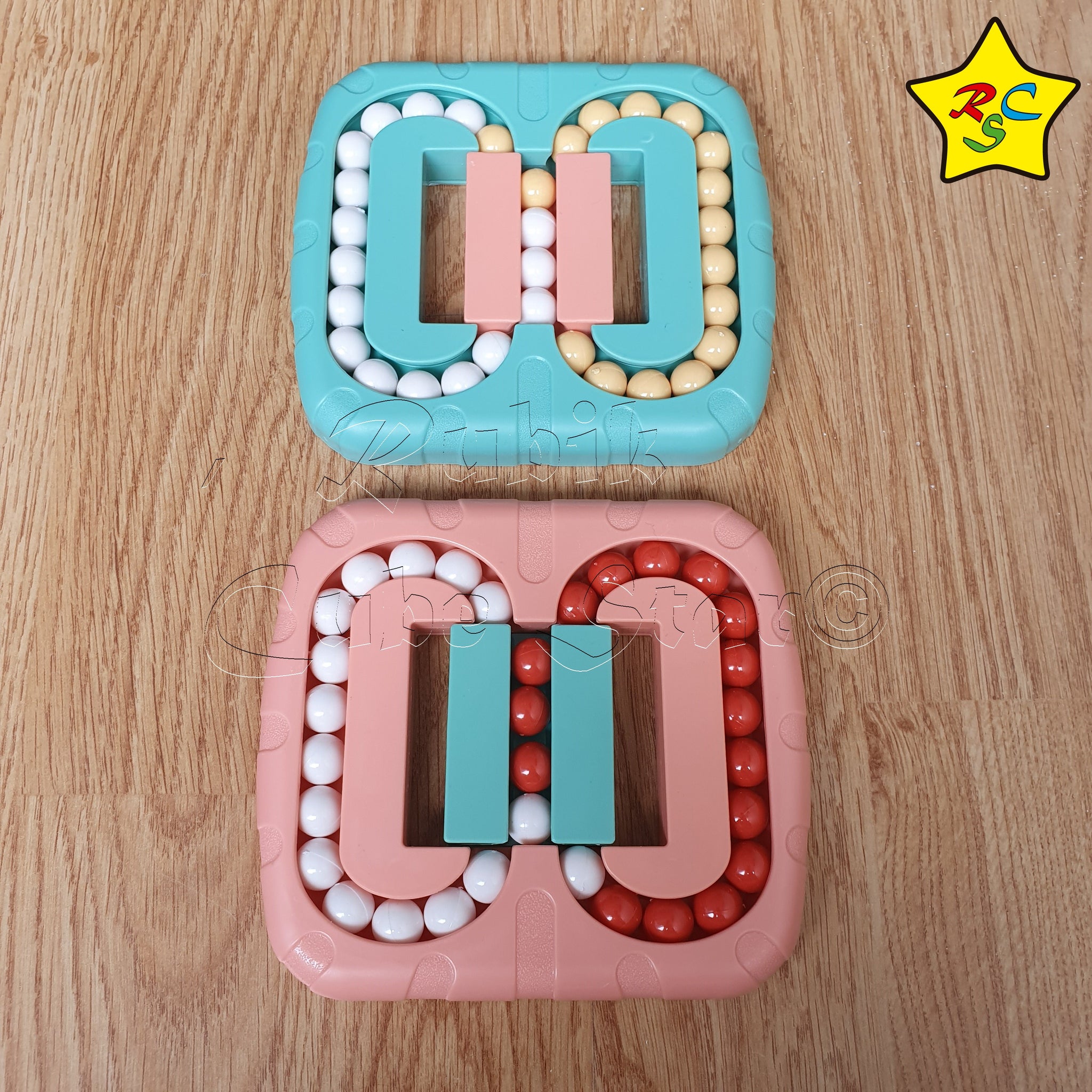 Este rompecabezas sensorial consta de una pieza en forma semi cuadrada con pepas de 2 colores diferentes ubicadas en 2 ranuras, las pepitas de colores pueden moverse con los dedos y desplazarse entre las ranuras, en el centro se juntan las ranuras y a través de una pieza que se desliza de lado a lado es posible trasladarlas de una ranura a otra. El objetivo de este puzzle es juntar en cada ranura las pepas del mismo color.