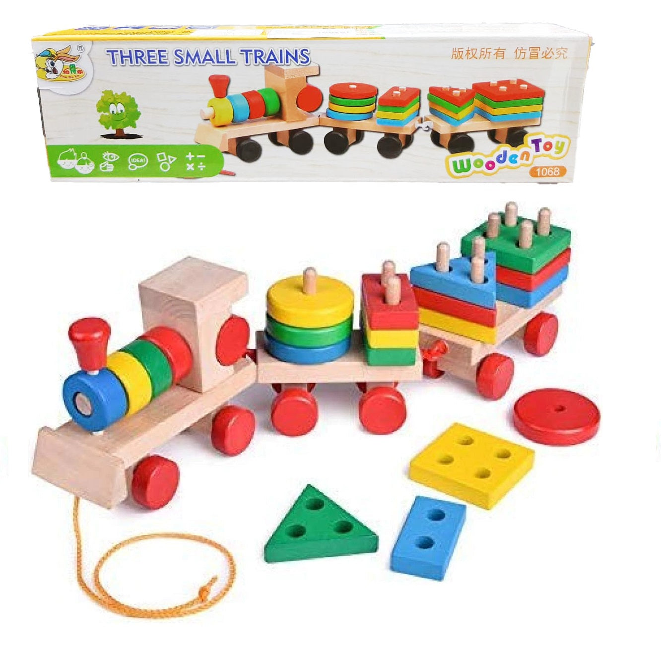 Este Hermoso Juguete consiste en un tren y dos vagones hechos totalmente en madera, cada uno de ellos cuenta con ruedas deslizables y una superficie donde podrás acomodar piezas de diferentes formas geométricas y colores, ademas podrás engancharlos y tirar de ellos con una cuerda que trae en el tren principal.