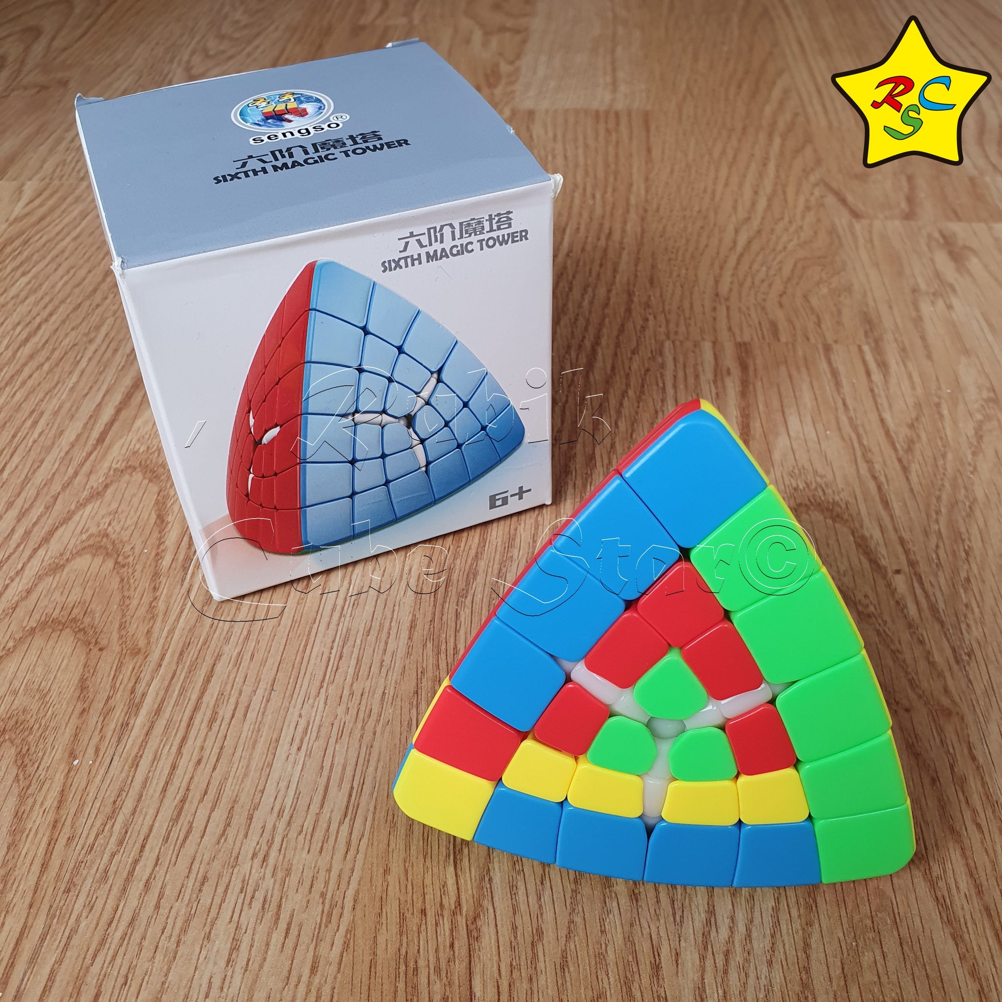 El Magic Tower 6x6 es un Pyraminx Jinx de 6 niveles de la marca Shengshou, el Jinx Pyraminx es una modificación de un Cubo Master Skewb en forma de tetaedro donde para hacer los giros puedes mover las esquinas como si se tratara de un Cubo Rex o cubo dino, desplazando gran cantidad de piezas lo que lo hace un cubo complejo. A lo contrario de lo que piensa mucha gente, este cubo no permite giros de los niveles exteriores, como si ocurre en un Cubo Mastermorphix.Al tratarse de un cubo de varios niveles en esta caso de 6 y al desplazar gran cantidad de piezas en cada giro, el Magic Tower es un cubo que lleva bastante tiempo armarlo y su dificultad es elevada, lo que lo hace un cubo perfecto para entretenerse y un gran reto para todos los amantes de los cubos de y sus modificaciones.