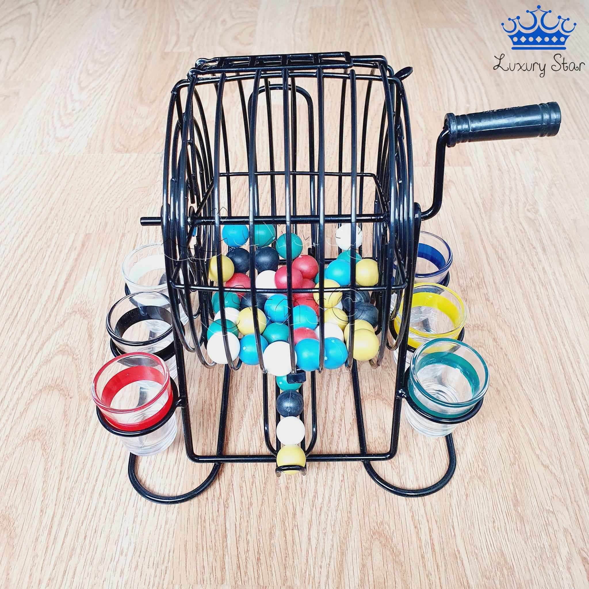 Incluye una balotera metálica con 48 bolas de colores (blanco, negro, azul, verde, rojo y amarillo) y 6 copas de vidrio, cada una marcada con uno de los colores. La balotera tiene espacios para colocar las copas en los laterales (3 a cada lado). Al girar y liberar una bola, el jugador con la copa del color correspondiente debe tomarse el shot.