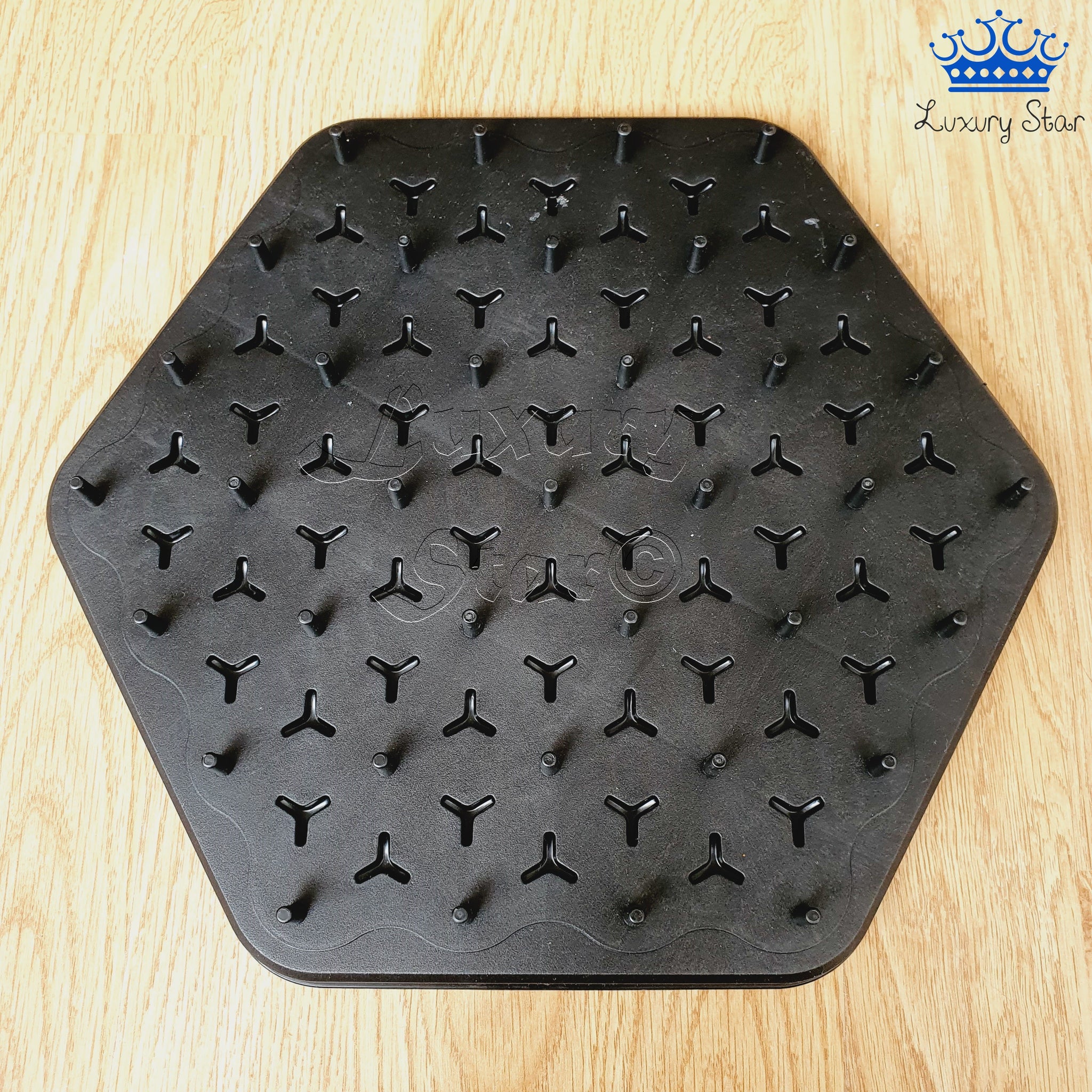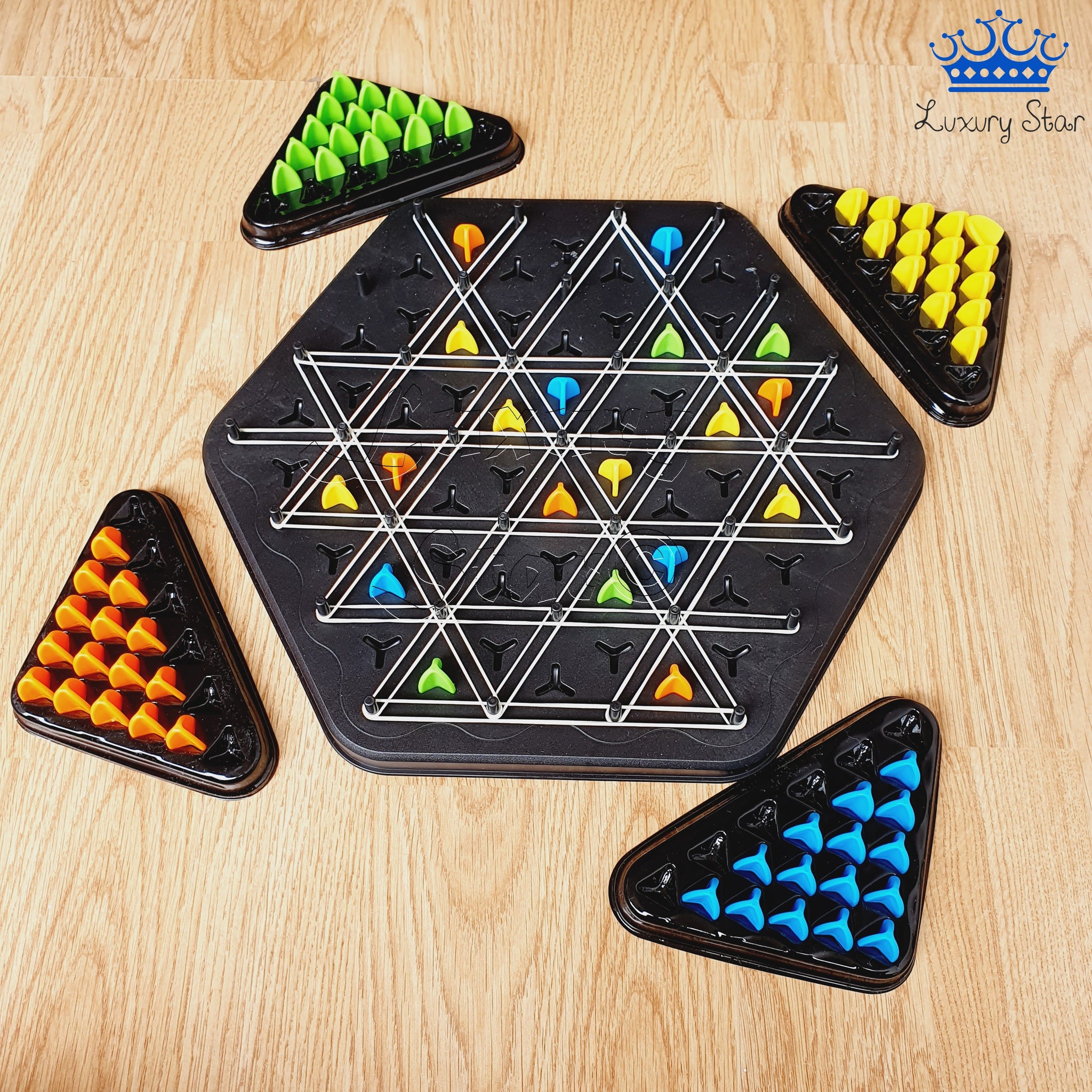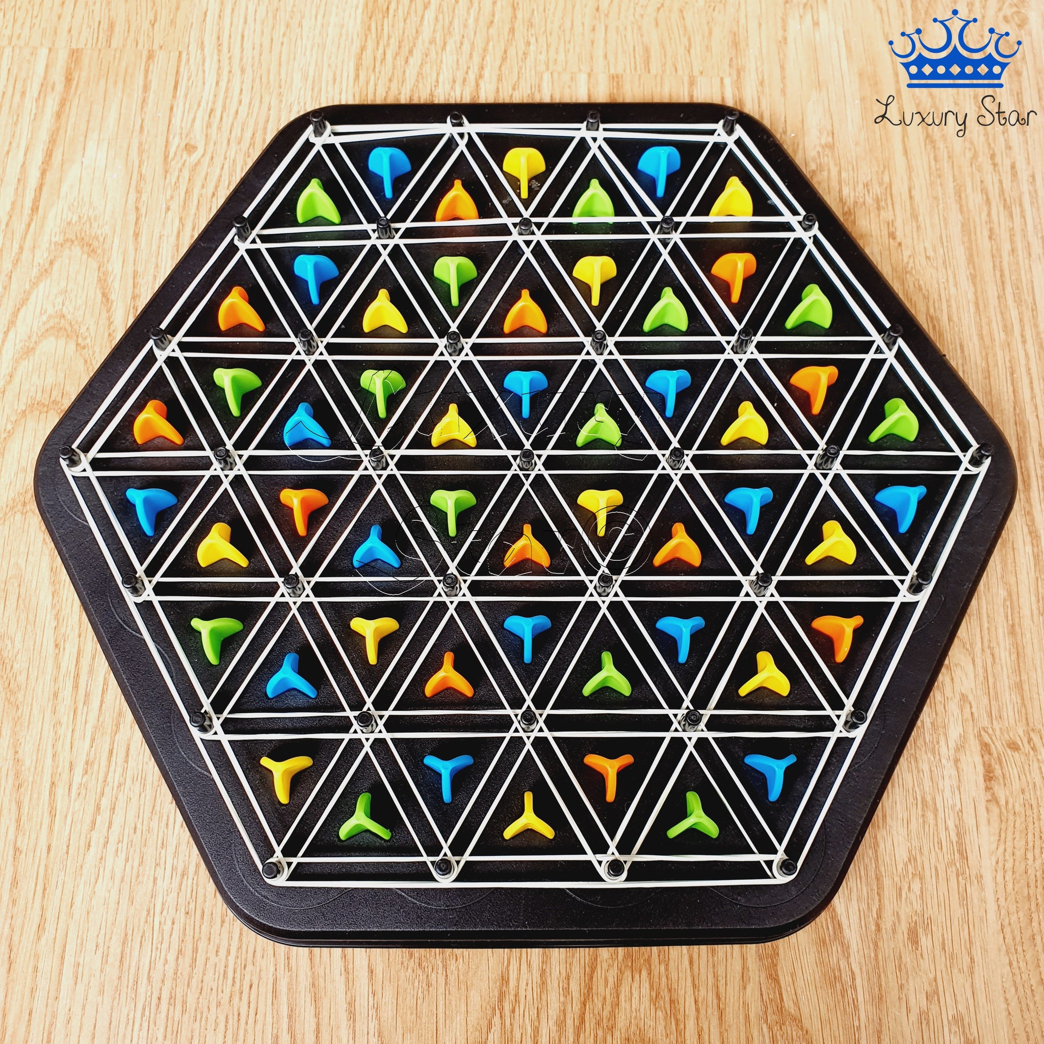 Este entretenido juego de mesa combina estrategia, lógica y geometría. Cuenta con un tablero hexagonal con agujeros triangulares, rodeados por pequeños postes en cada vértice, que permiten colocar cauchos formando figuras. Incluye fichas de colores naranja, amarillo, azul y verde (21 por cada color) y cauchos blancos.