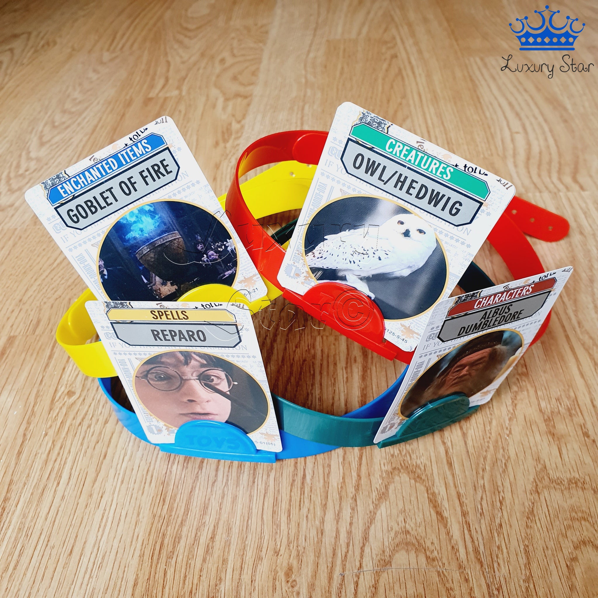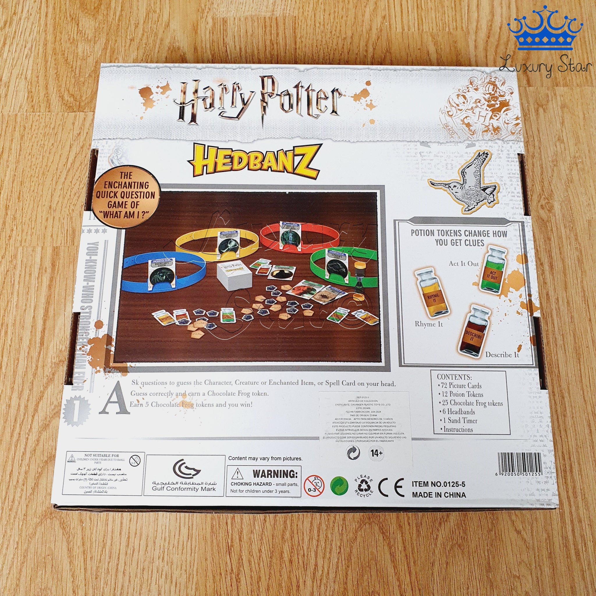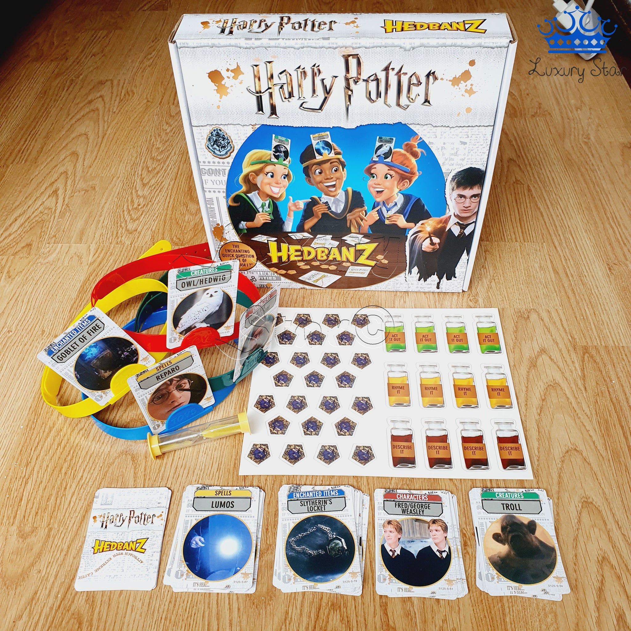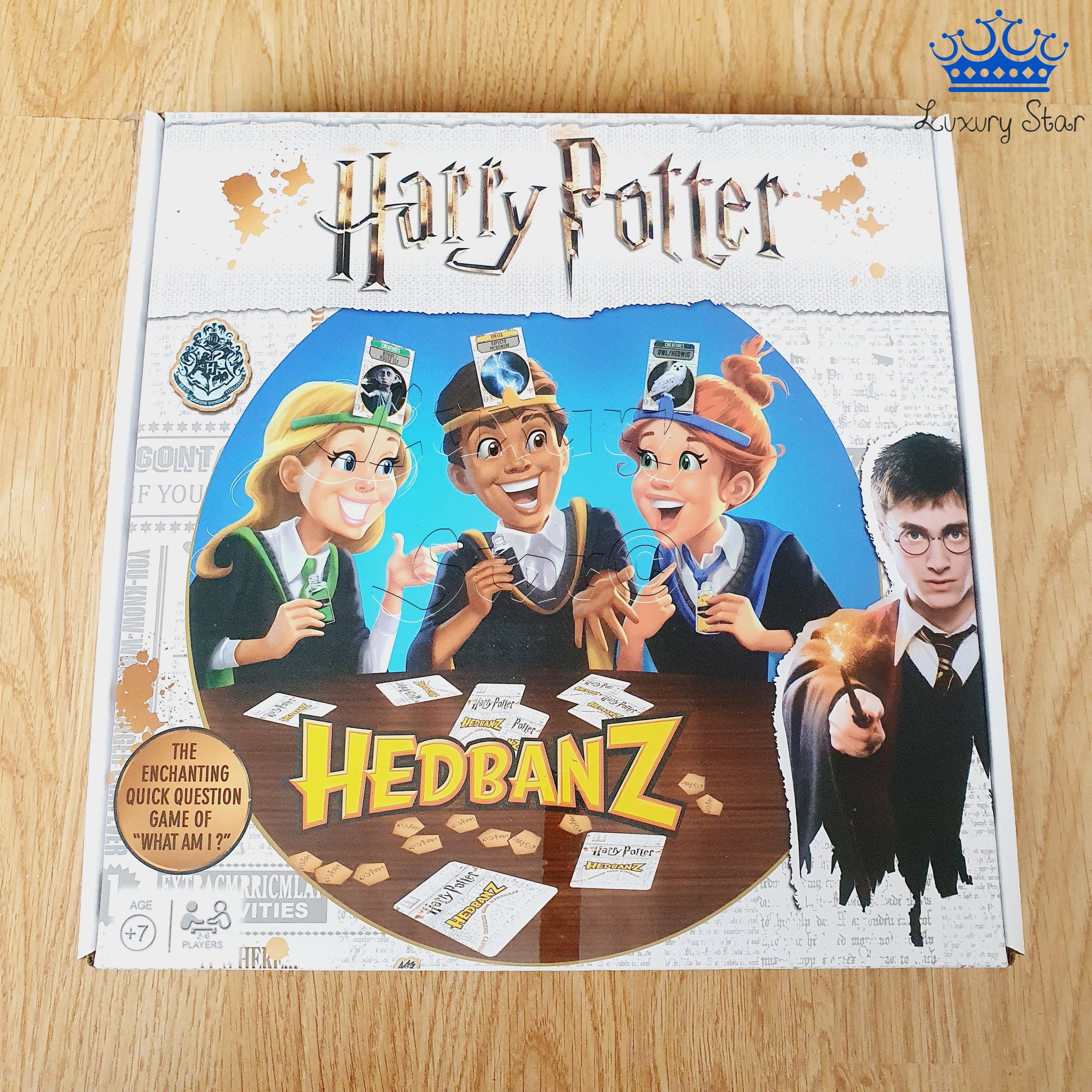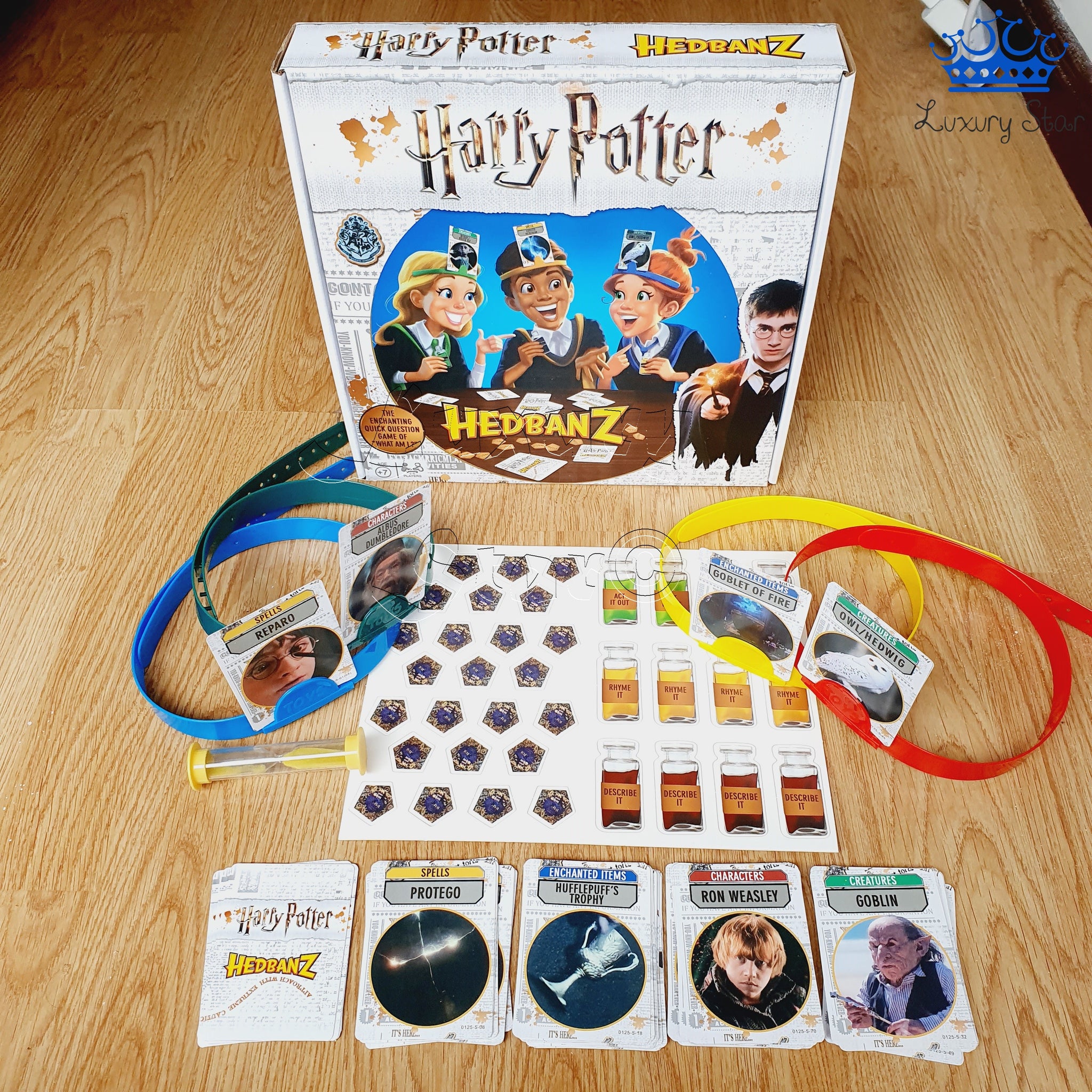 Hedbanz es un divertido juego de mesa para 2 a 6 jugadores donde cada participante debe adivinar qué carta tiene en la frente haciendo preguntas de “sí” o “no”. En esta versión, el universo de Harry Potter se convierte en el escenario del juego, con cartas temáticas y diademas de colores que representan cada casa de Hogwarts.