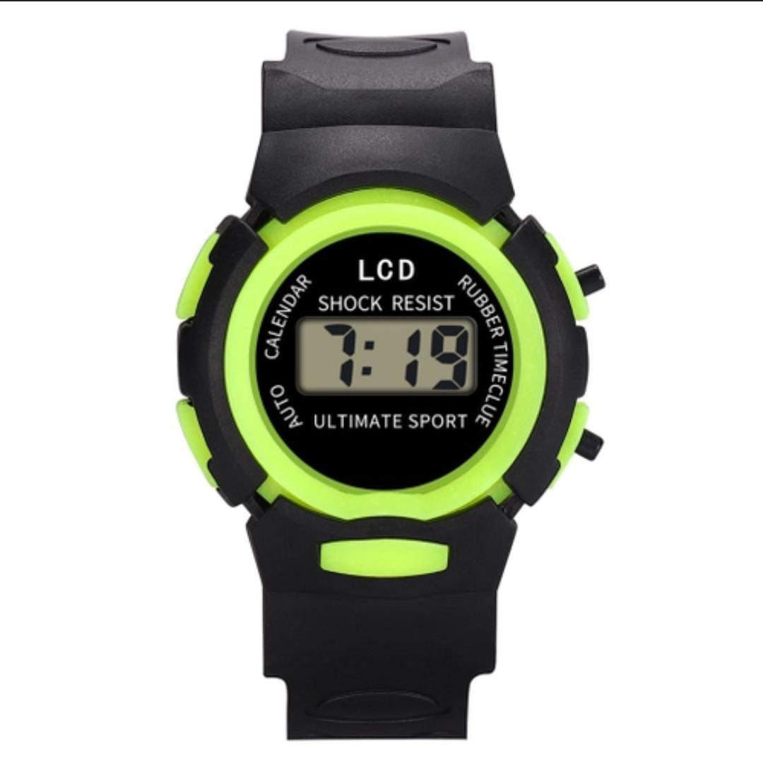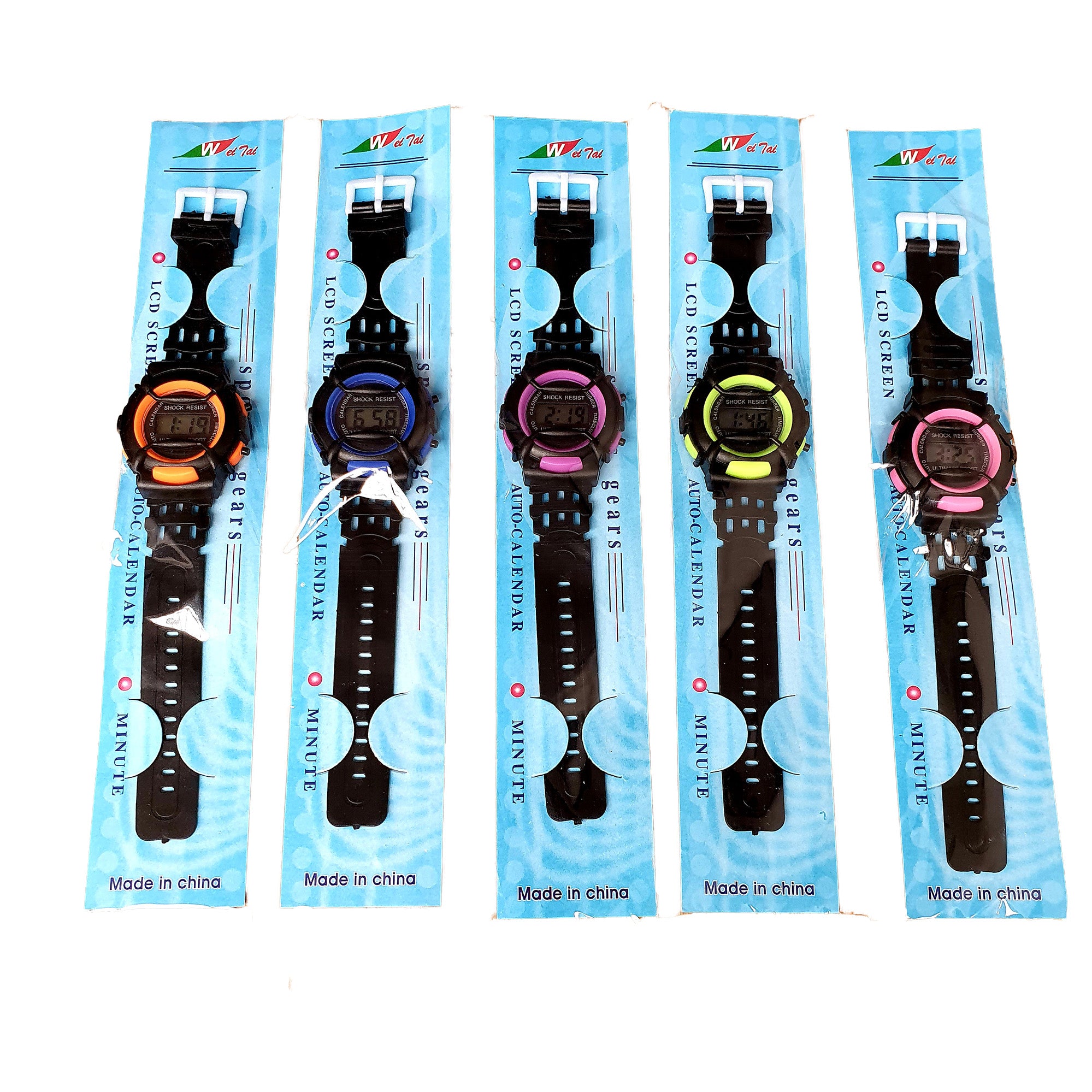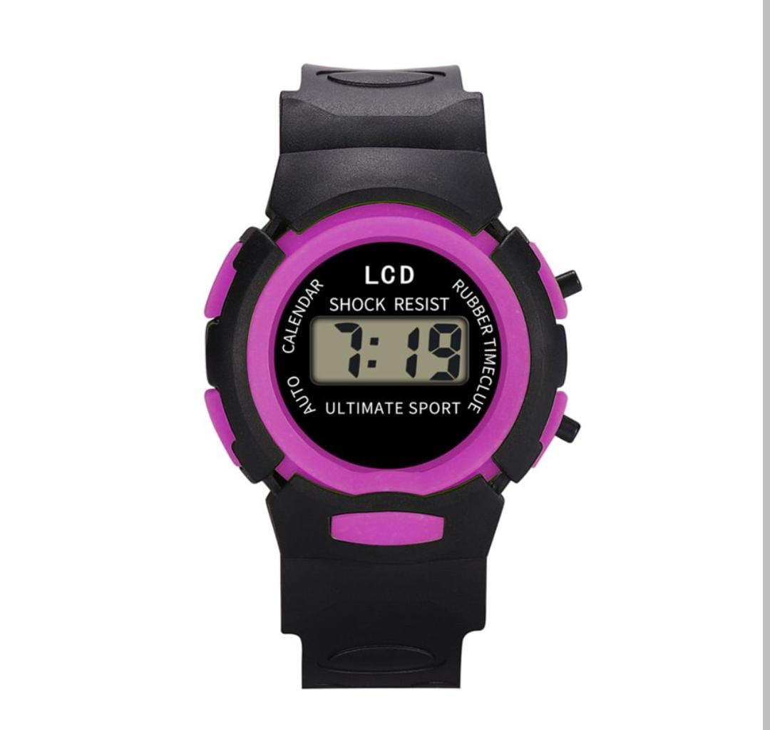 Este reloj es un excelente detalle para lo niños o personas que quieran un reloj sencillo y económico. Maneja una pequeña pantalla LCD monocromatica donde muestra la hora digitalmente, aparte de la hora tambien puedes configurar la fecha. La pulsera esta fabricada en goma de color negro, el color del bisel varia segun disponibilidad (rosado, azul, verde, naranja y morado) la hebilla es en plástico y trae unas barritas de goma para proteger la pantalla en caso de caída o para que no se raye tan fácil.