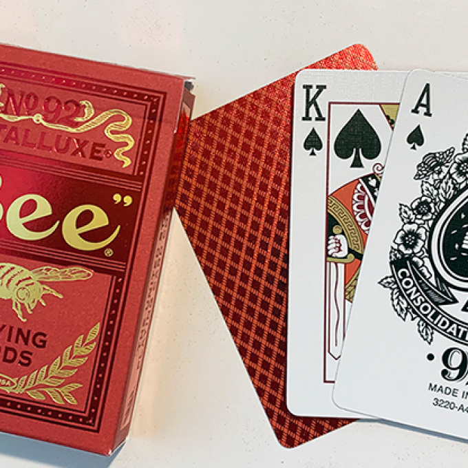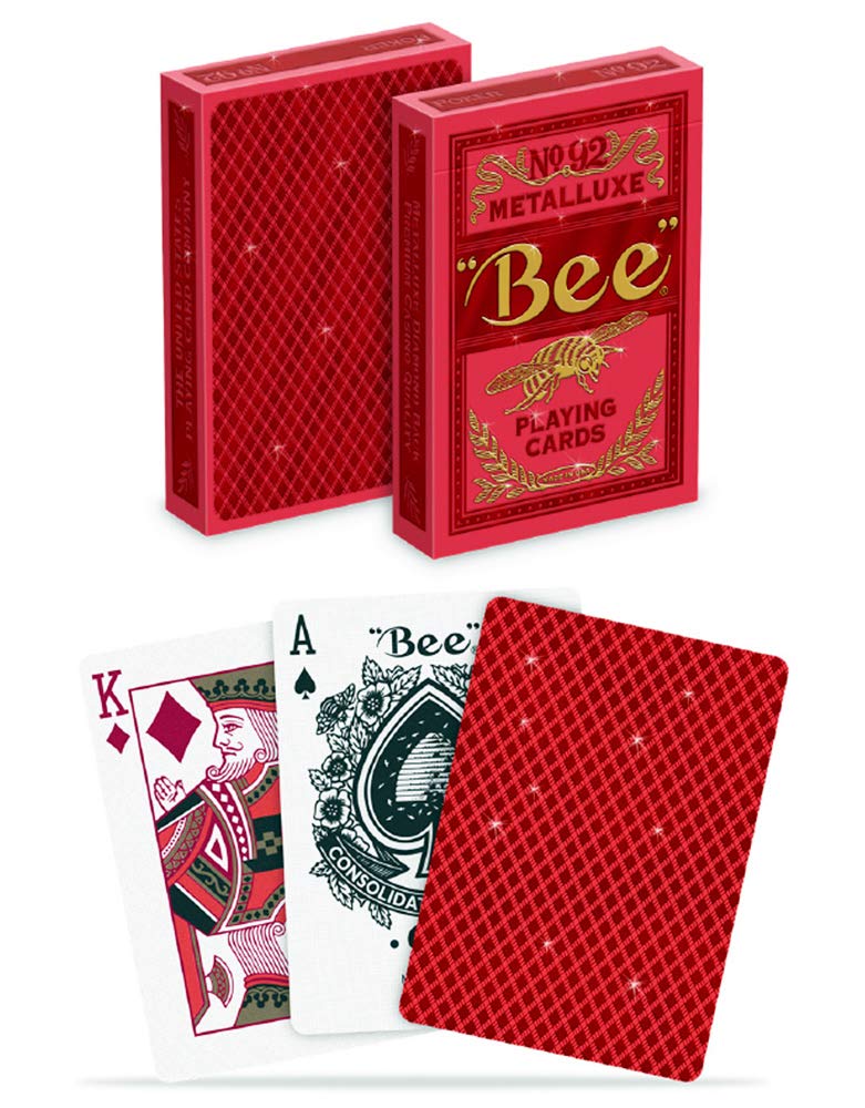 La baraja Bee Metalluxe es la primera de la marca en implementar el diseño de dorso metalizado con un hermoso color ROJO que crea un reflejo de luz cautivador con un acabado de lujo, una caracteristica que hace muy llamativas a estas cartas. Las caras de las barajas conservan el tradicional color blanco con palos rojos y negros, ideal para la colección o para compartir un rato en familia y/o amigos.
