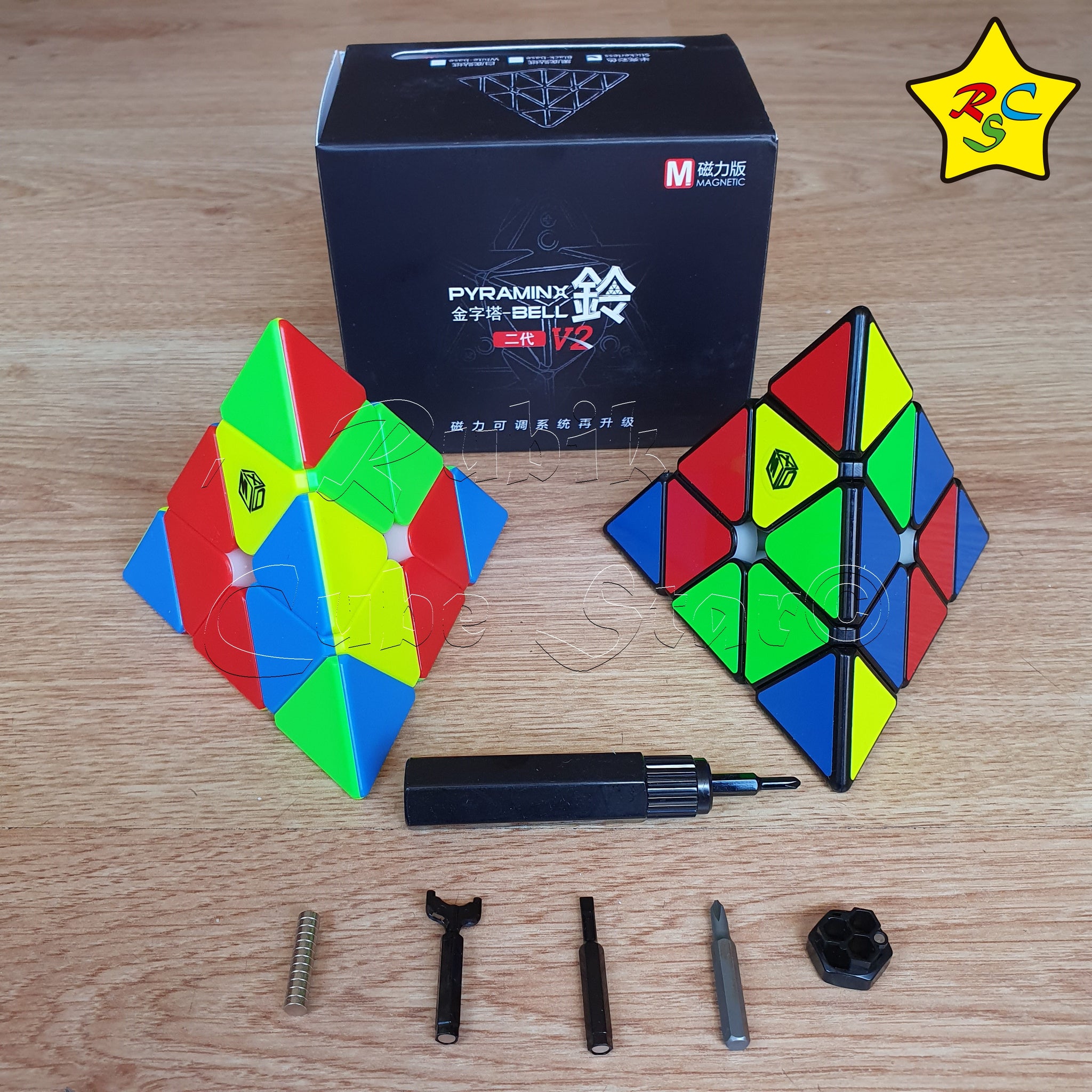 Excelente cubo de en forma de pirámide conocido como el pyraminx.El Pyraminx X-Man Bell V2 es la última versión del cubo pyraminx de la marca Qiyi X-Man, es un pyraminx magnético profesional de alta gama, siendo el primero en el mercado con un mecanismos de imanes y tensiones ajustables, por lo que trae un set de destornilladores para que puedas graduarle la potencia de los imanes y graduarle las tensiones de la pirámide.