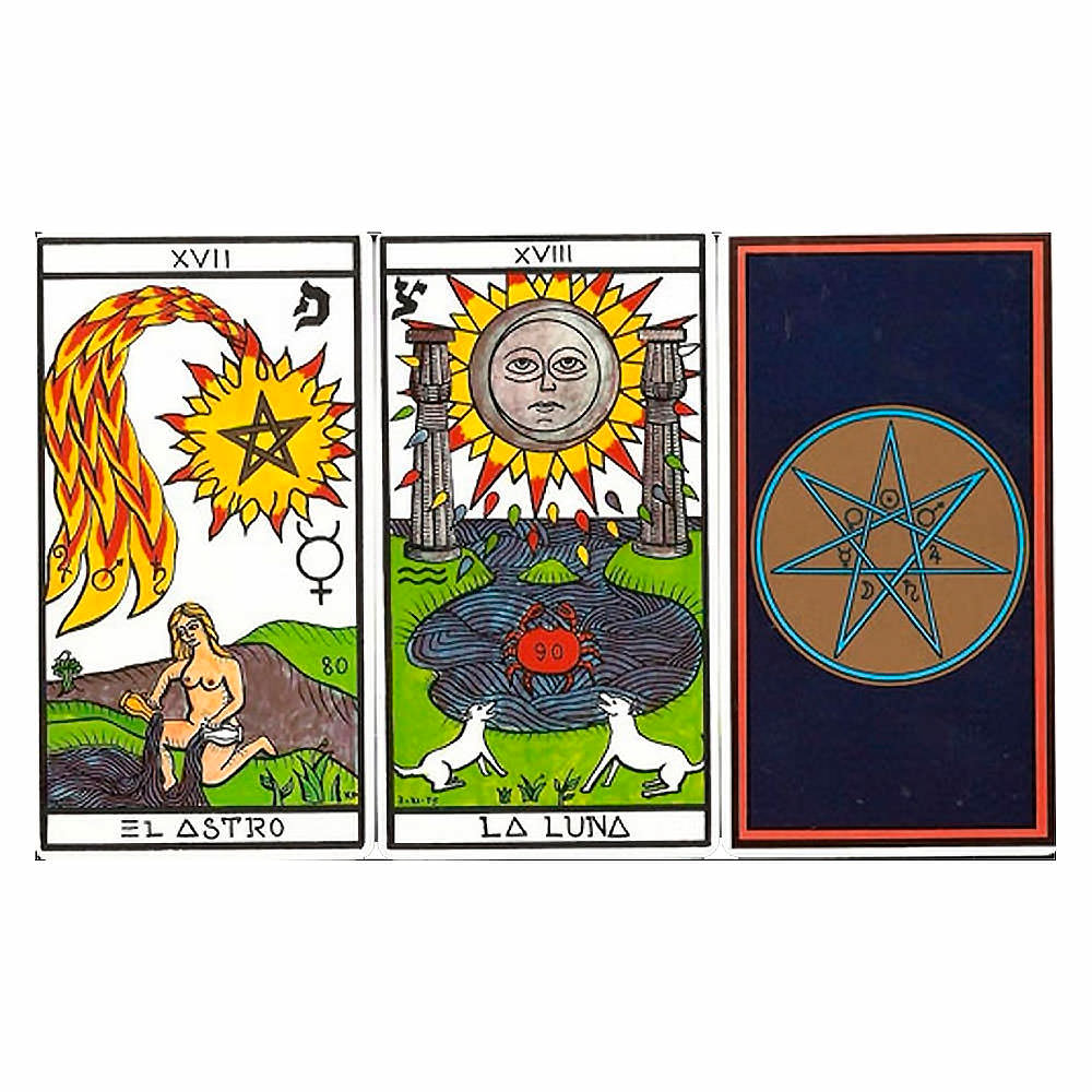 El Tarot está impreso en papel laminado estucado exclusivo, bañado en barniz acuoso de alta durabilidad, en su dorso color azul posee un aro con una estrella de 7 puntas