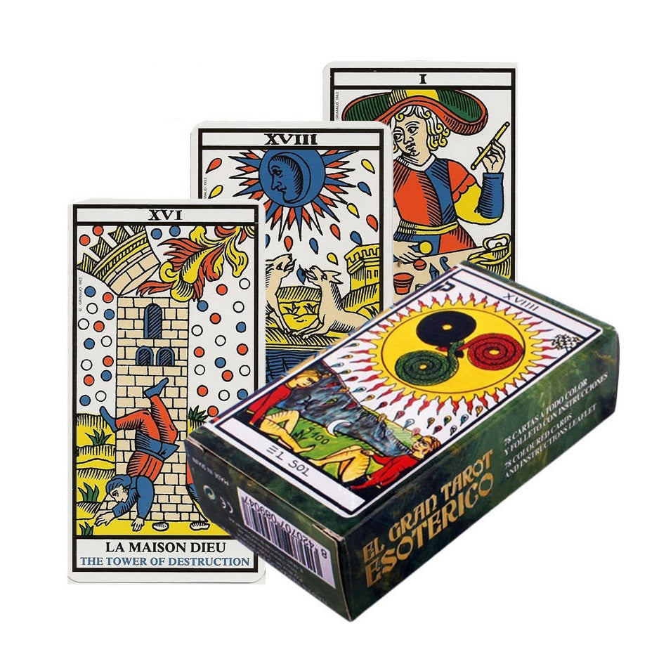 El gran Tarot esotérico, es una baraja muy usada en la actualidad para adivinar el futuro con cualidades predictivas que ayudan a realizar interpretaciones para la toma de soluciones en situaciones complejas, se basa en imágenes similares a la baraja española con luminosos colores e ilustraciones llamativas sobre un fondo blanco y un borde en negro.