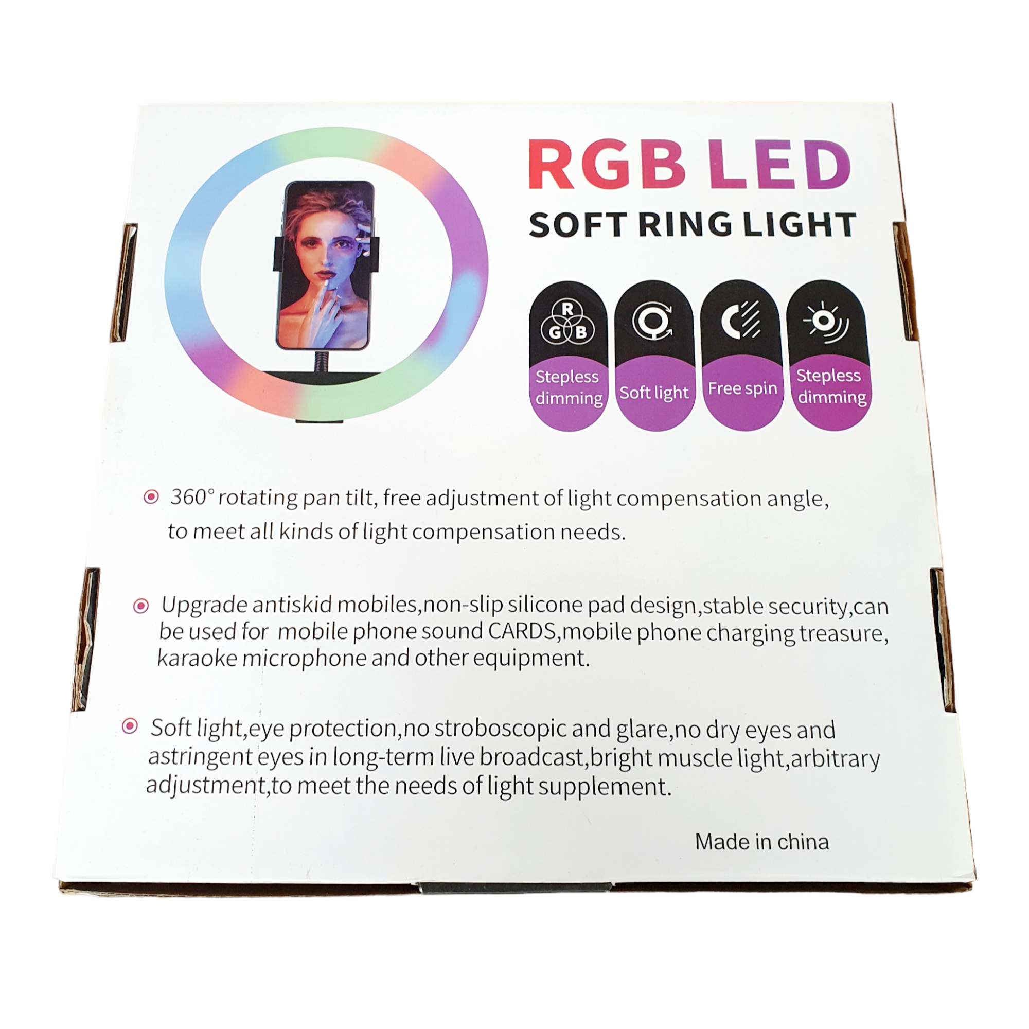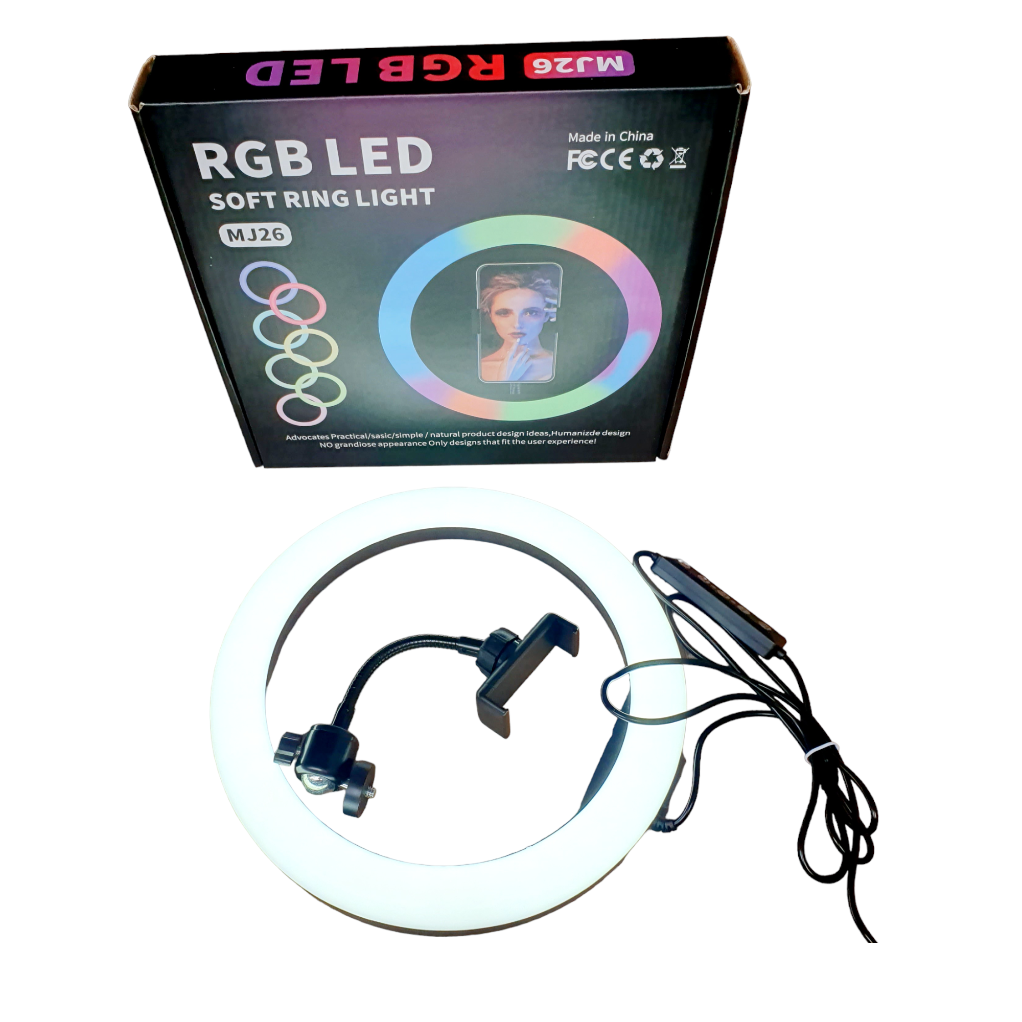 Un aro de luz es una herramienta de iluminacion utilizada en los videos o fotografias para redes sociales, se trata de un aro compuesto por varios bombillos Led que al estar cubiertos por una superficie de color uniforme dan la impresion de ser una sola bombilla en forma de aro, su forma facilita ubicar la camara o celular en el centro logrando iluminar la imagen uniformemente lo que ayuda a eliminar sombras no deseadas y conseguir una imagen de mejor calidad.Normalmente estos aros de luz tienen solo luz blanca, este aro aparte de la luz blanca tiene la opcion RGB o multicolor, con diferentes secuencias de colores e intensisidades, lo que permite una iluminación e imágenes mas creativas.