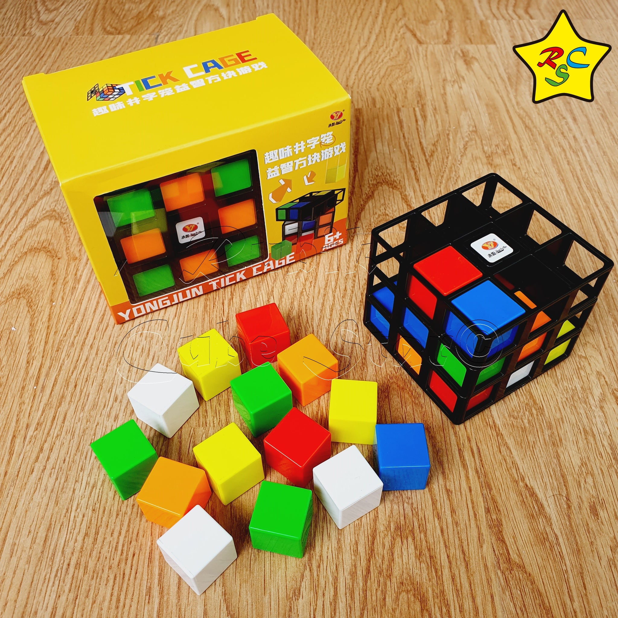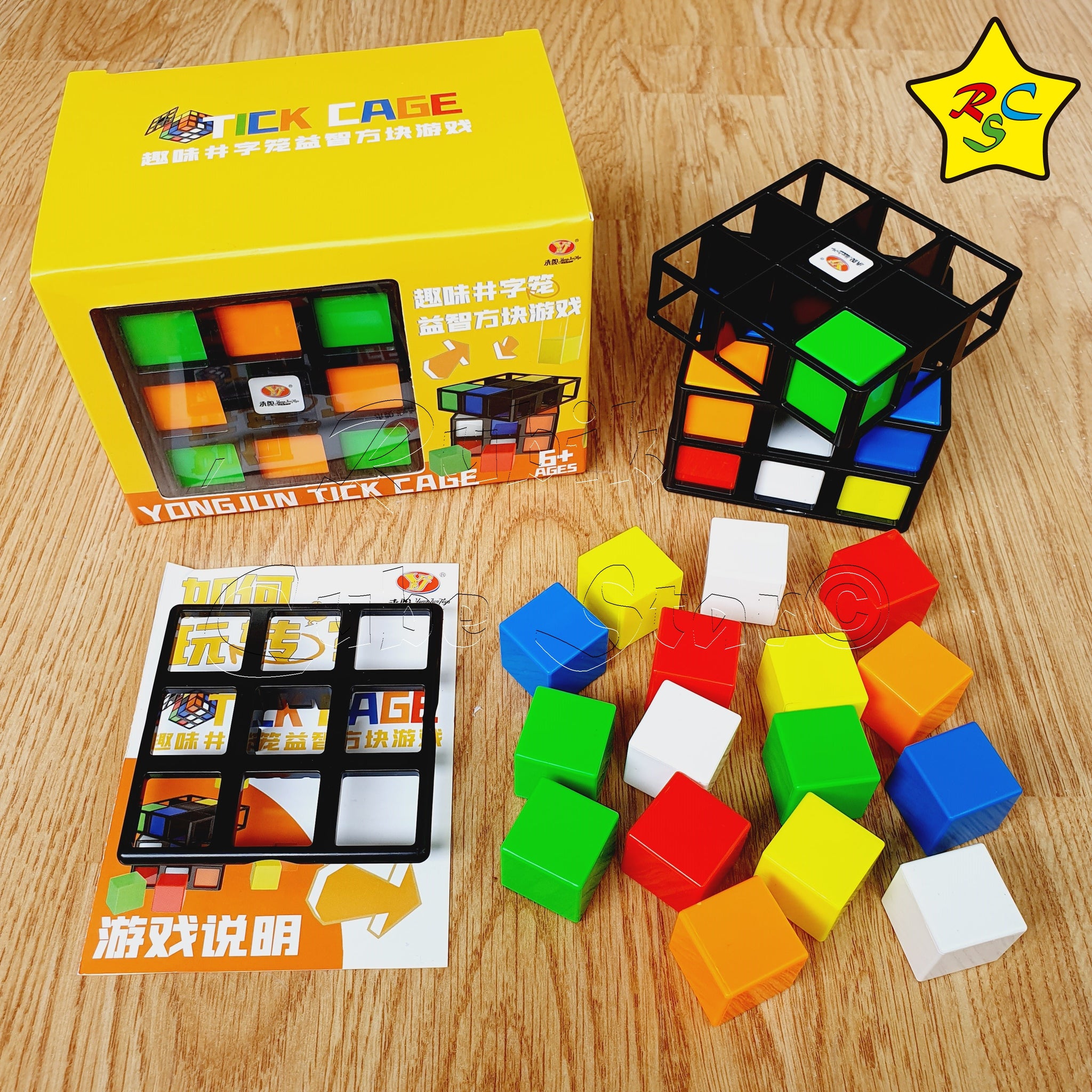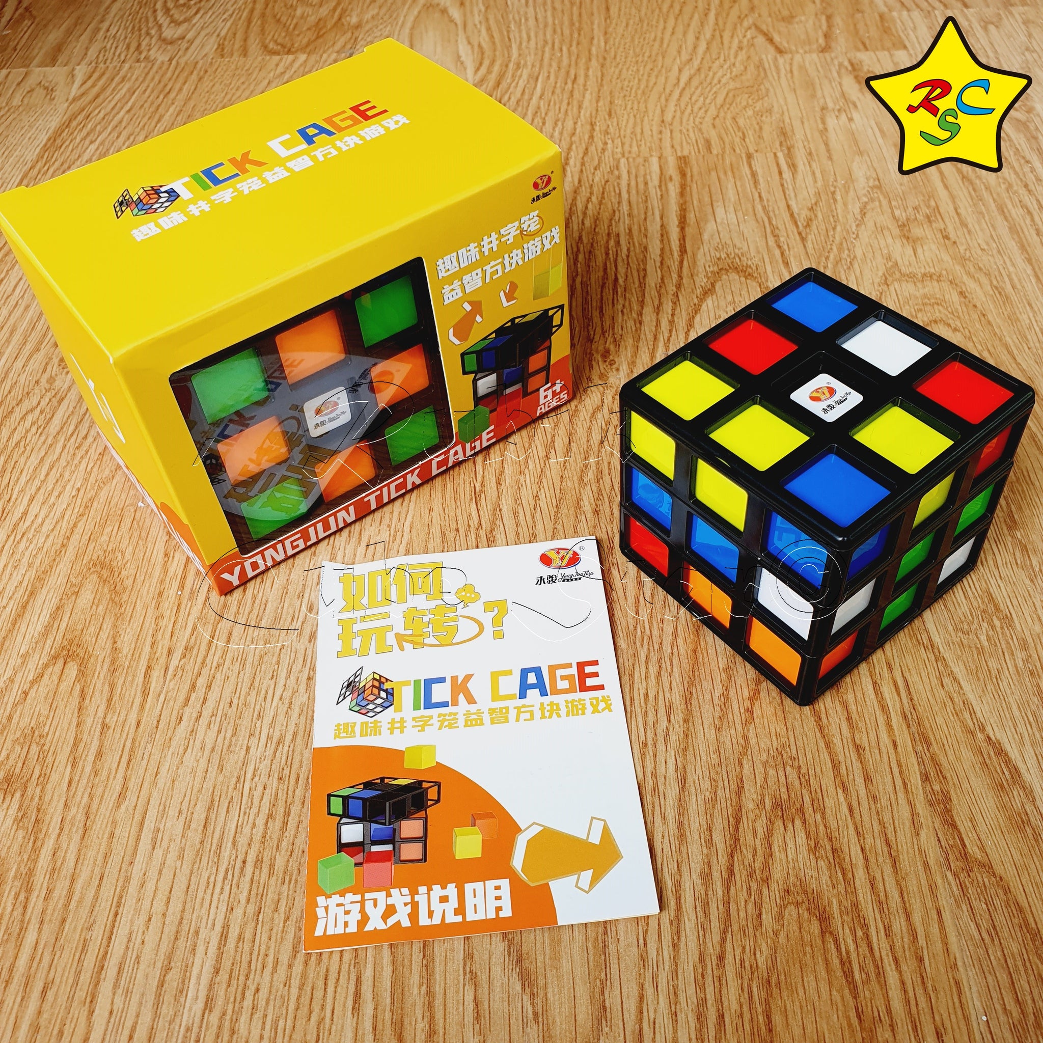 El juego Tick Cage o Jaula de es un juego de mesa que tiene la forma de un Cubo de 3x3x3 con la particularidad de que podrás jugar al tradicional juego TRIQUI o 3 EN RAYA, pero ahora podrás hacerlo en 3 dimensiones, para esto tendrás bloques de diferentes colores que podras introducir en el Cubo de y así formar triqui, además de insertar los bloques por la parte superior del Cubo, podrás rotar el Cubo para desplazar las piezas y también podrás hacer giros horizontales de 90° lo que hará que los bloques que se encuentren dentro del Cubo se desplacen y de esta manera tambien formar tu triqui de 3 colores, lo que hace que el juego sea aun mas interesante y complejo.