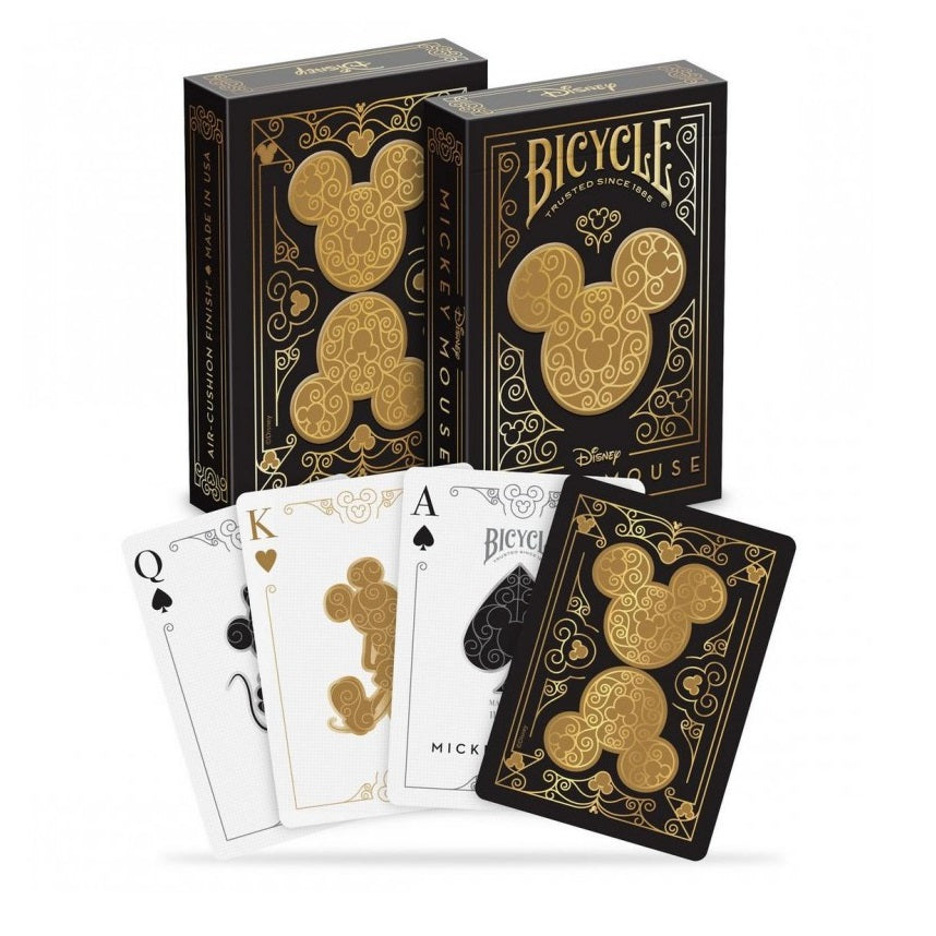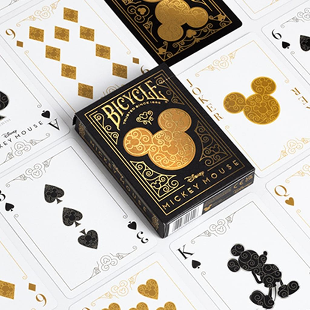 Esta baraja es un homenaje al reconocido personaje que protagoniza el universo de Disney, Mickey Mouse, el dorso es de color negro con el diseño de la silueta de la cabeza de Mickey en detalles dorados, las cartas son de color blanco y los palos de color negro y dorado dandole un toque elegante, cada carta posee algun detalle minimo de Mickey Mouse, hacienodola una baraja con mucho detalle y sin duda exclusiva por sus colores dorado y negro.