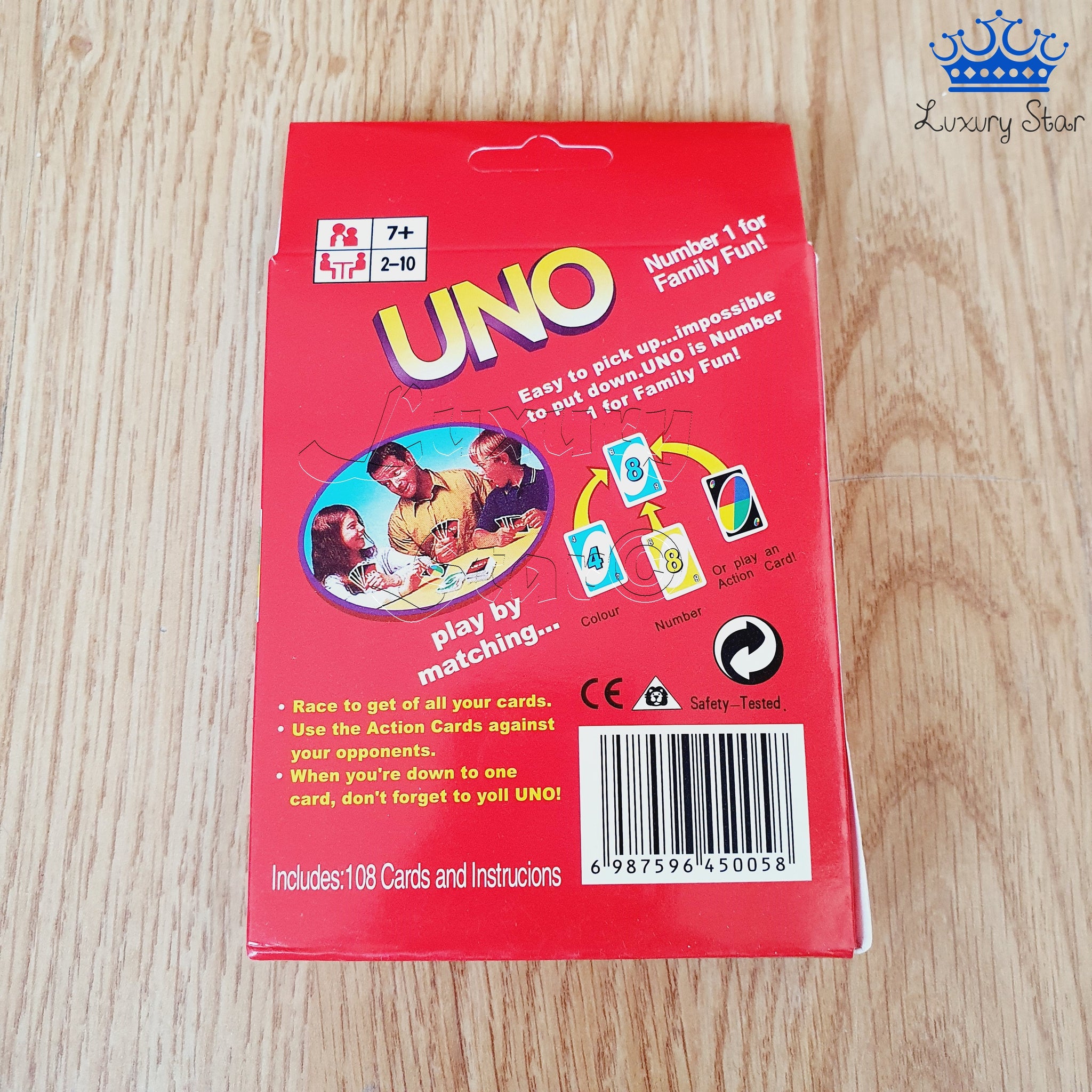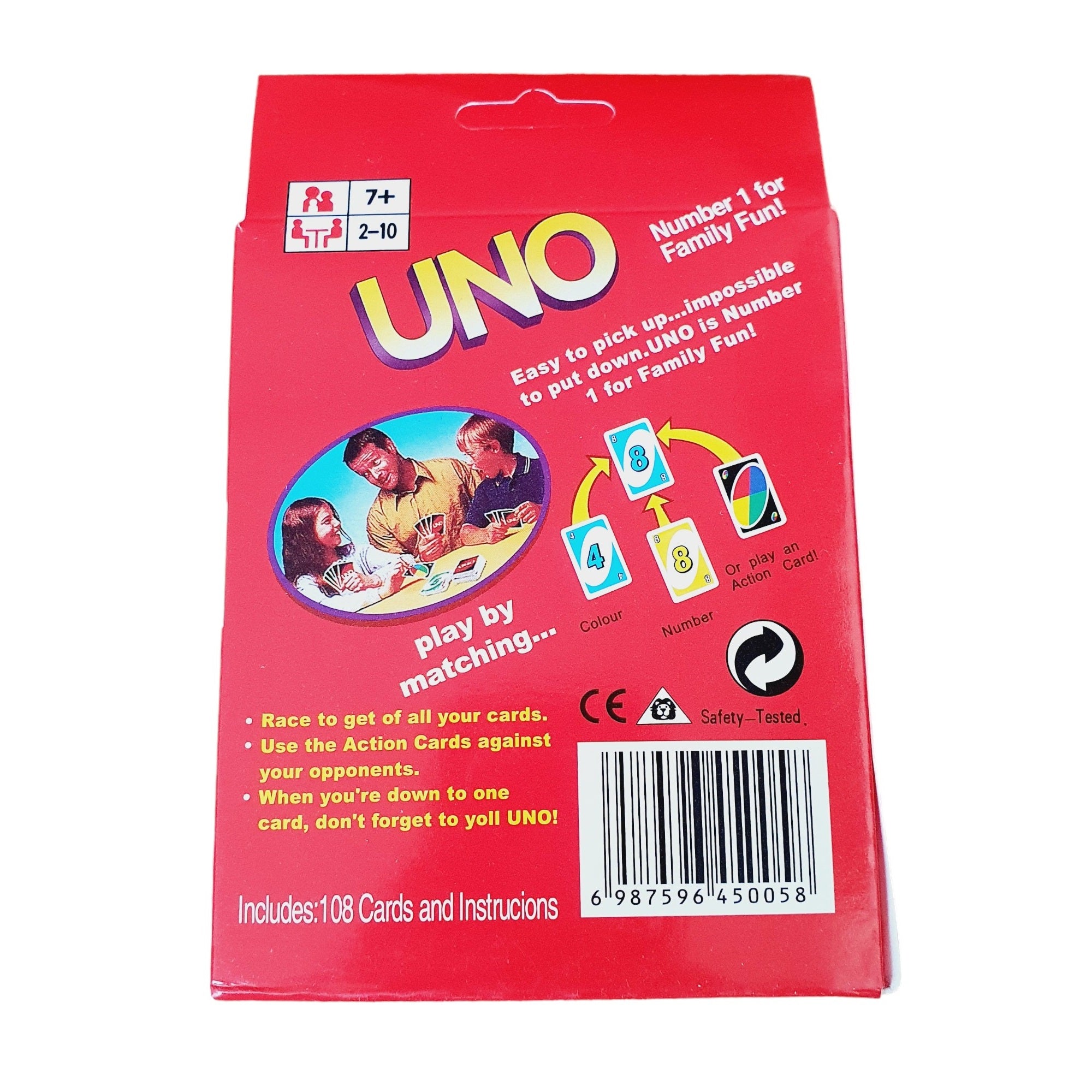 Cada jugador recibe 7 cartas y el resto se coloca boca abajo. El objetivo es deshacerse de todas las cartas coincidiendo el color o número de la carta en juego. El primer jugador en quedarse con una sola carta debe decir "UNO" en voz alta para ganar. Las cartas de acción añaden emoción, como el cambio de sentido, obligar a los jugadores a robar cartas o saltar turnos.