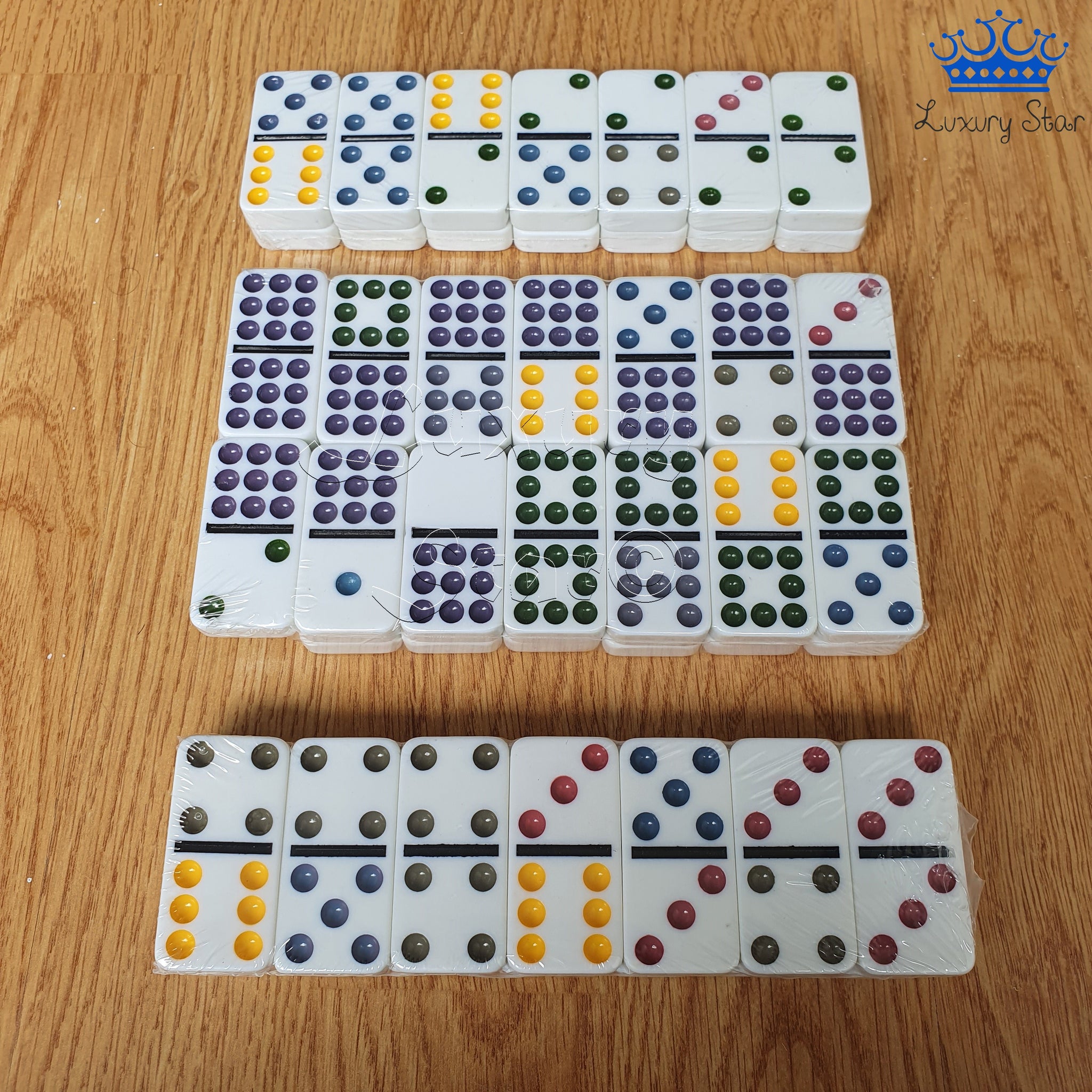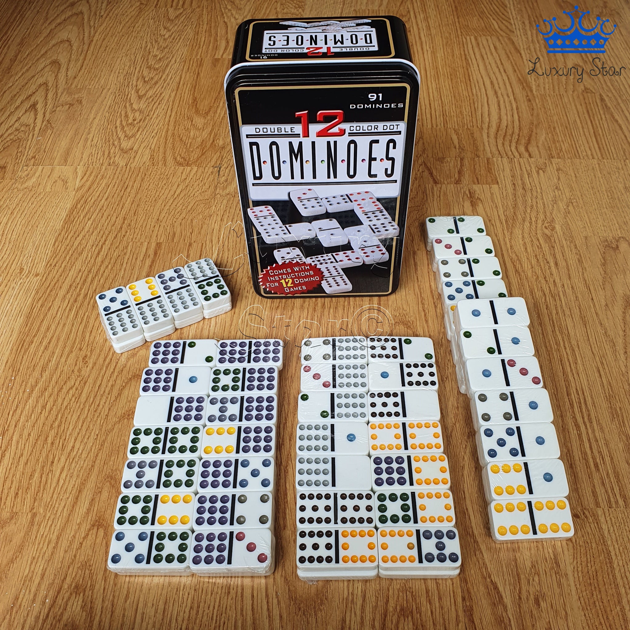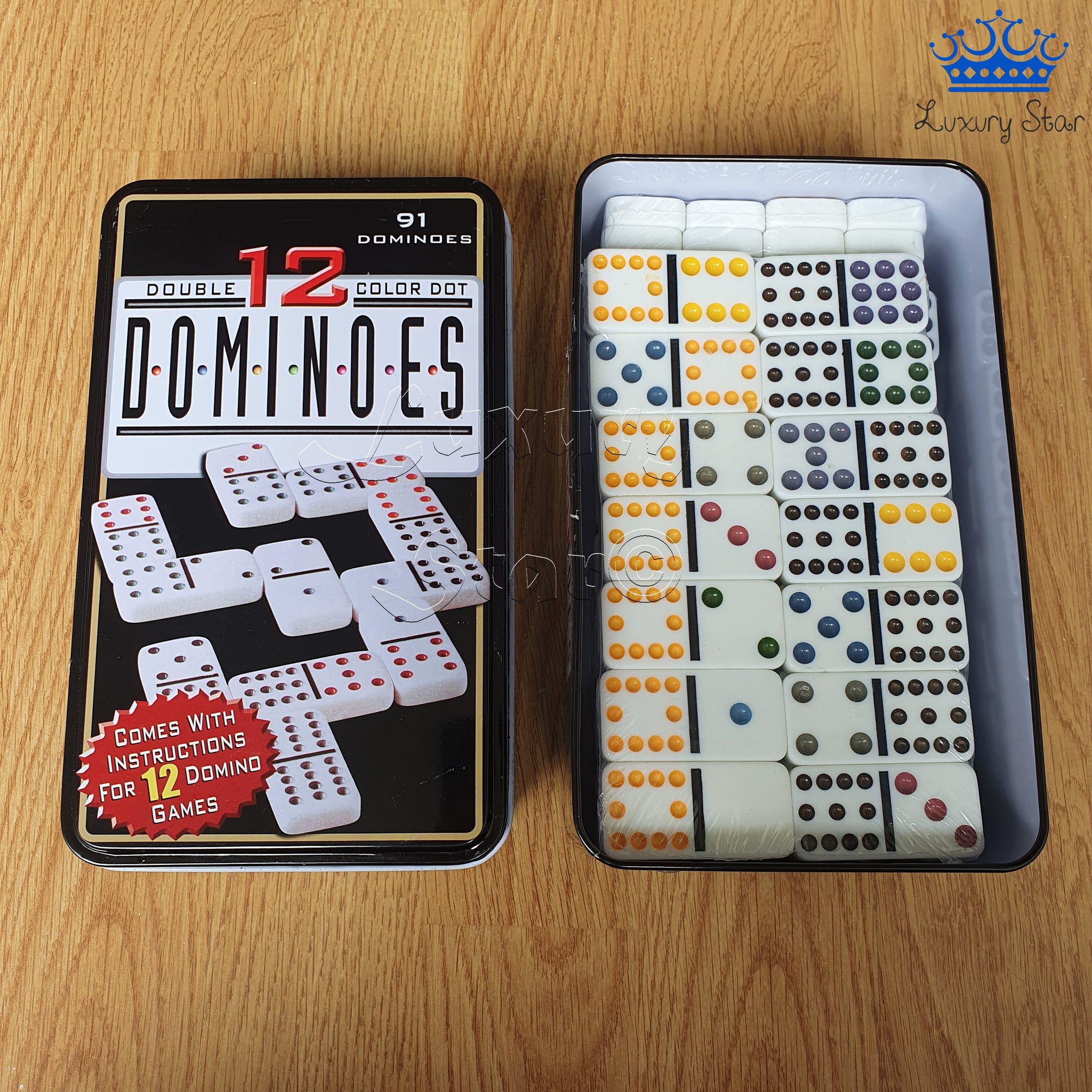 Hermoso Juego dominó de 91 Fichas con estuche metálico de fácil almacenamiento y piezas de excelentes acabados. Cada ficha esta hecha de material resistente como lo es la Melamina su color es blanco y sus puntos son multicolores.A diferencia del dominó tradicional "DOBLE SEIS", que se juega con 28 fichas, en esta modalidad se utilizan 91 fichas (49 pares y 42 impares) cuyos valores van desde el Doble Cero hasta el Doble Doce y que en total suman 1092 puntos, ideal para jugar con varias personas y aumentar la diversión.