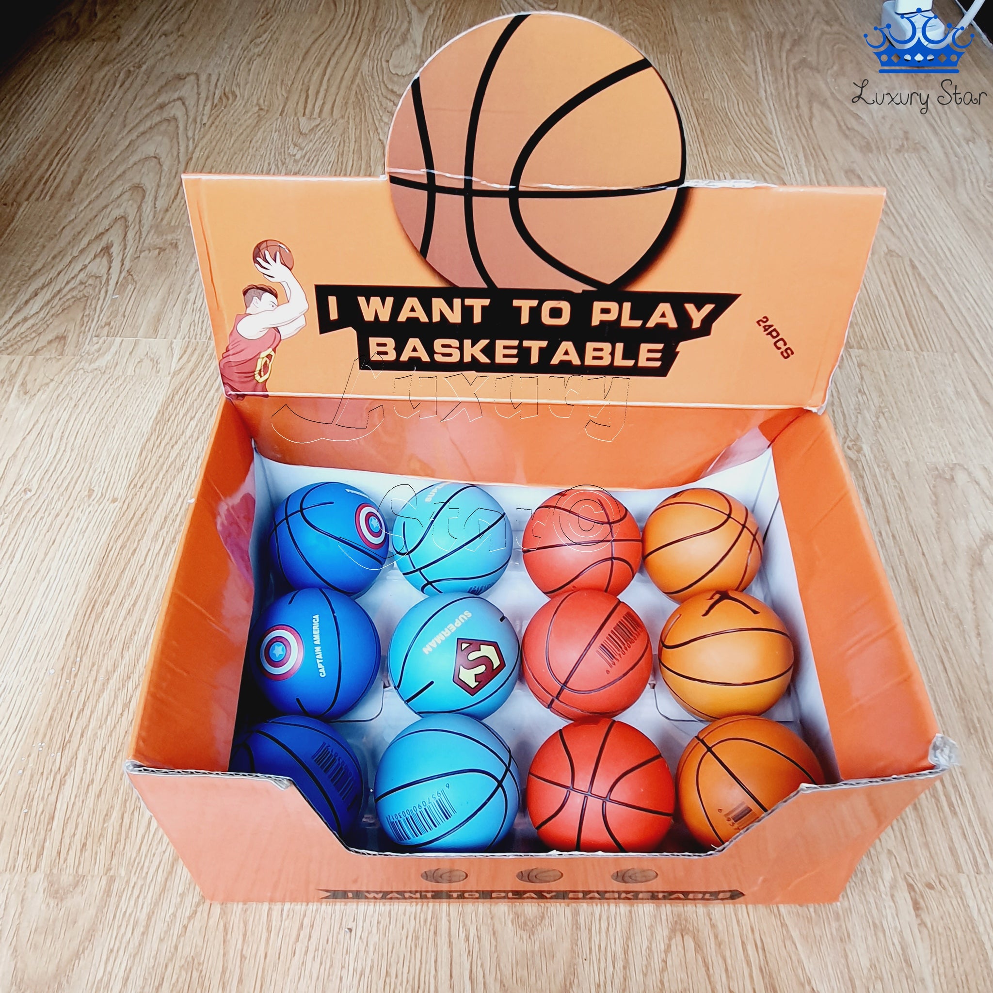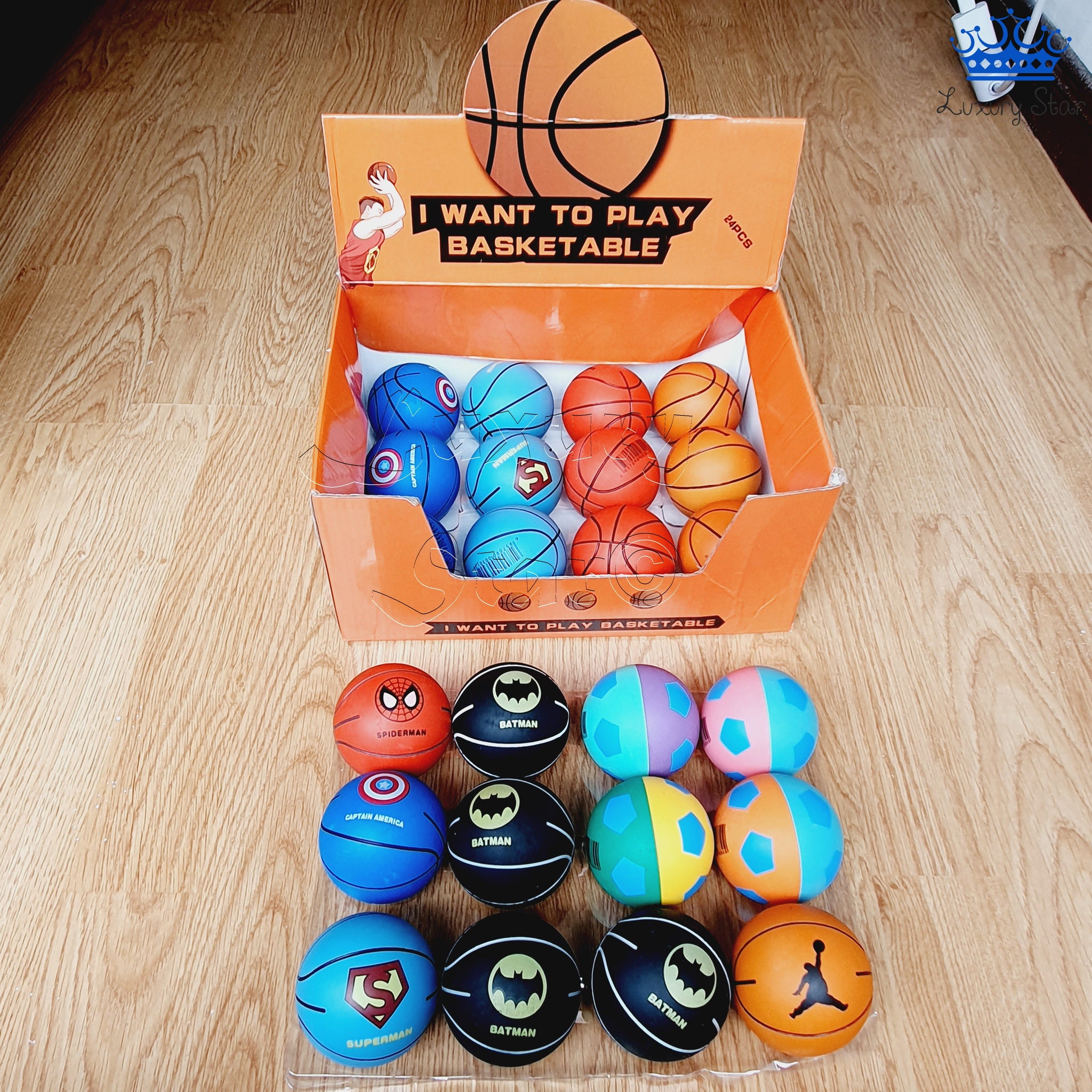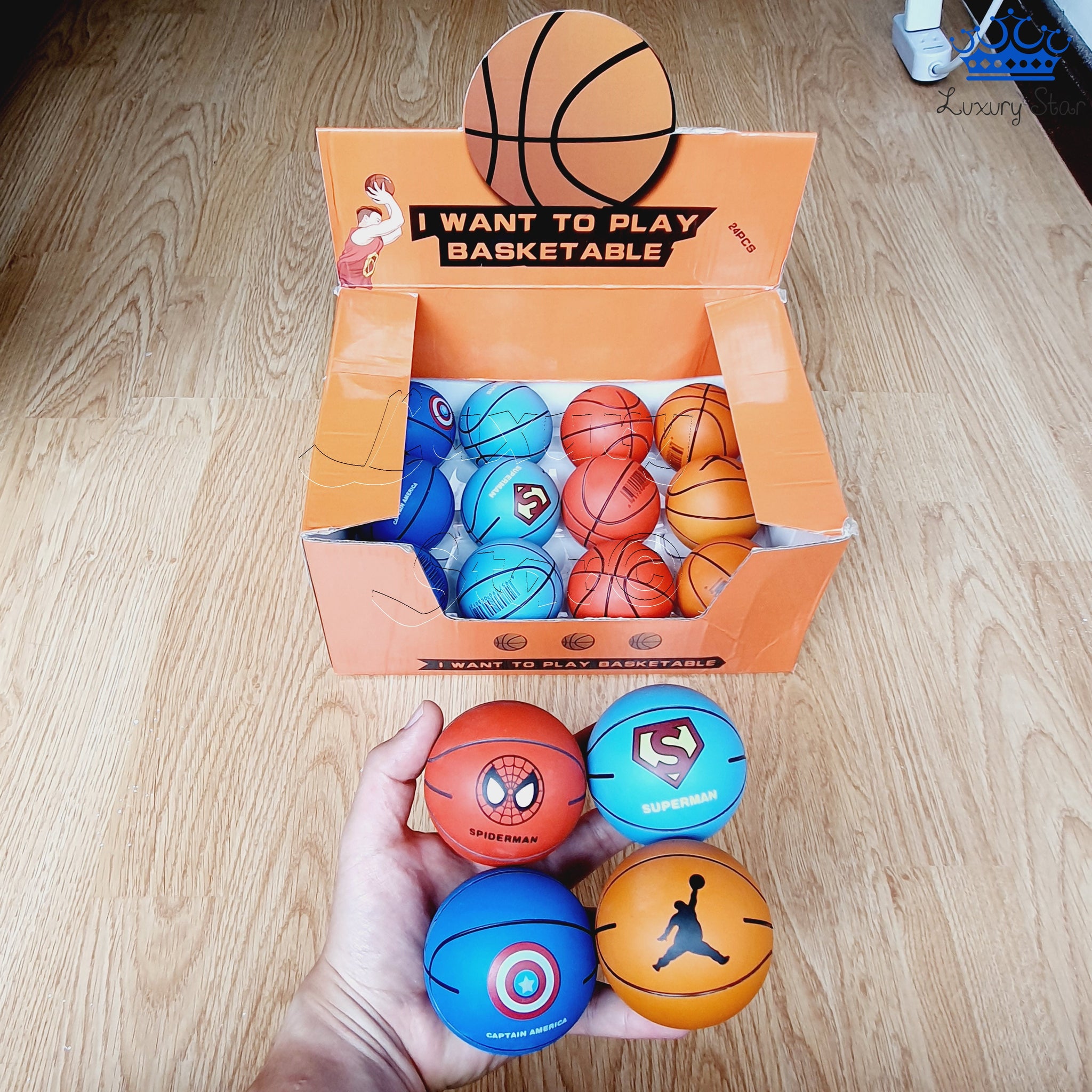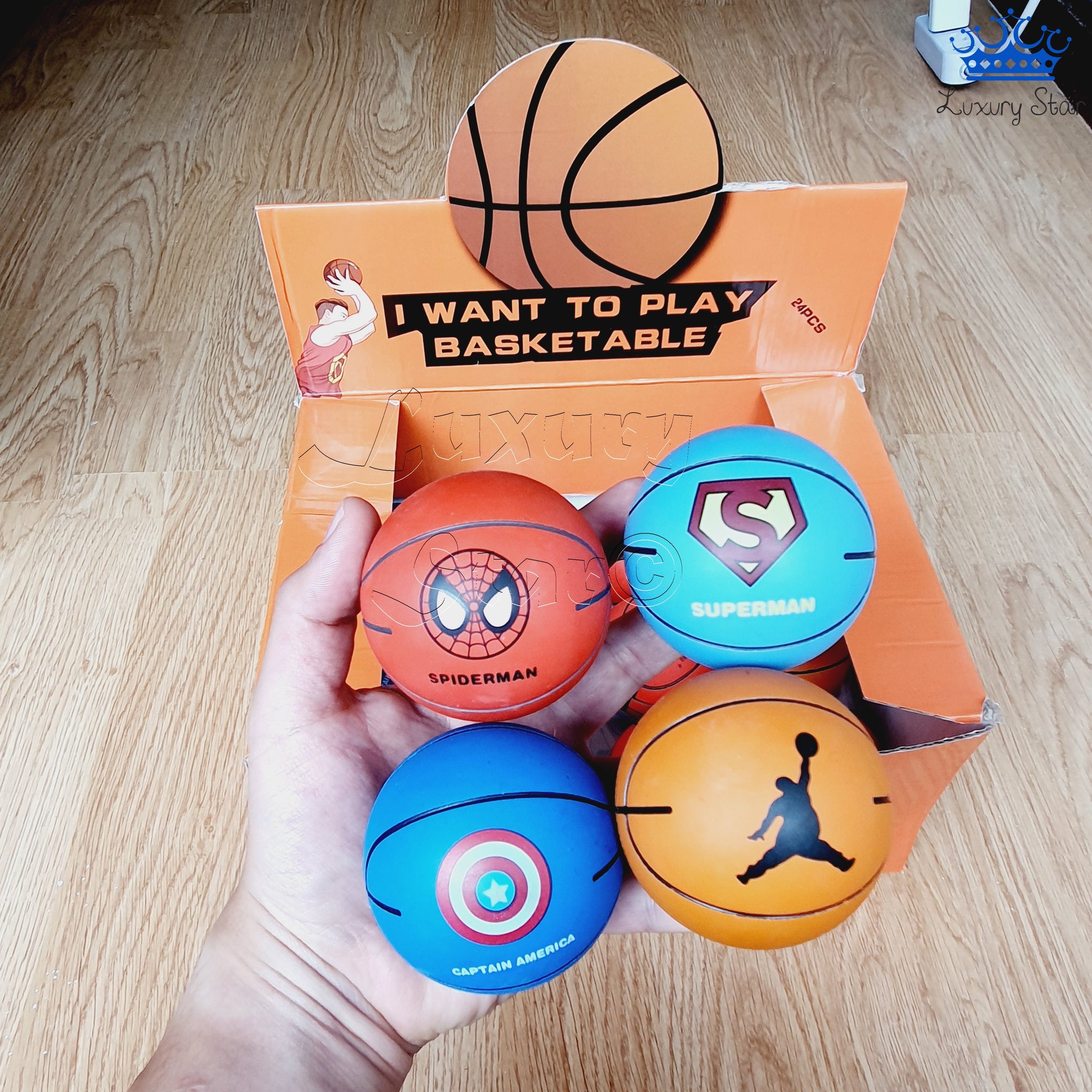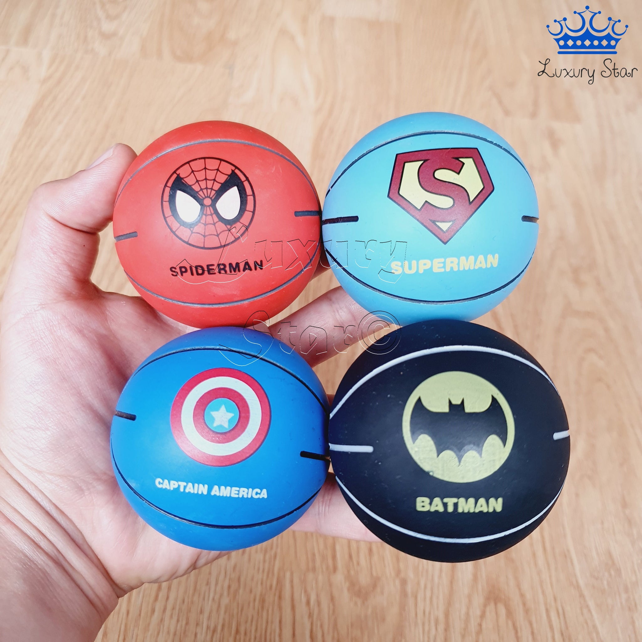 Estas pelotas de caucho son ideales para juegos y actividades lúdicas, gracias a su gran capacidad de rebote y su tamaño perfecto para ser sostenidas en una mano. Diseñadas con un estilo inspirado en pelotas de baloncesto, están disponibles en varios colores, cada uno representando a un superhéroe o estilo especial: negro para Batman, azul claro para Superman, azul oscuro para Capitán América, rojo para Spiderman, naranja como el clásico baloncesto, y versiones multicolor con números.