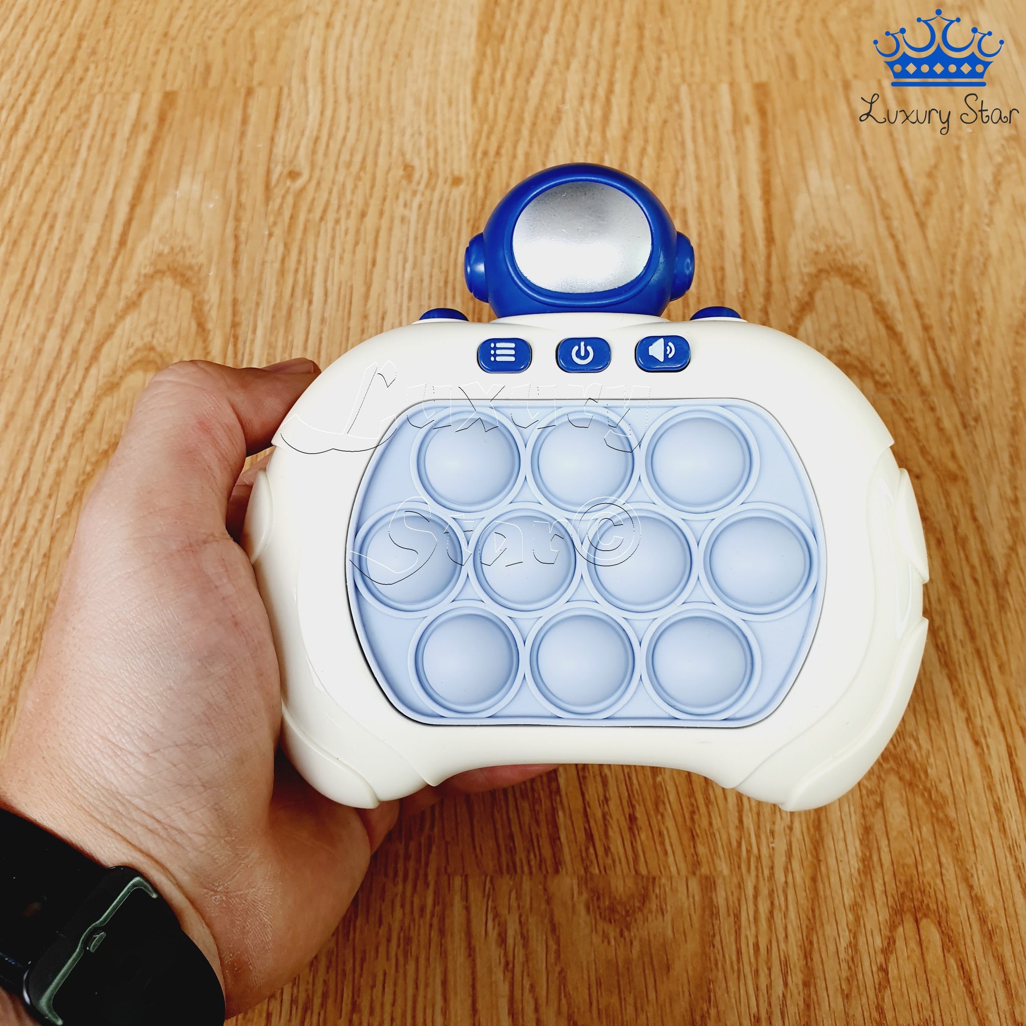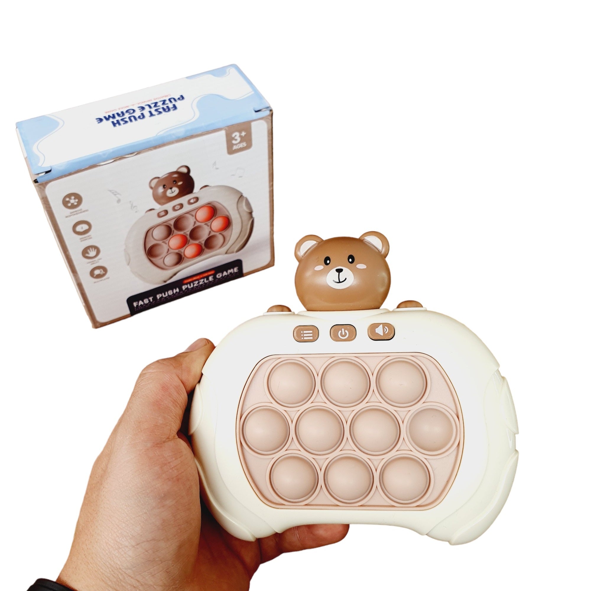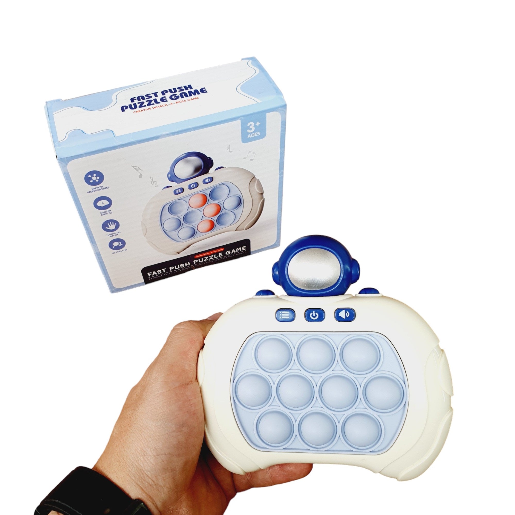 El Pop It Electrónico con figuras renueva el conocido juguete antiestrés que todos adoran. A diferencia del tablero de goma clásico lleno de burbujas, esta versión innovadora está diseñada en plástico con forma de control de videojuegos. El Pop It está incrustado en el centro y cuenta con un mecanismo de empuje en la parte trasera que automáticamente reposiciona las burbujas, eliminando la necesidad de ajustarlas manualmente. Funciona con 3 pilas AAA (no incluidas) y dispone de tres botones para ajustar los modos de juego, encendido/apagado y volumen, además de incorporar música y sonidos para enriquecer la experiencia.