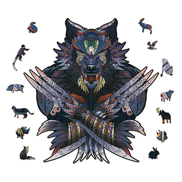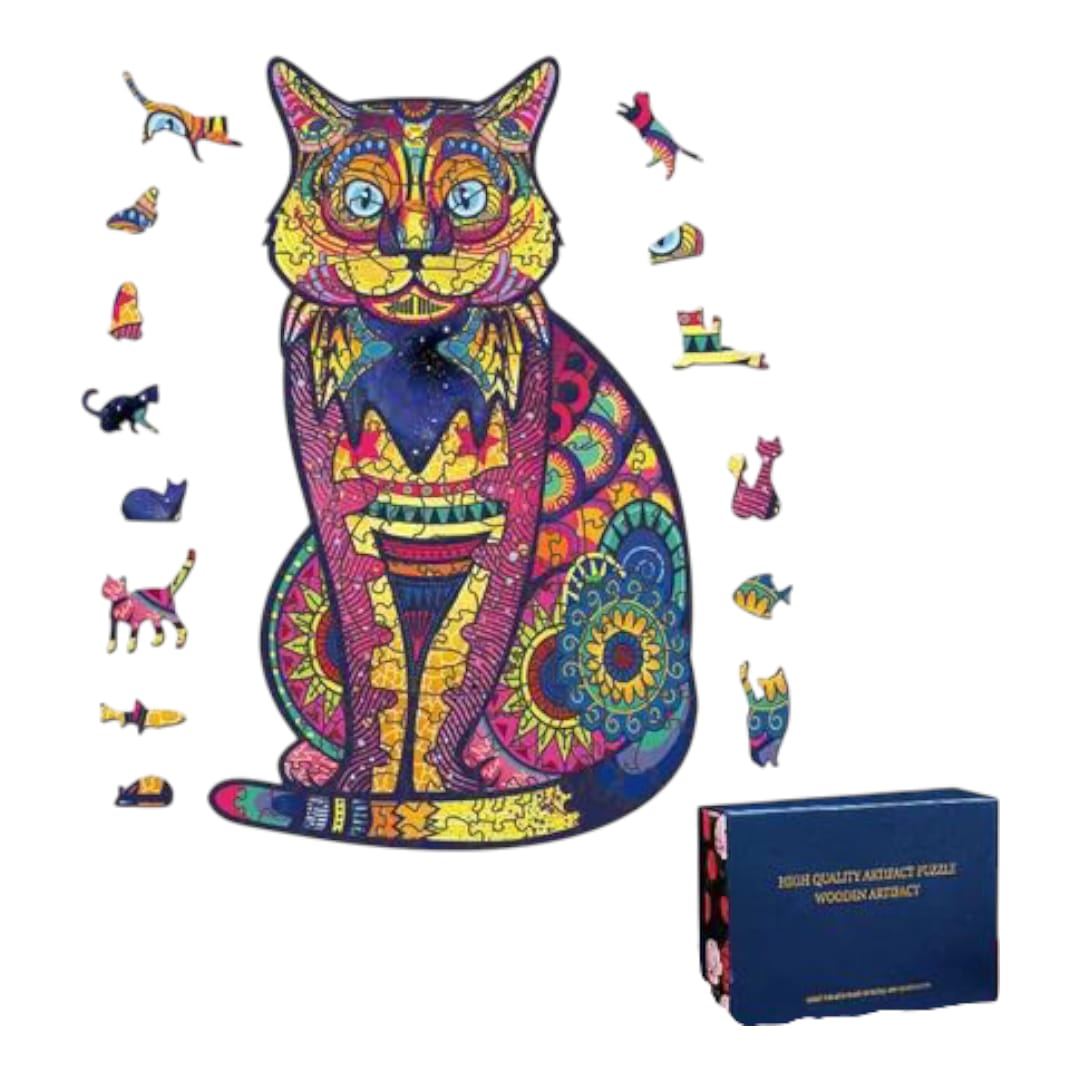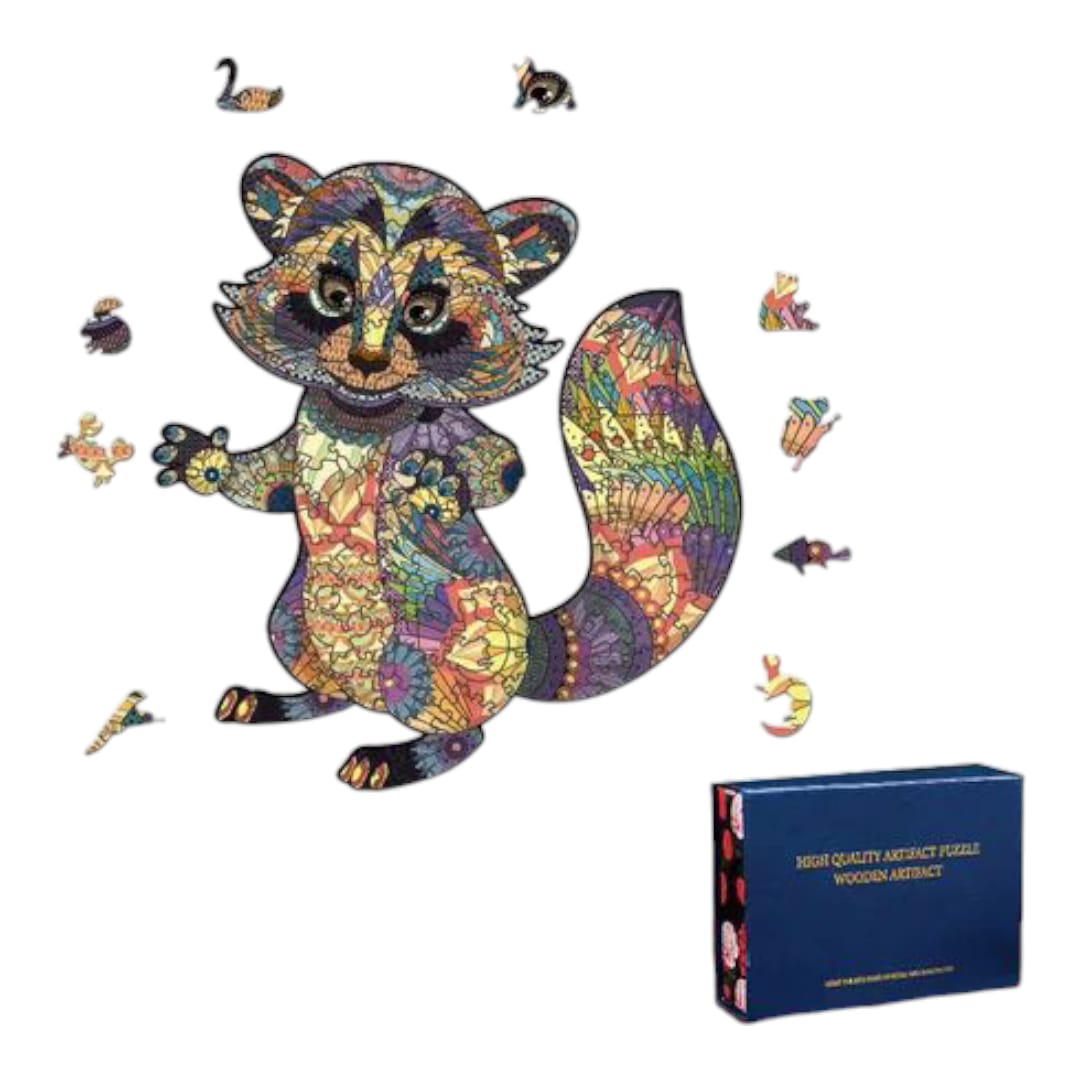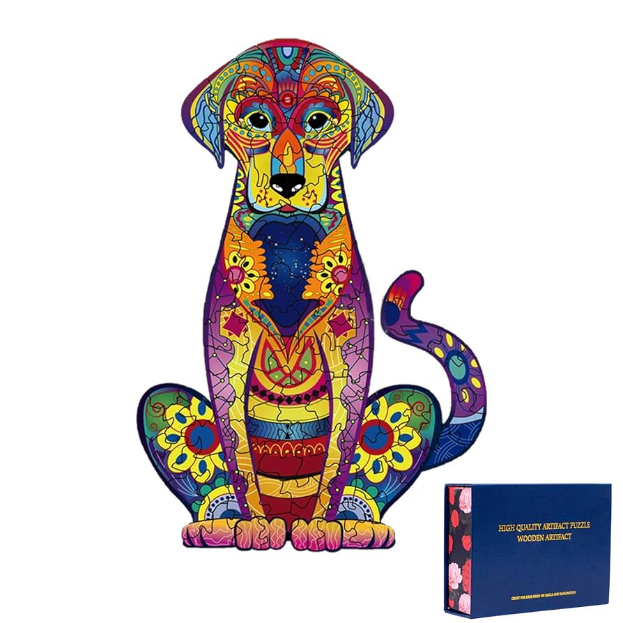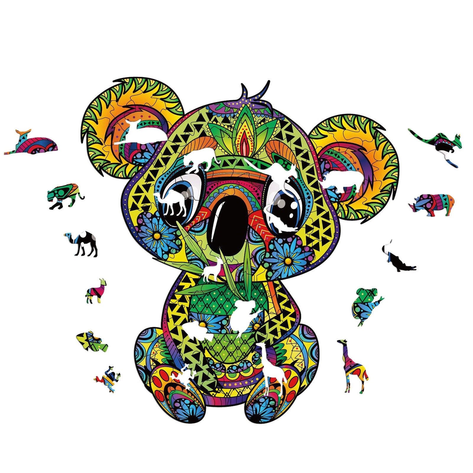 Rompecabezas artístico de madera con formas de animales y piezas coloridas. Ideal para niños y adultos.