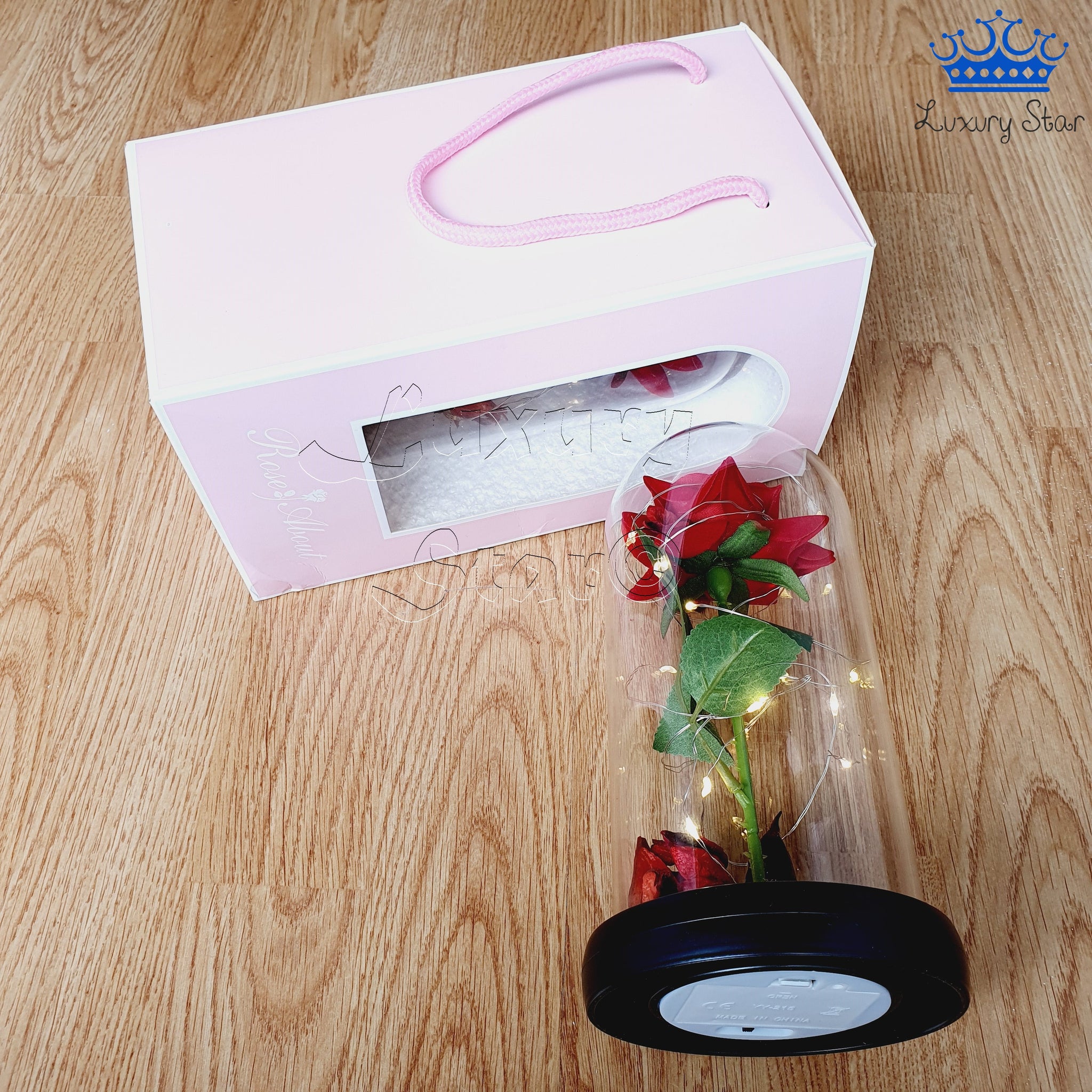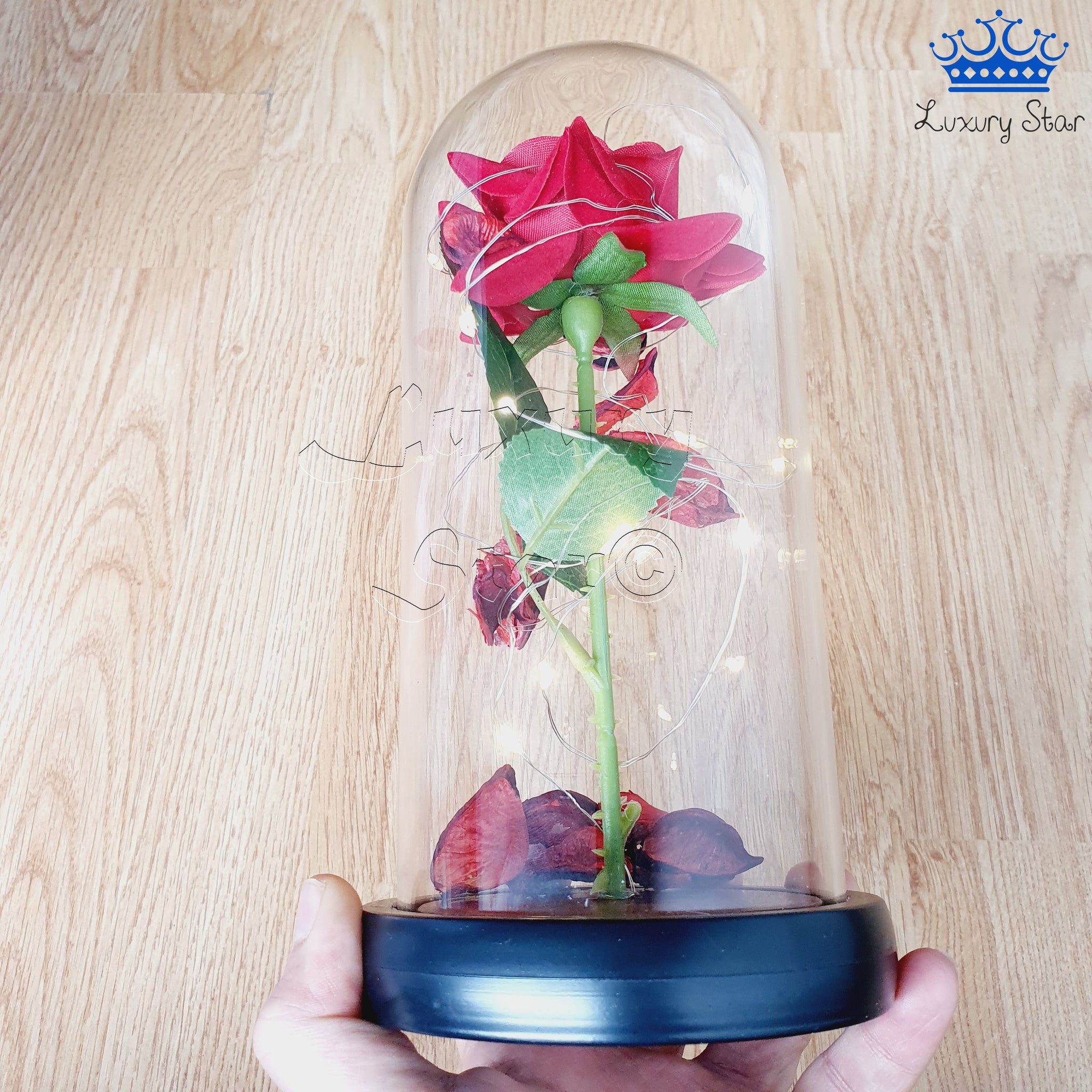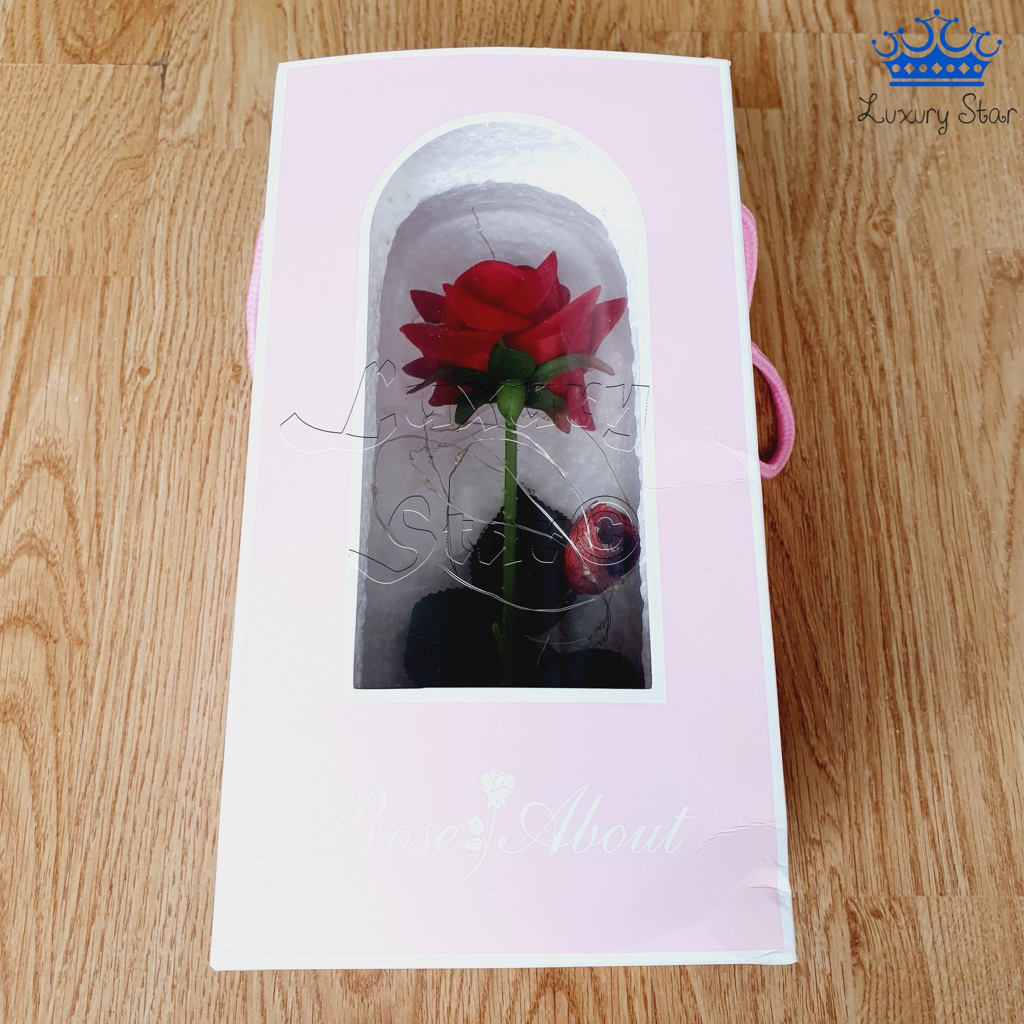 En su base incluye pétalos secos que simulan los caídos de la flor, aportando un toque natural y decorativo. La rosa está protegida por una cúpula de vidrio sobre una base de plástico negra. En su interior, un fino cableado con luces LED envuelve la rosa, iluminándola suavemente y creando un efecto visual encantador, especialmente en la noche.