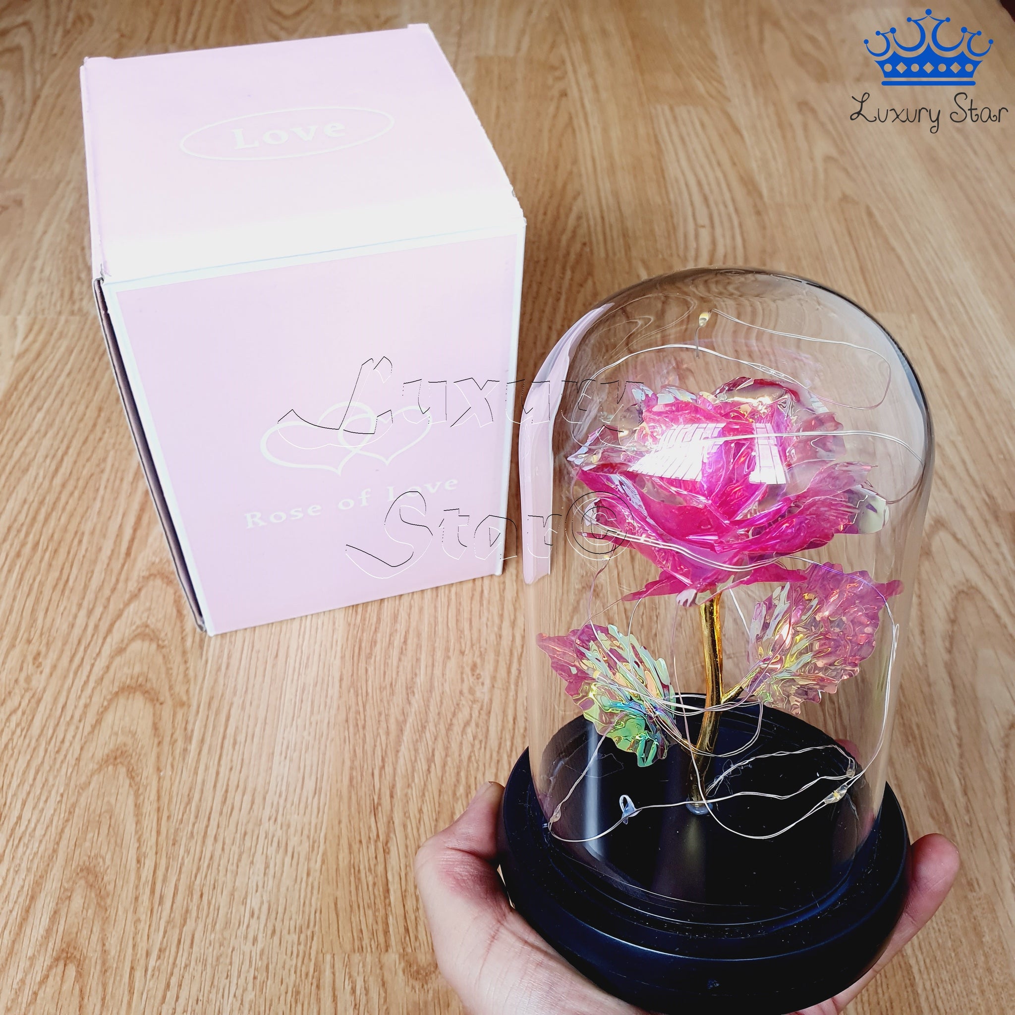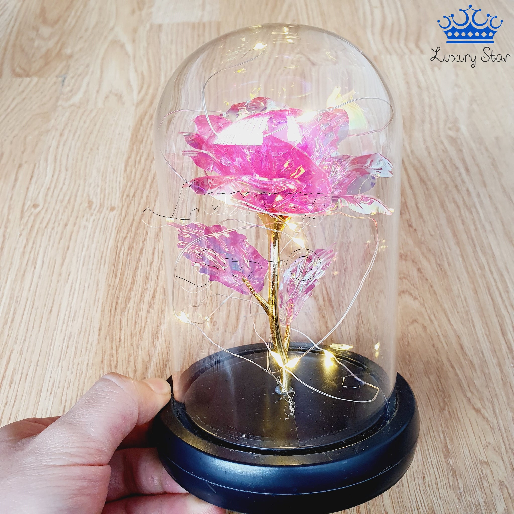 La rosa está protegida por una cúpula de vidrio transparente, montada sobre una base plástica de color negro. En su interior, una fina guirnalda de luces LED recorre el tallo, iluminando la flor desde dentro y creando un efecto cálido y decorativo.
