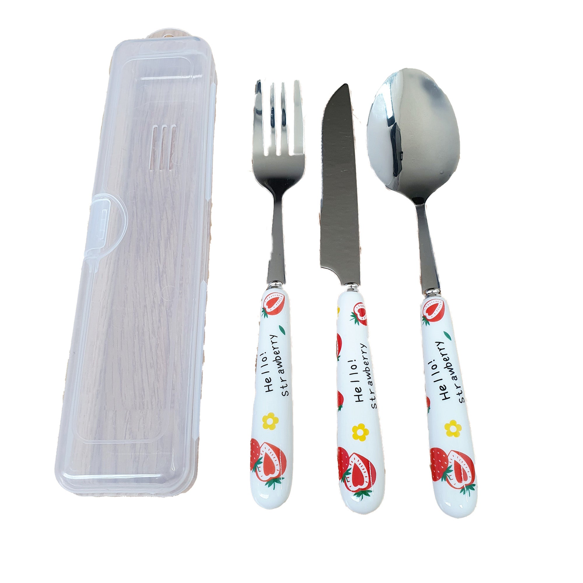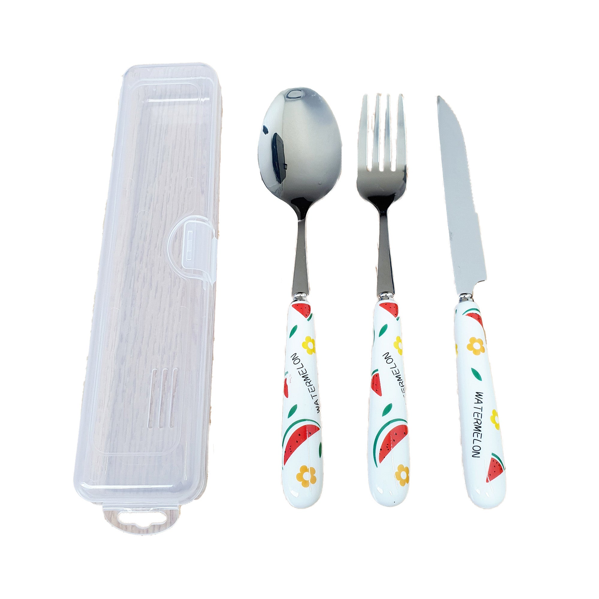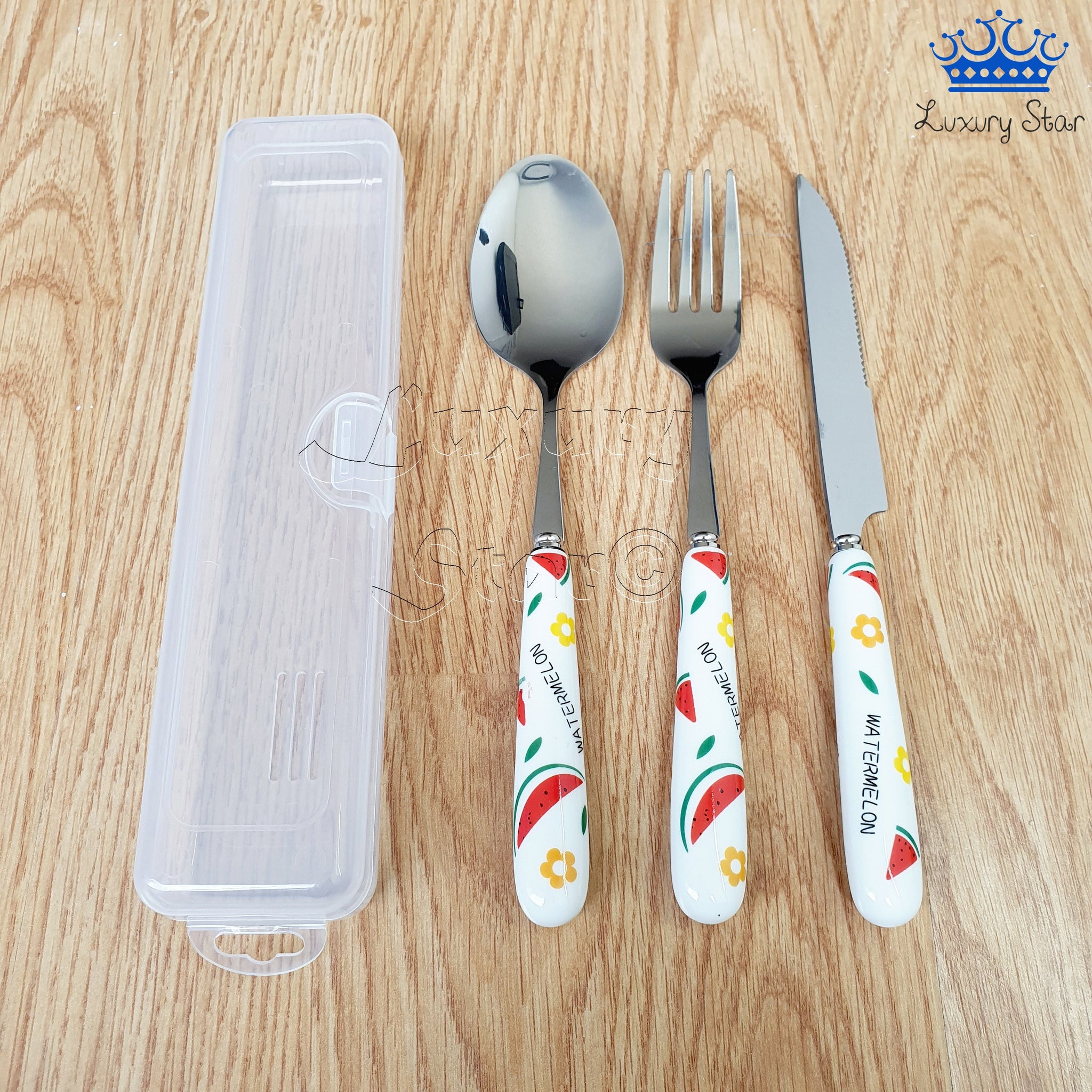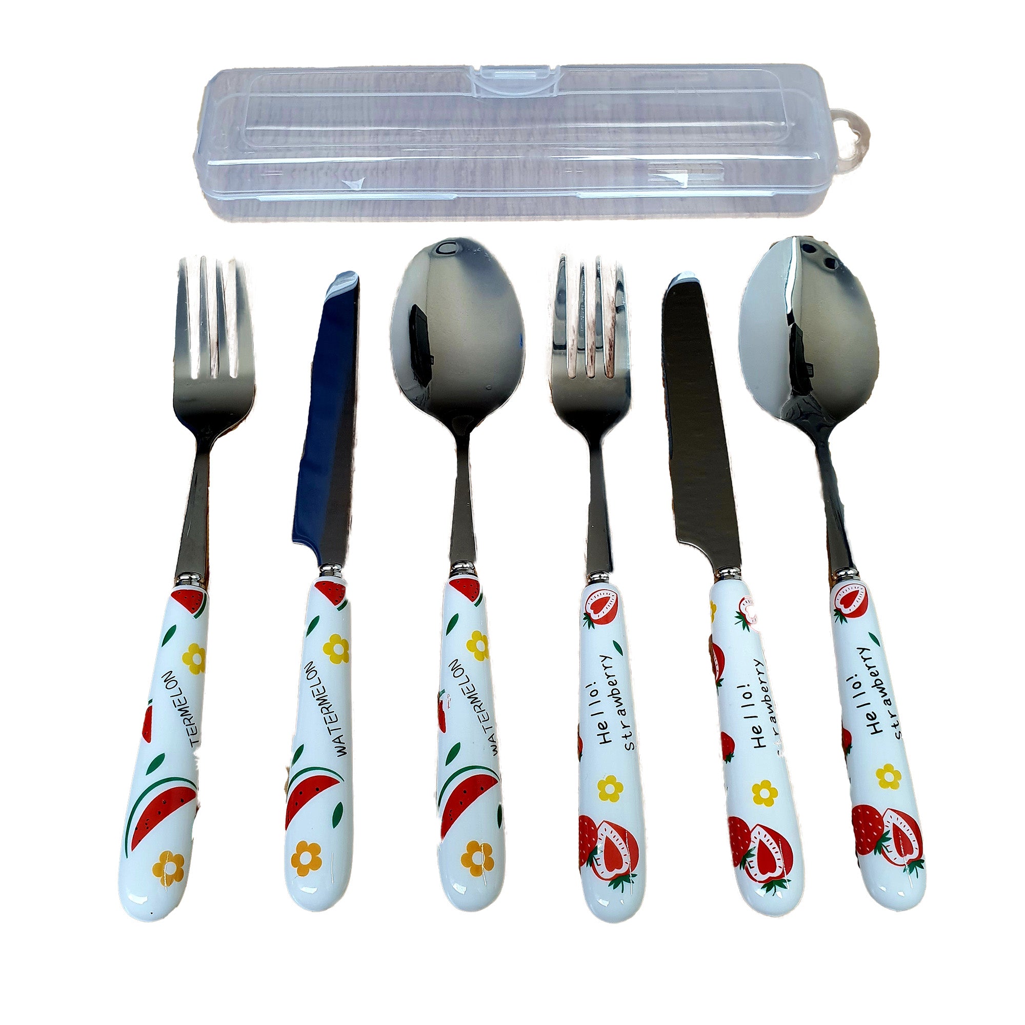 Hermoso set de cubiertos x3 con un bonito diseño de figuras de frutas y un acabado en fondo blanco. Incluye un tenedor, una cuchara y un cuchillo dentado hechos en acero inoxidable, el mango esta elaborado en plástico de alta calidad.