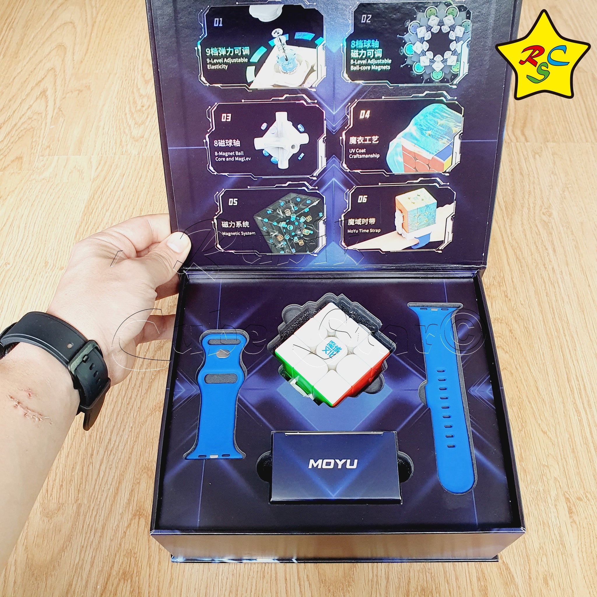 Moyu ha querido innovar con un ajuste adicional y es la posibilidad de ajustar la fuerza de los imanes que van de las esquinas hacia el ncleo del cubo, con 8 opciones diferentes de ajuste para más personalización, tambien nos incluye una base para el cubo muy particular ya que se le pueden colocar manillas de reloj para llevar el cubo en la mano a modo de pulsera, incluye folleto fridrich y herramienta de ajustes que en esta ocasión tambien es algo novedoso ya que es en forma de cruz donde viene incorporado el destornillador con las llaves de ajustes de tensión y fuerza de los imanes.