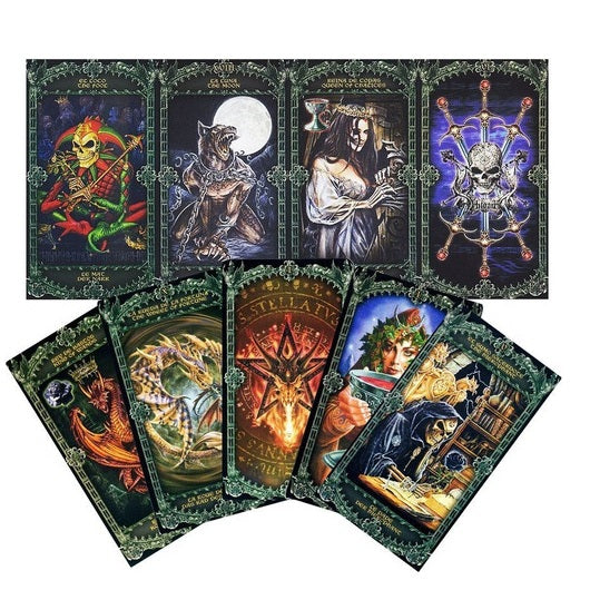 Las cartas en la parte superior poseen su número en romanos, en el medio la ilustración (calaveras, pentáculos, copas, dragon, entre otros), en la parte inferior el nombre de la carta y en su dorso muestra varios cráneos muy siniestros y llamativos con símbolos de los planetas. El Tarot está impreso en papel laminado estucado exclusivo, bañado en barniz acuoso de alta durabilidad, las ilustraciones de los arcanos son muy llamativas, contando